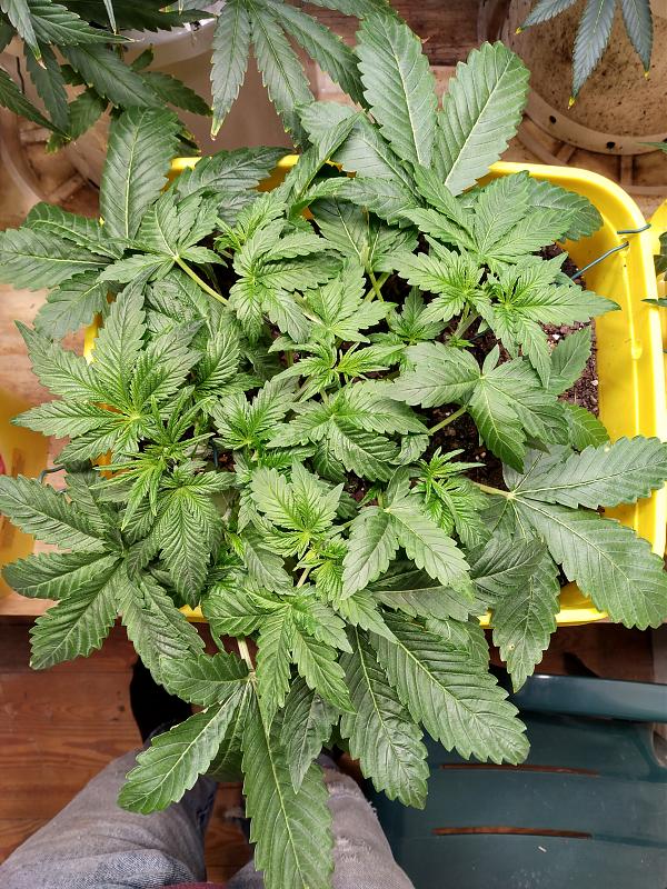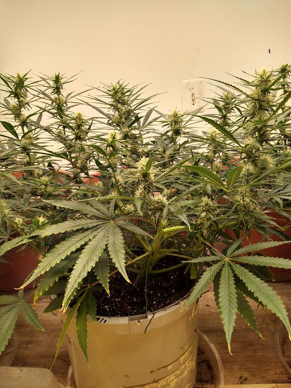 Figured I would make a page for this one. This is one of my crosses I did while doing a review for a reversing spray earlier this year. The strain I reversed was scarlet sunset from now defunct Gas Reaper genetics. The momma was Double Grape from Mephisto genetics. Loved the cherry cough drop smell and taste of scarlet and the Uber frostiness of double grape. Scarlet wasn't no slouch on the frost factor either. Anyhow we are at day 44 for her. She is finishing stretch and beginning to frost up. Like all the way to the end of the sugar leaves frost. Showing her sativa side but the buds are nicely spaced. She is in a 5 gallon bucket with bottom third compost out of my bin and top two thirds miracle grow organics with 2/3 cup of dolomite lime added. Got some tip burn when she reached the compost. I do pH my water because it's well water and usually runs 5.25-6 so I bring it up to 6.5 with GH ph up.