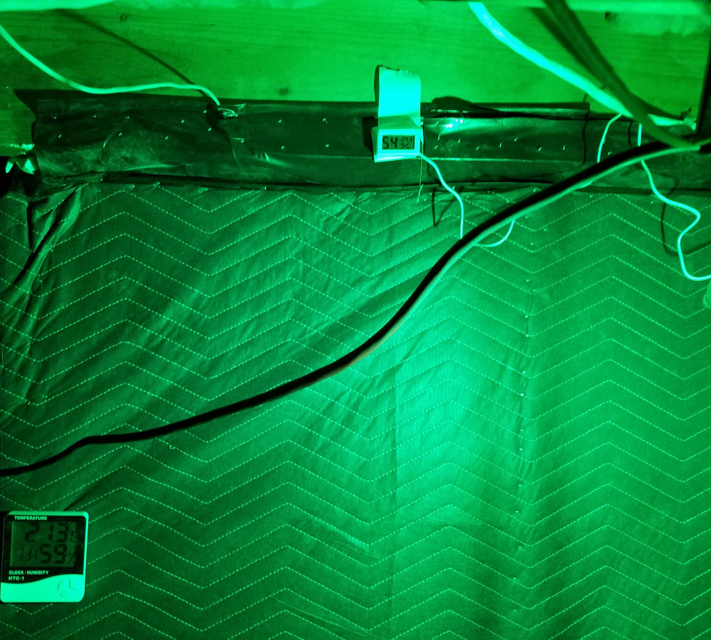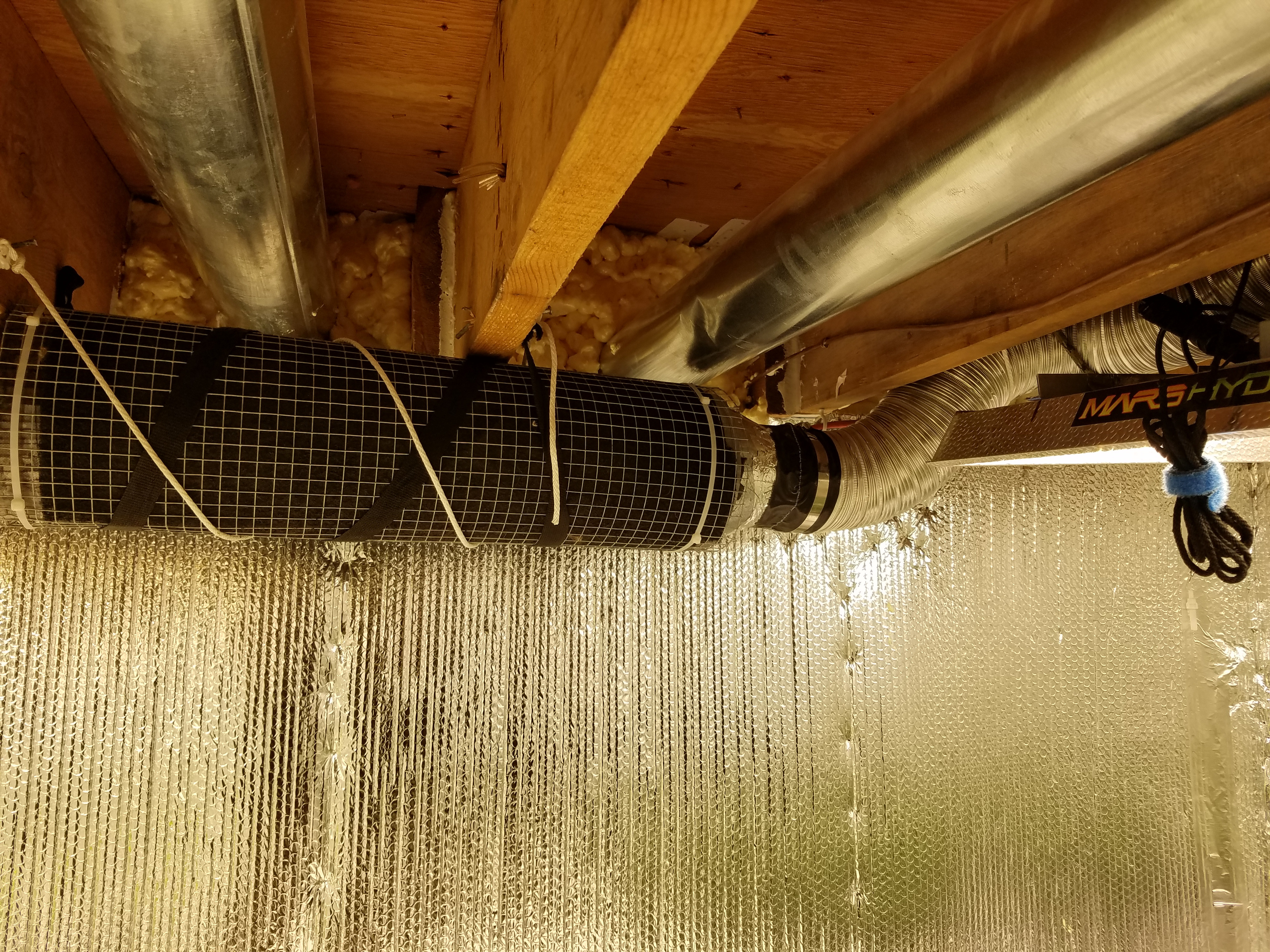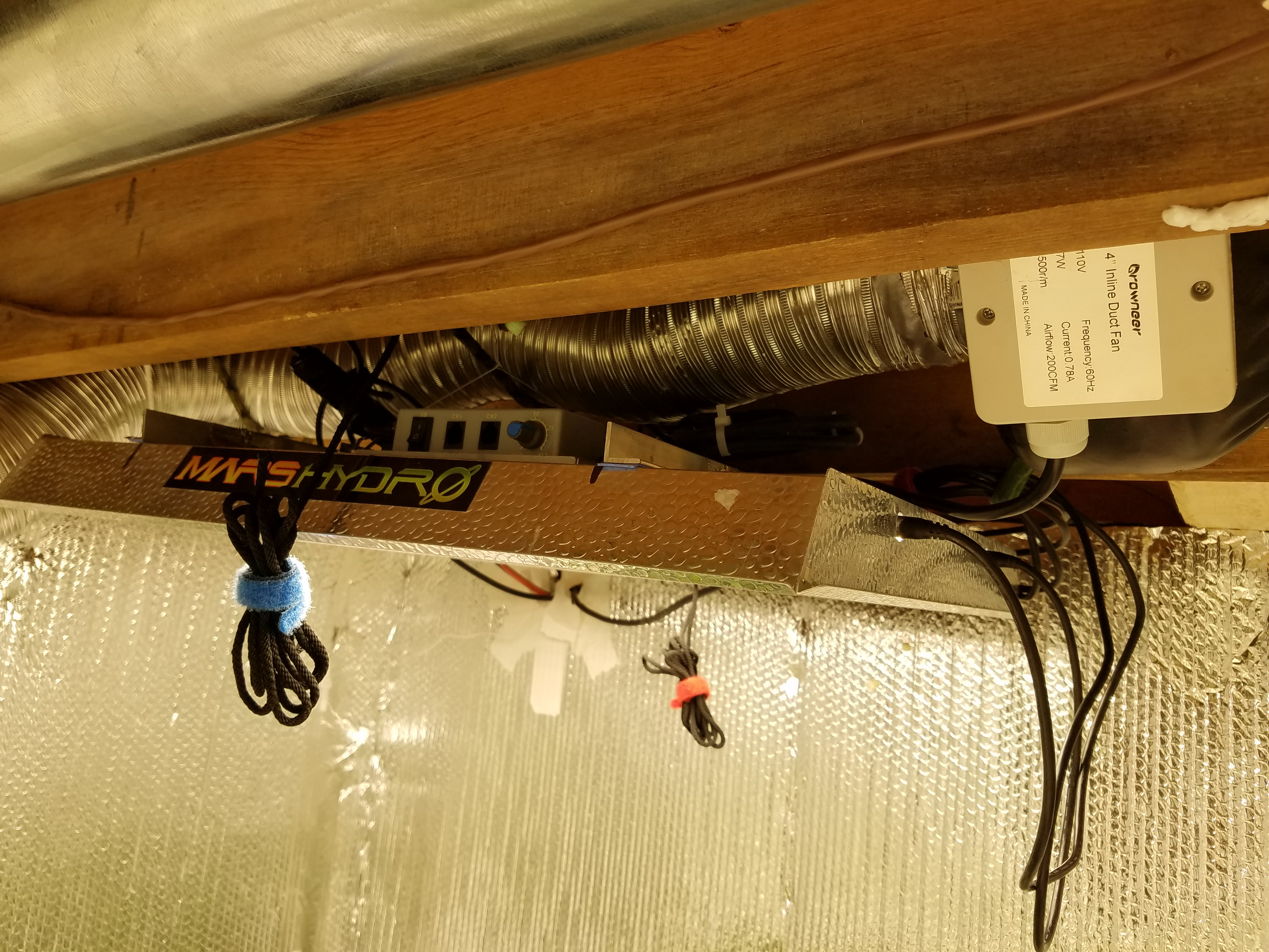 These pics are a few days old... So the carbon filter was moved out of the joist to promote better air exchange...Heat is ok so far, but the mars is only at 75% while the diy cobb fixture is just under 300w. Since the plants have grown I have noticed a potential issue with humidity, enough to have me thinking and planning..Hopefully the outside temps will stay below freezing, but this weather has been a roller coaster and the warmer then usual temps will return to seasonal in the next week or so we shall see how they effect the humidity inside...