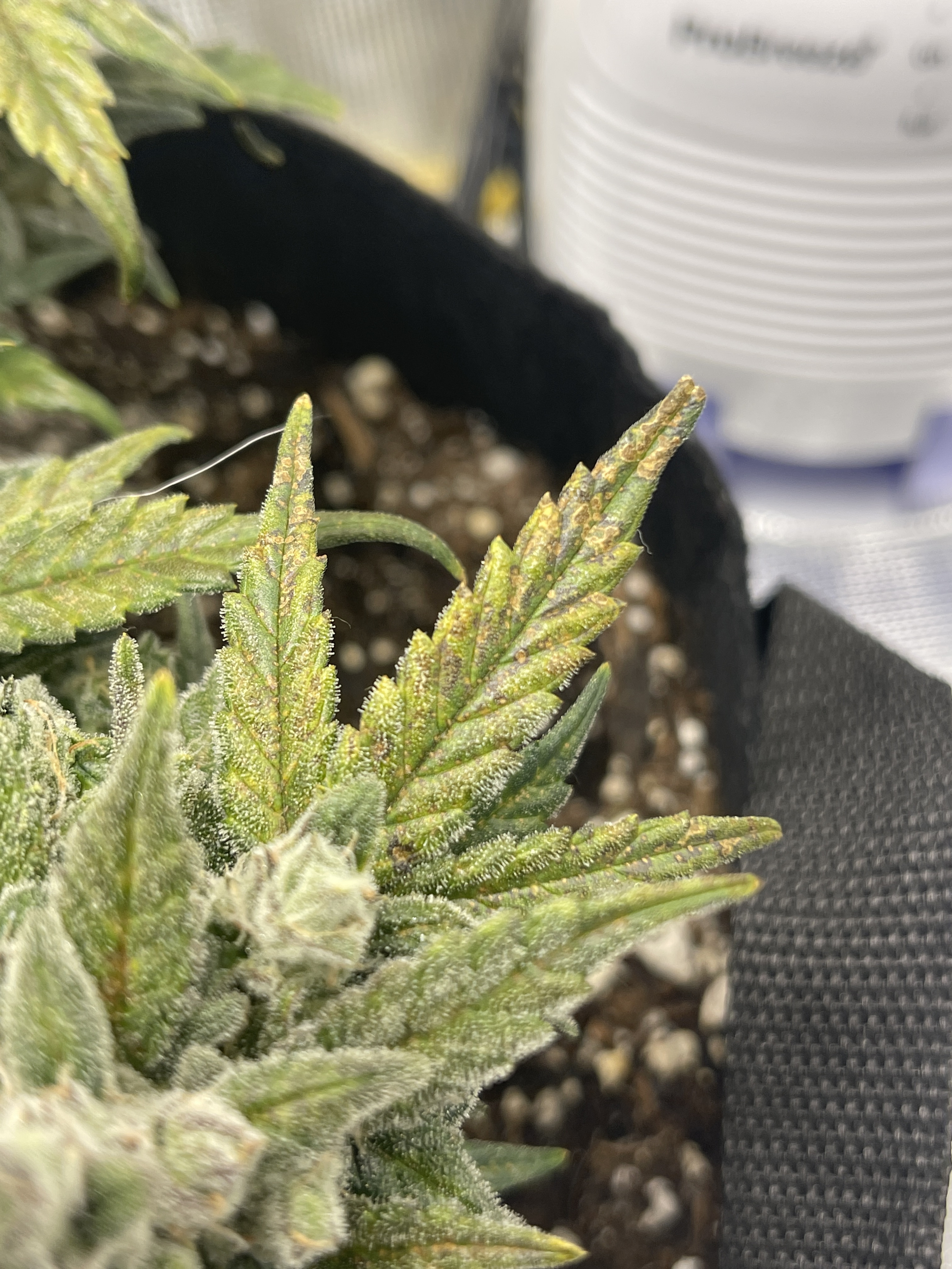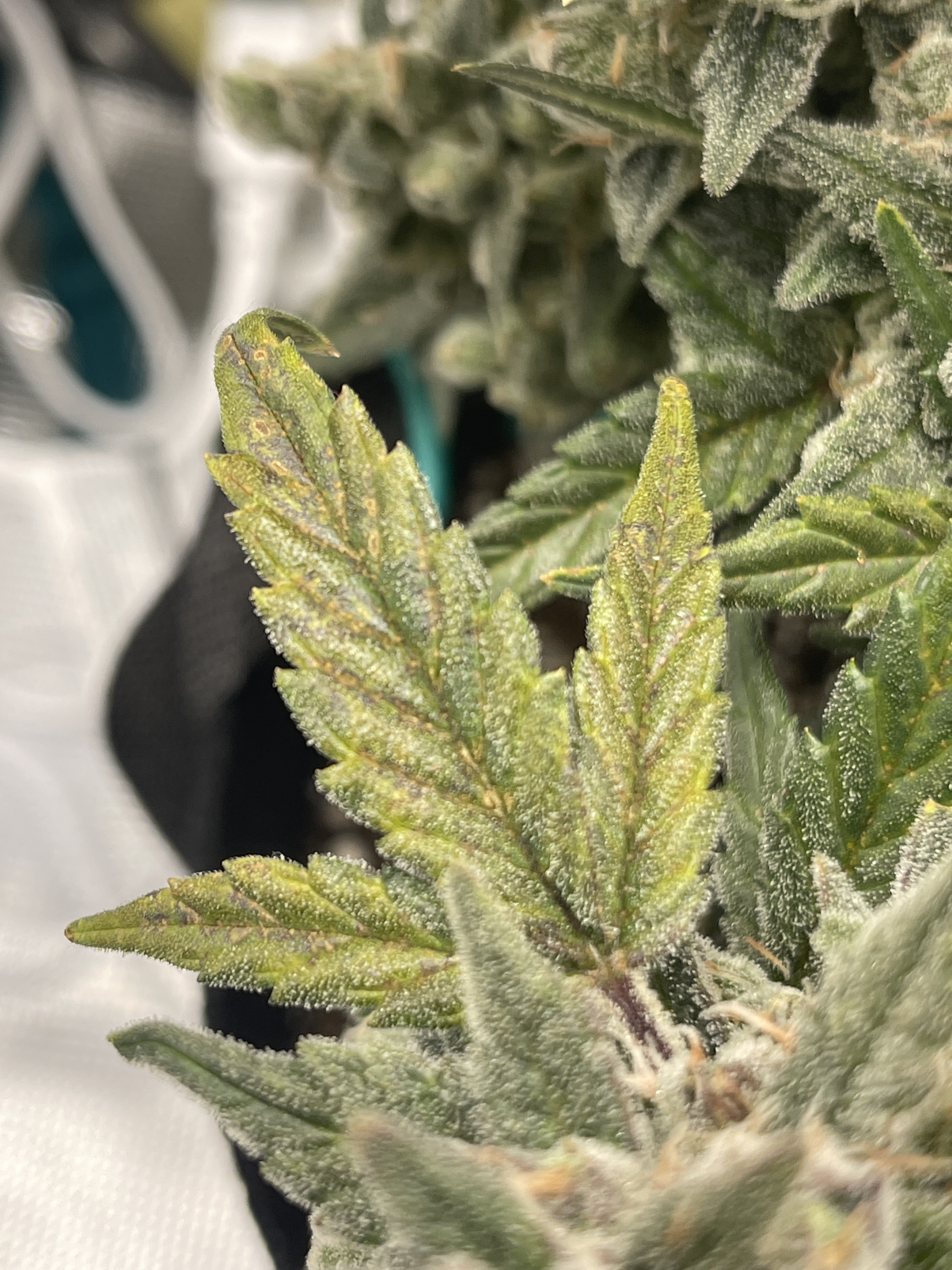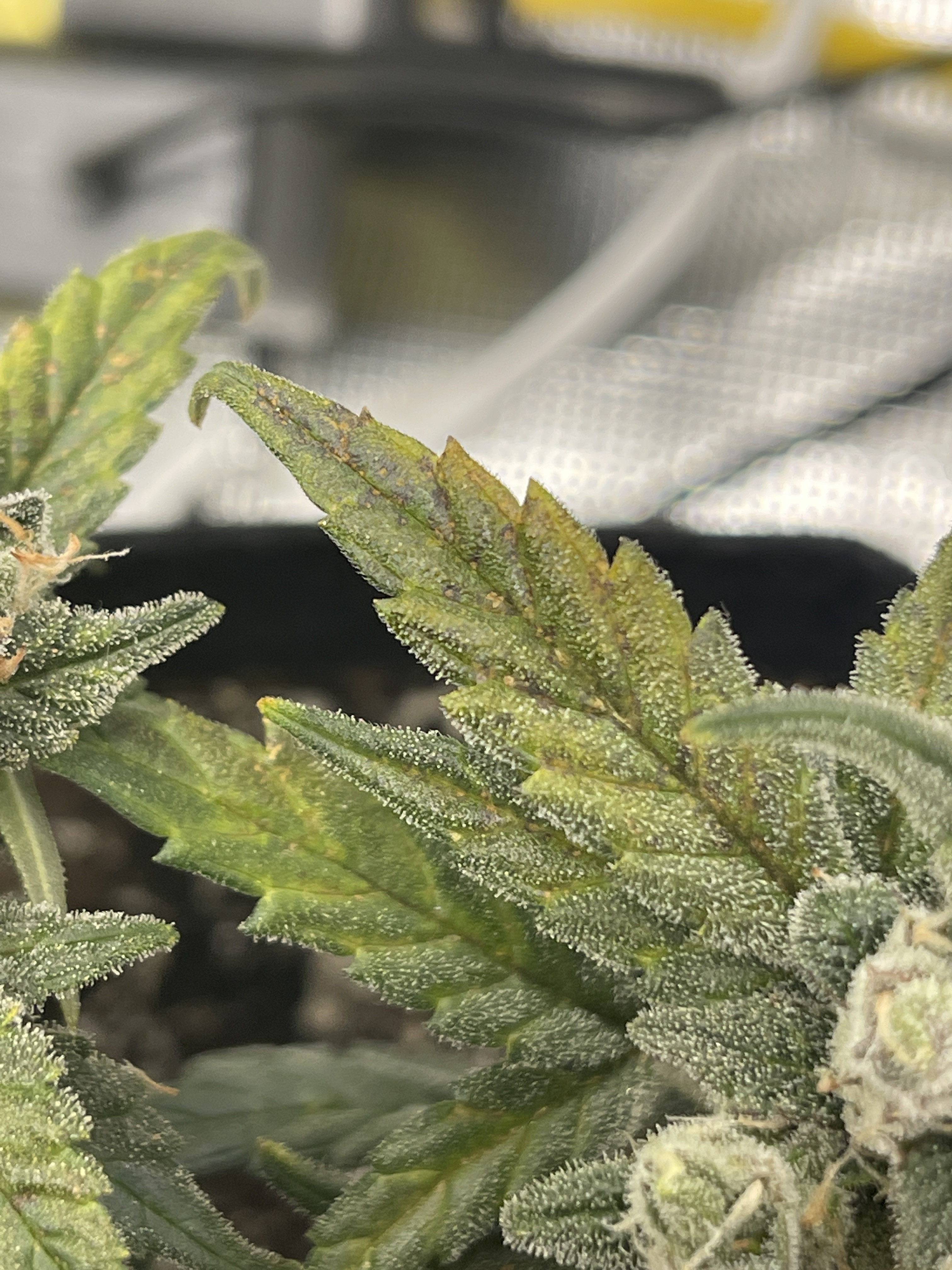 I believe the spots are a stereotypical calcium deficiency. Add additional Cal Mag, it won't harm your plant. You are so close to harvest, I wouldn't worry about it. Beautiful pics!Current Grow: 2 Acapulco Gold, 2 Summer Lemons