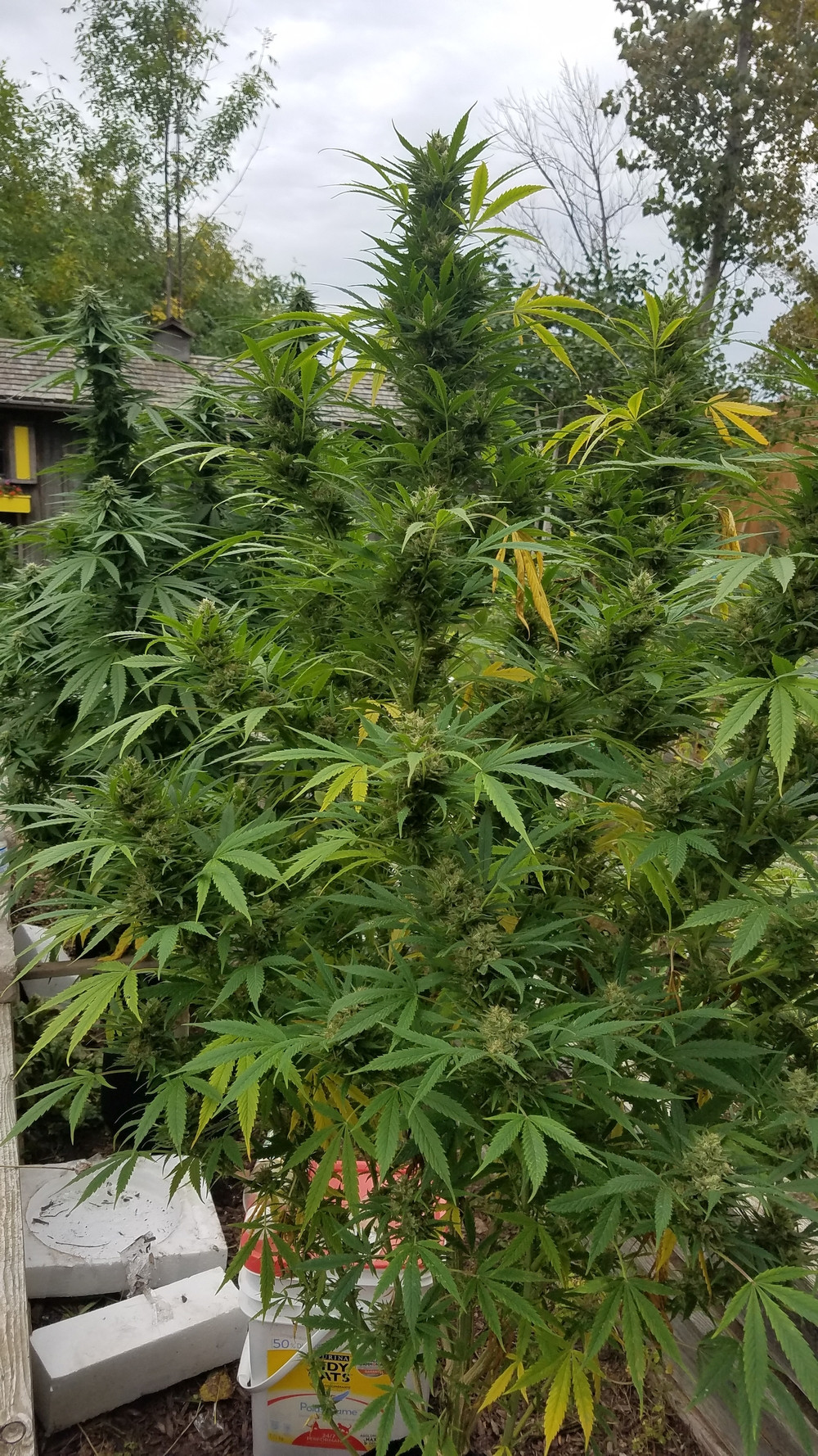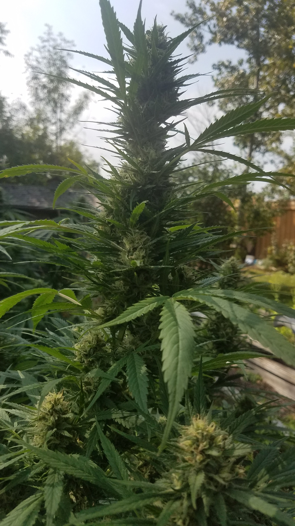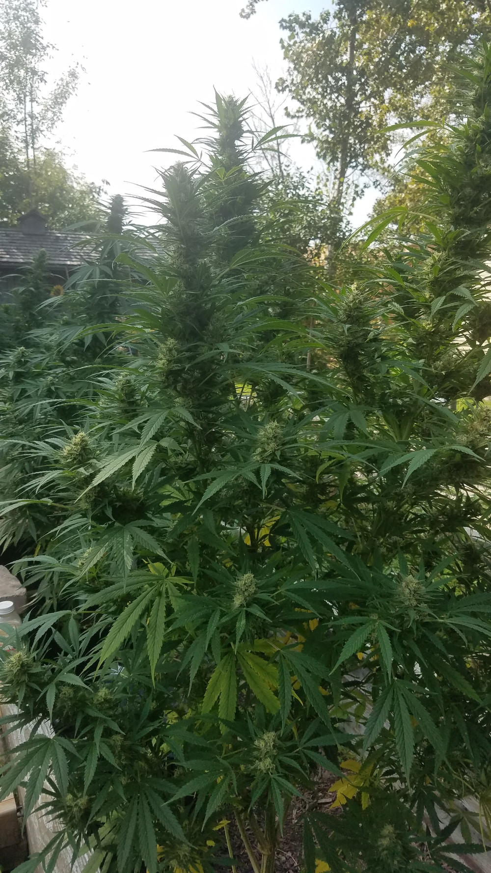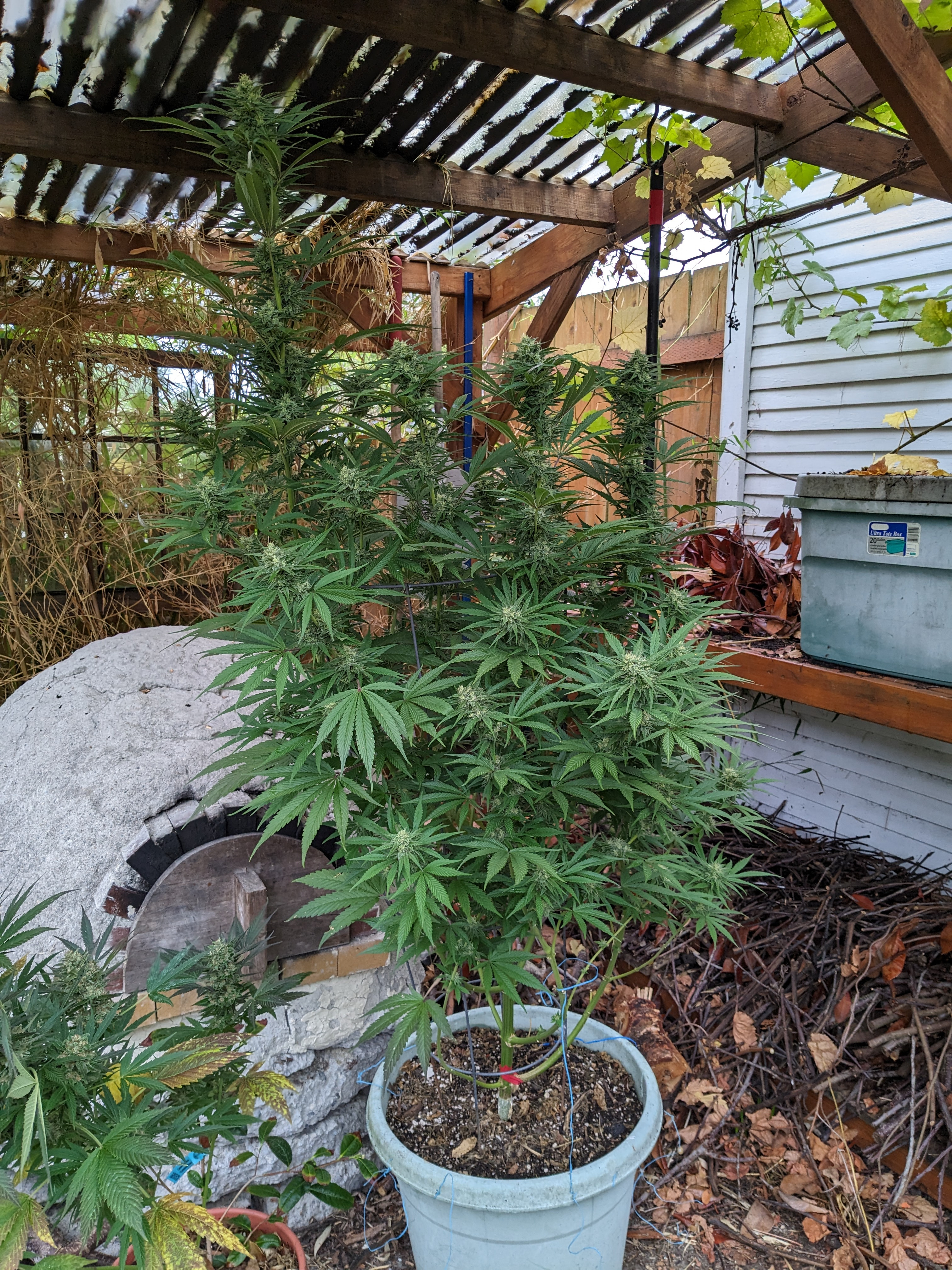 I've got the smaller, volunteer orange Skittles f2 and my bigger Sour d x orange Skittles underneath my clay oven roof because rain is predicted for the next 5 days. I think the volunteer is going to finish, it's really fantastic and smells amazing, and was a fast starter. The pictures don't do it justice, I've really done nothing with this plant. Plant it's only in a 3 gallon pot along with a tea plant, it was a volunteer from a top dress of compost that I put on the tea plant and I really done nothing with it. But the buds are so thick and smells so great! The Sour d cross is also doing good but I don't think there's any way in hell it's going to finish before it. It gets destroyed by bud rot