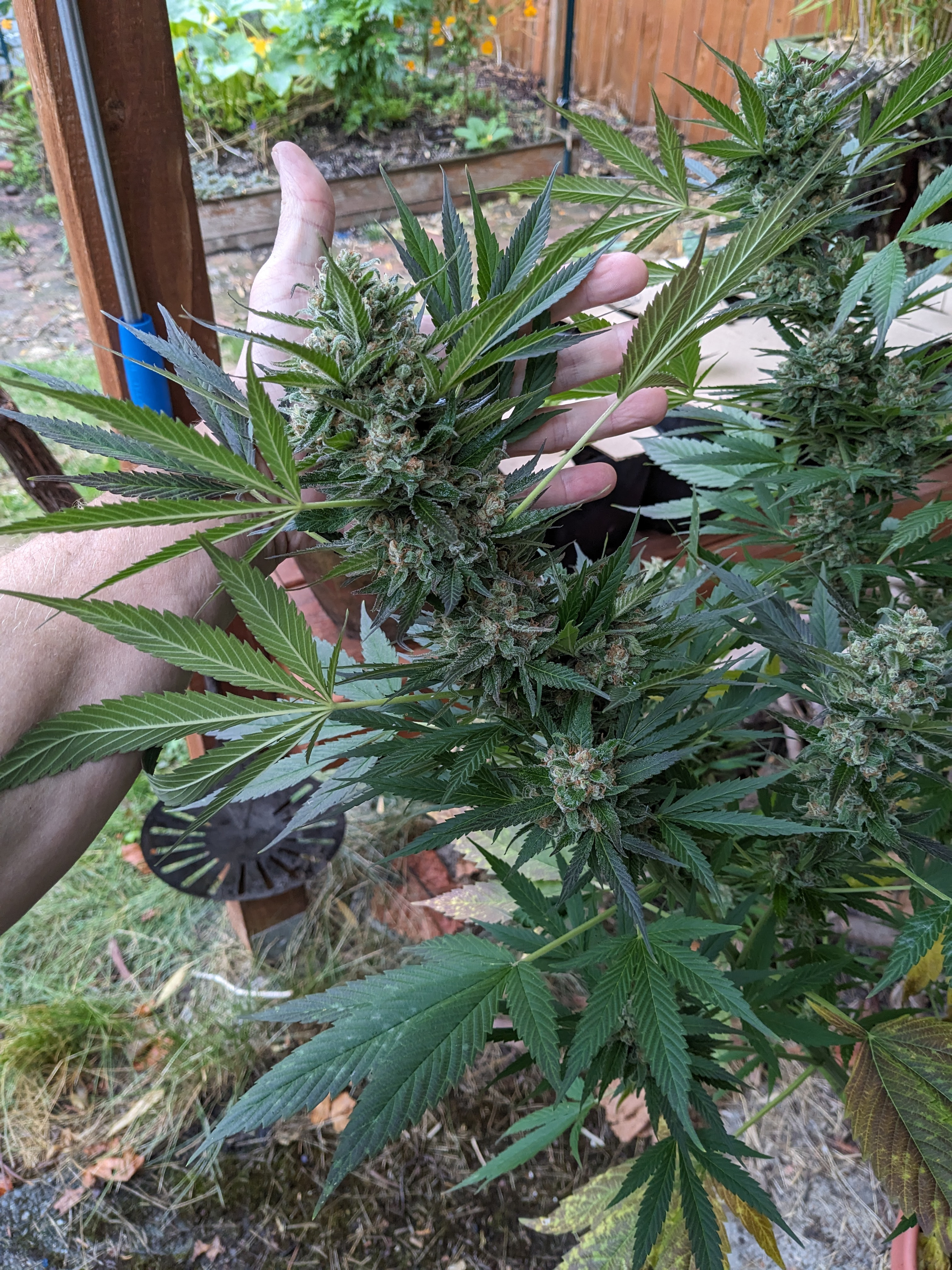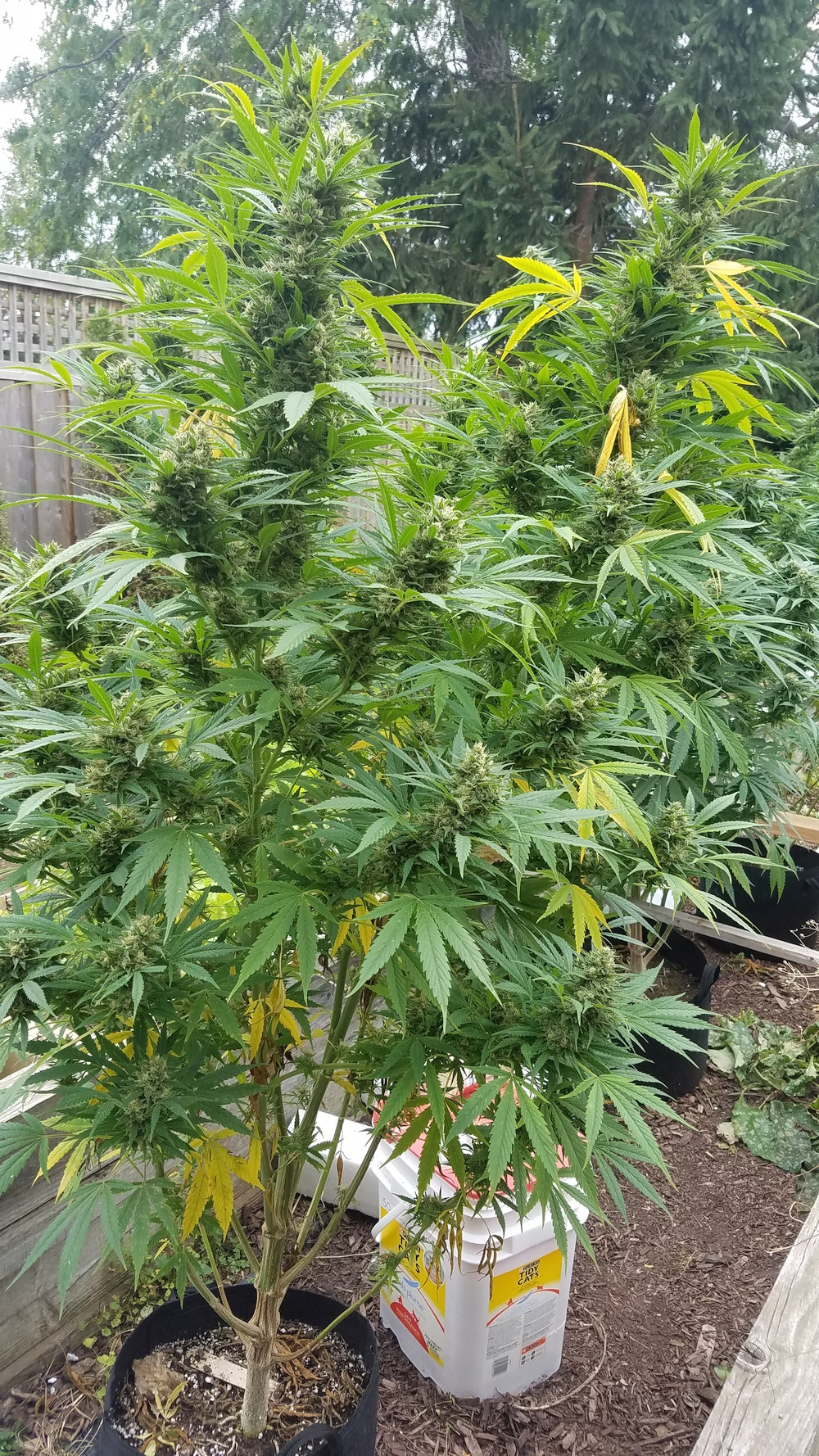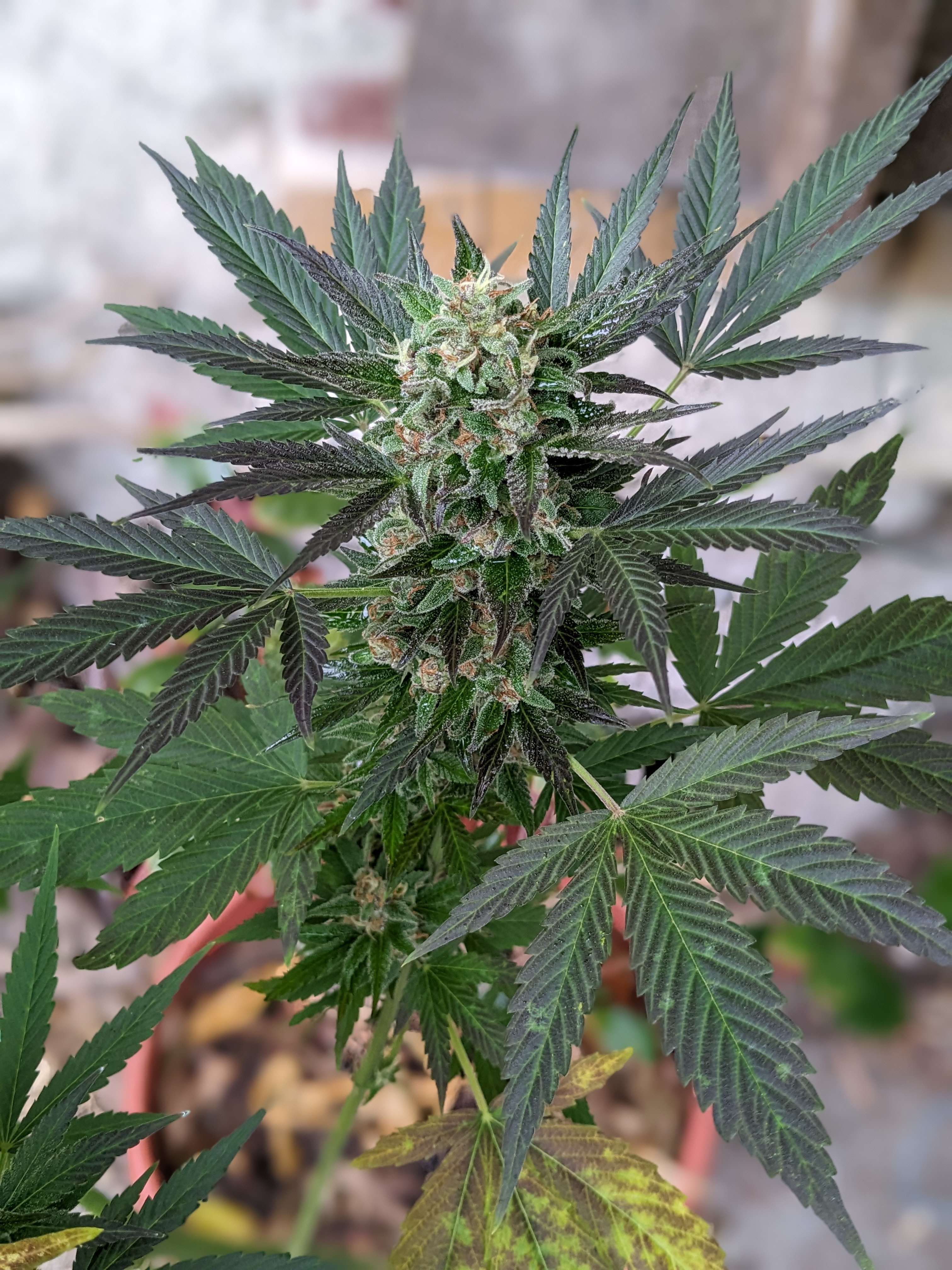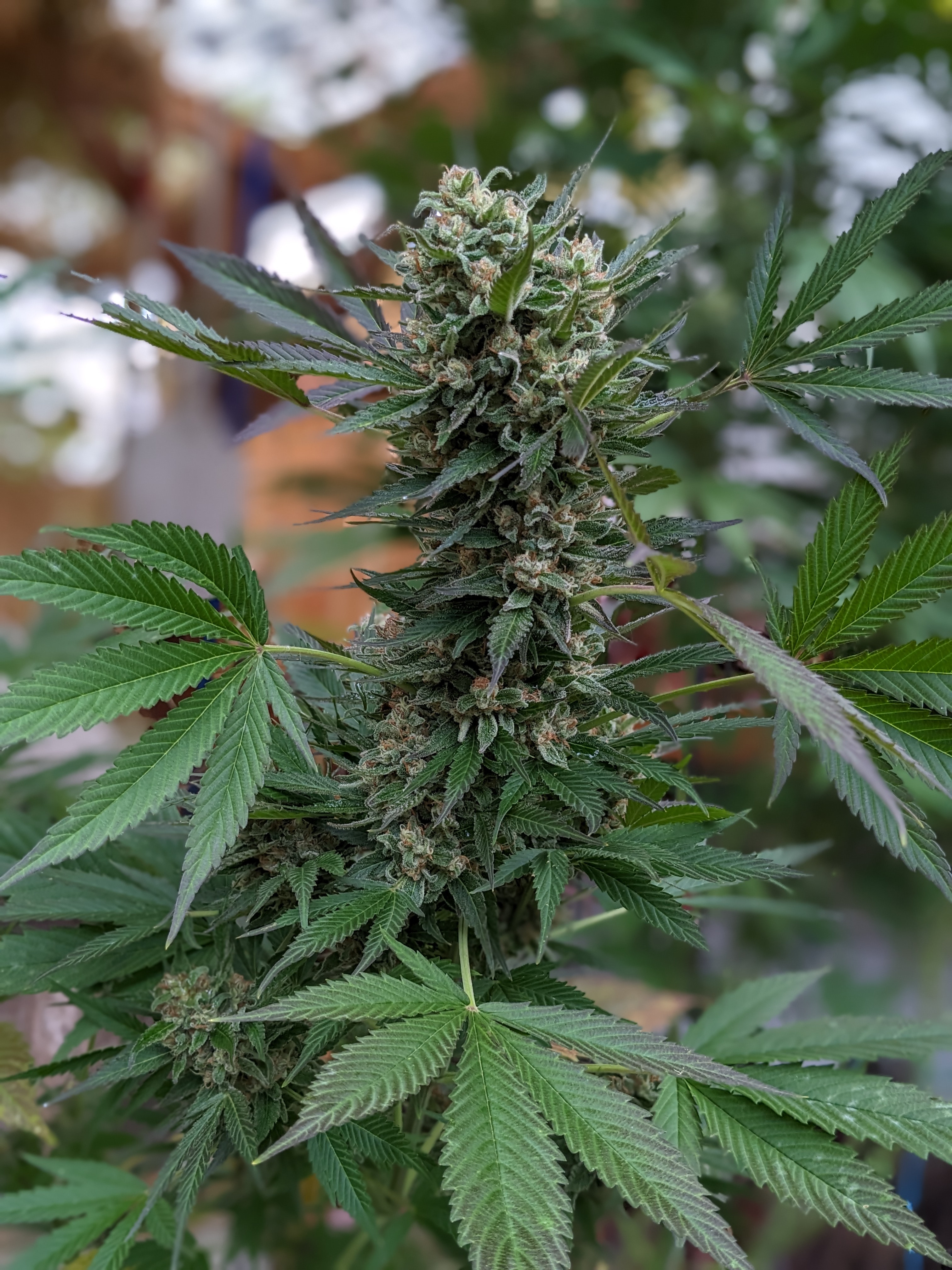 I've got the smaller, volunteer orange Skittles f2 and my bigger Sour d x orange Skittles underneath my clay oven roof because rain is predicted for the next 5 days. I think the volunteer is going to finish, it's really fantastic and smells amazing, and was a fast starter. The pictures don't do it justice, I've really done nothing with this plant. Plant it's only in a 3 gallon pot along with a tea plant, it was a volunteer from a top dress of compost that I put on the tea plant and I really done nothing with it. But the buds are so thick and smells so great! The Sour d cross is also doing good but I don't think there's any way in hell it's going to finish before it. It gets destroyed by bud rot