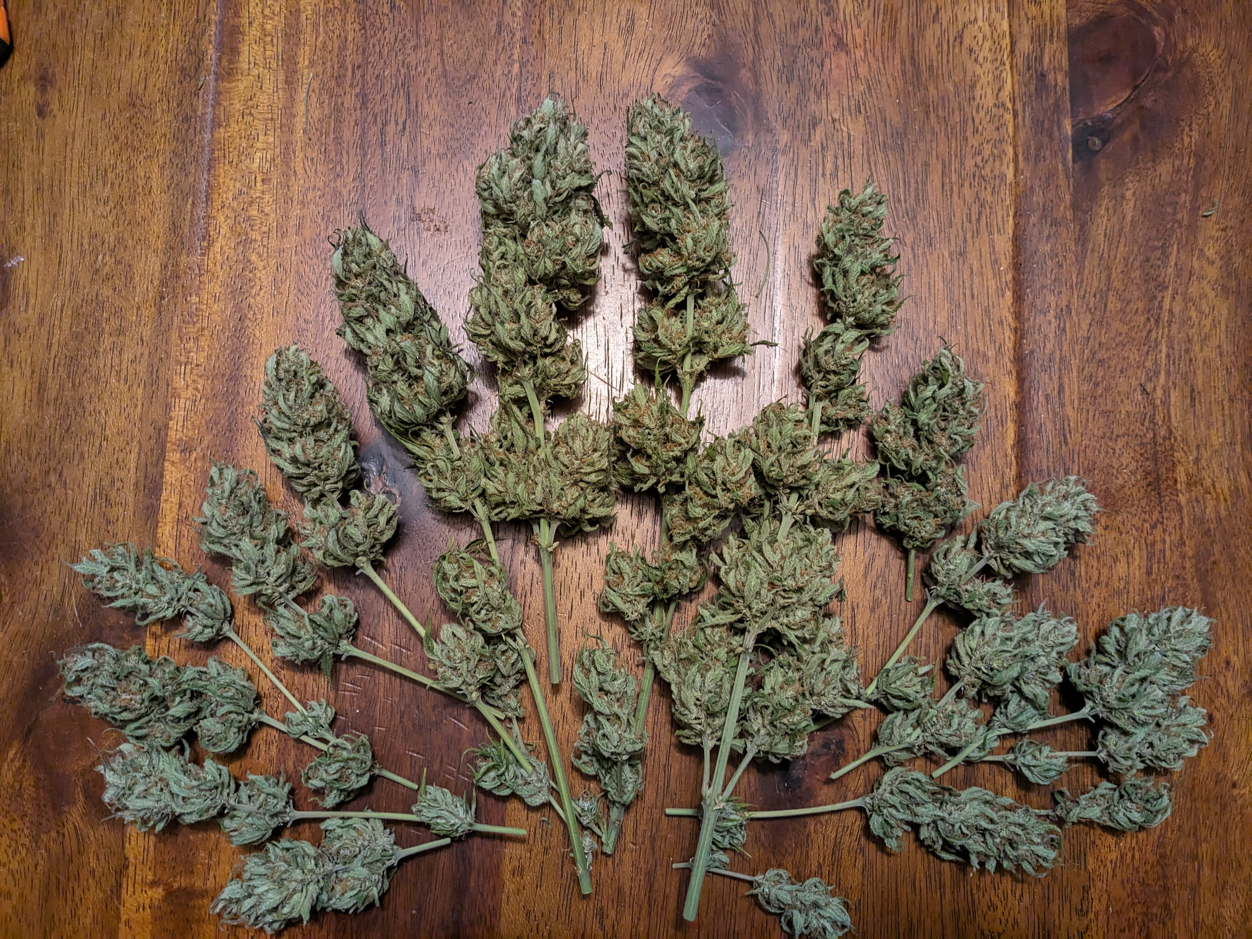 The volunteer orange Skittles is done with is slow dry, just trimmed and ready to go into Grove bags in a day or two. The smell is absolutely phenomenal, bursting orange. The sour orange Skittles is still drying in the garage, I think I'm going to bring it inside to dry, still see new mold emerging but I think I'll get some buds out of it. Even though I was so excited about this one, because the cross sounds great, as of last smell, it was not nearly as good as the volunteer orange Skittles.