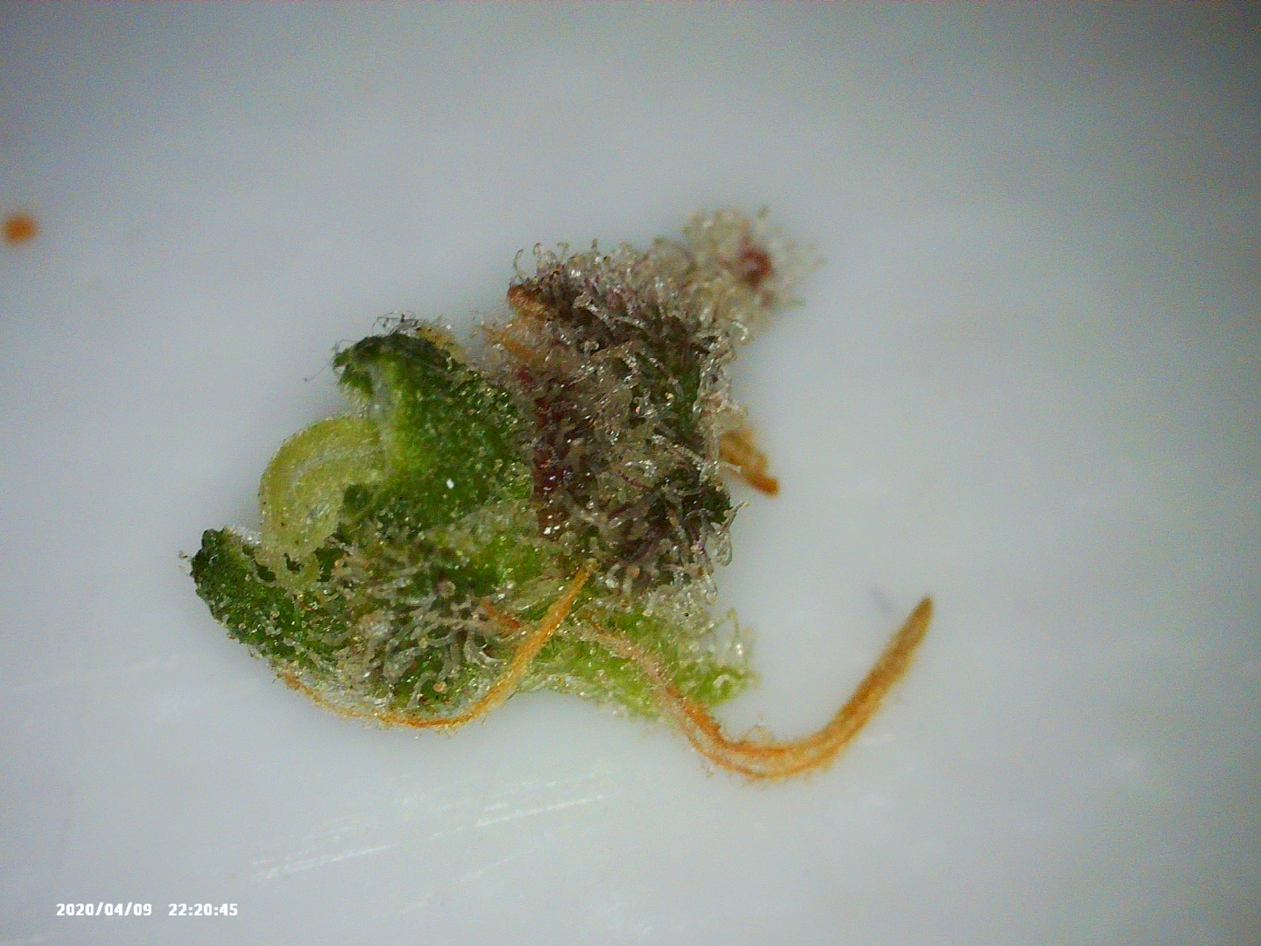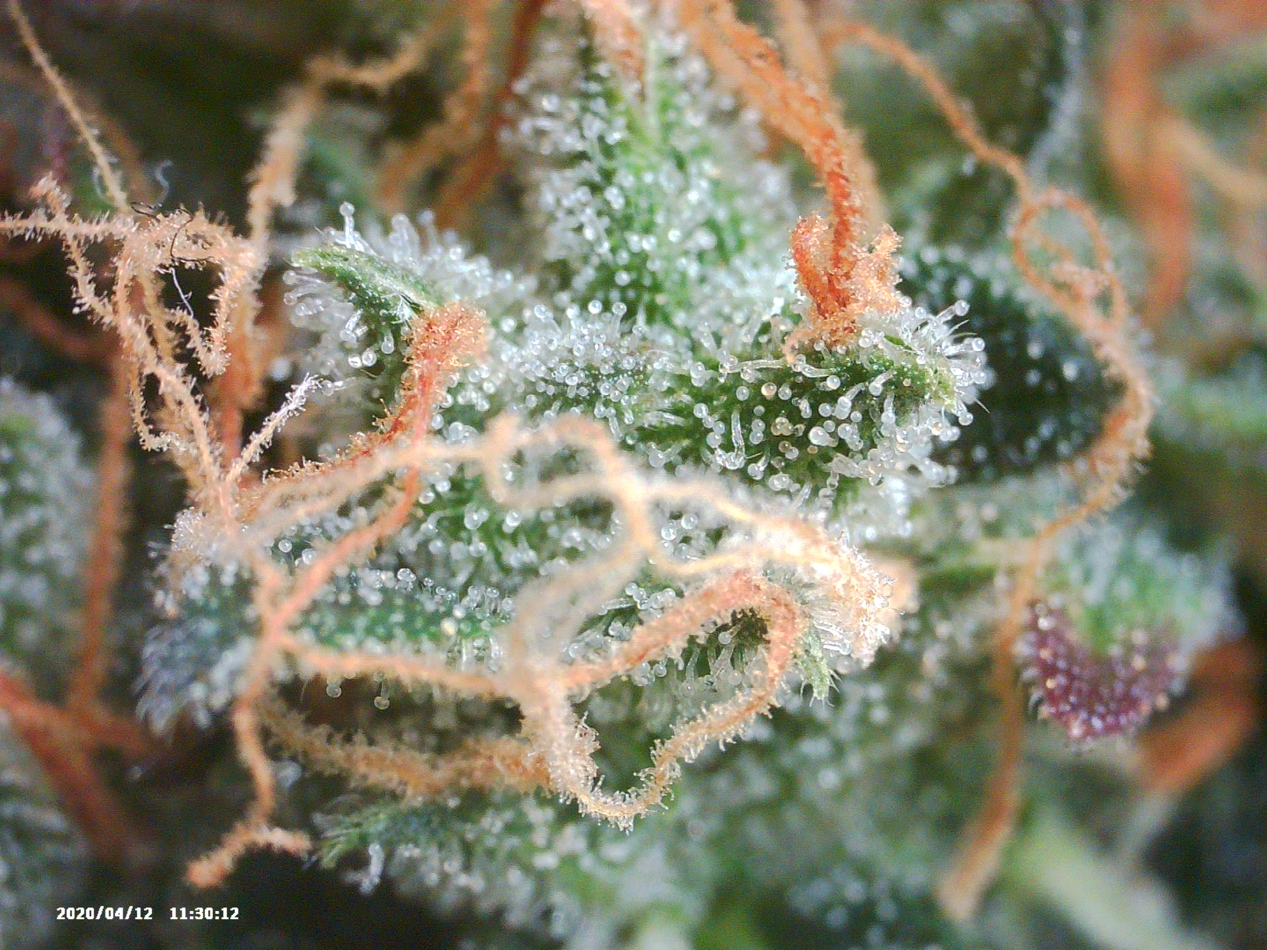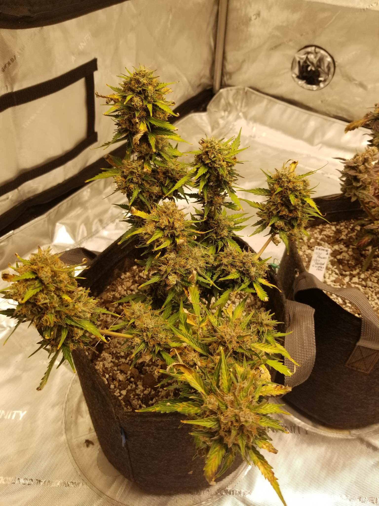 Regarding waiting a bit more, will do. I will take pictures of the full plants so you all can see the vegetation. While the sugar leaves are definitely green, all other leaves have been browning and falling off; the Zkittlez leaves are more so.... purpling/blackening, but comparable to browning (dry to touch, crumbling, falling off). What's interesting is new calyxes are forming on some of Zkittlez colas, which I've only identified because they are as green as the older ones were when the plant first started budding.