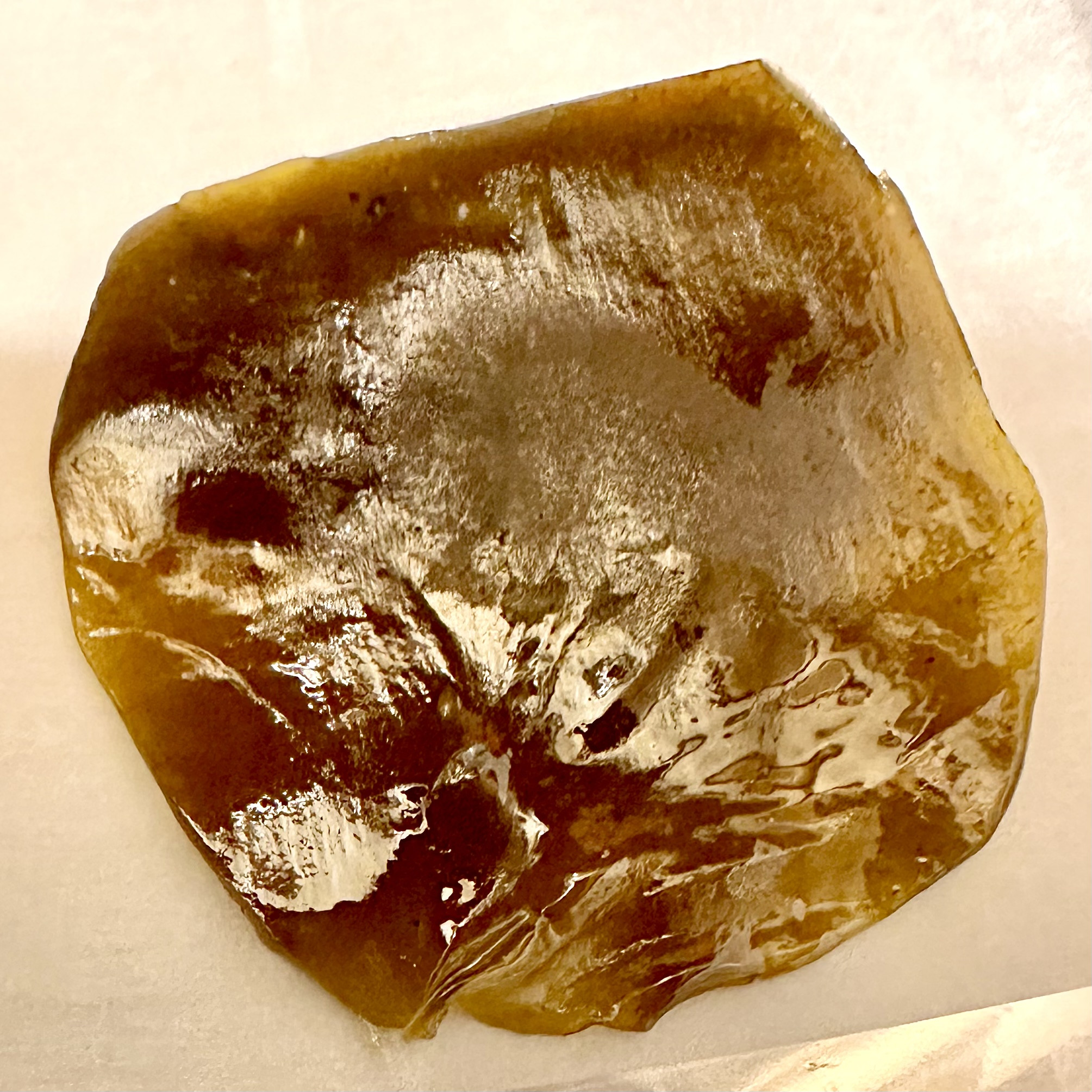 This is a good representation of what we pressed out. Shown here is Creamy Blacklights 1.6 grams pressed out of a 37 micron bag. Notice the lack of any packaging, notice also (obviously present) the plant material OTHER THAN rosin and this was pressed with a 37 micron bag! Oh, price? Whatever about a square foot of parchment paper cost. Was it good, oh ya! Tastey?, You bet!