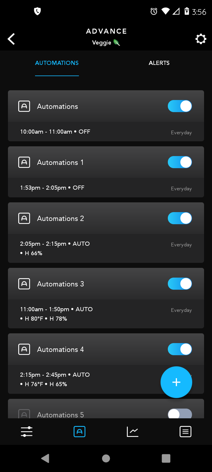 I have 5 automation settings in the app too for this tent. Meant to preserve heat on lights off and help build it when the lights first come on. The RH I run higher than optimal VPD for the first hour to get all up to temp. Have a little heater that comes on 15 minutes before the lights.