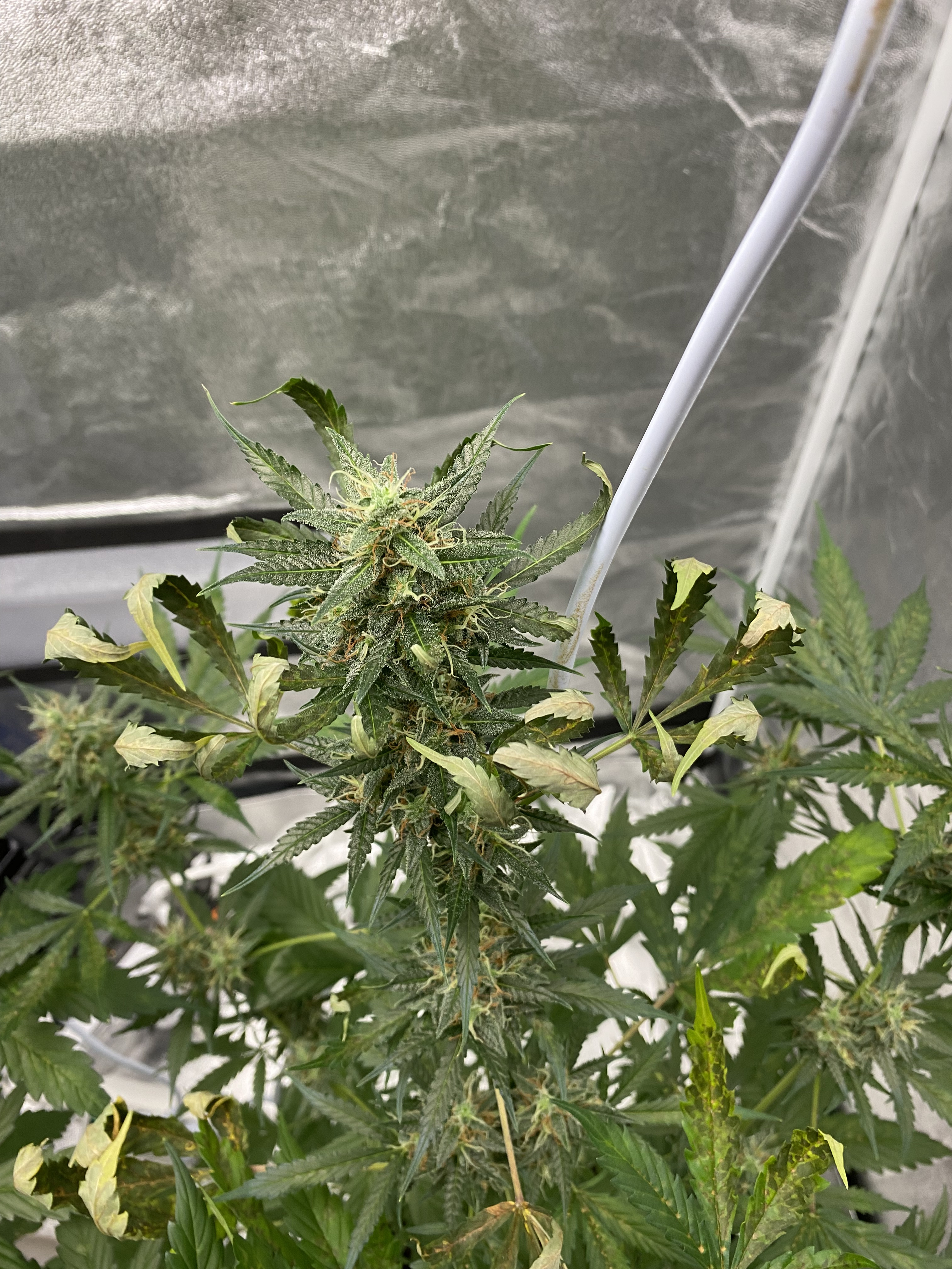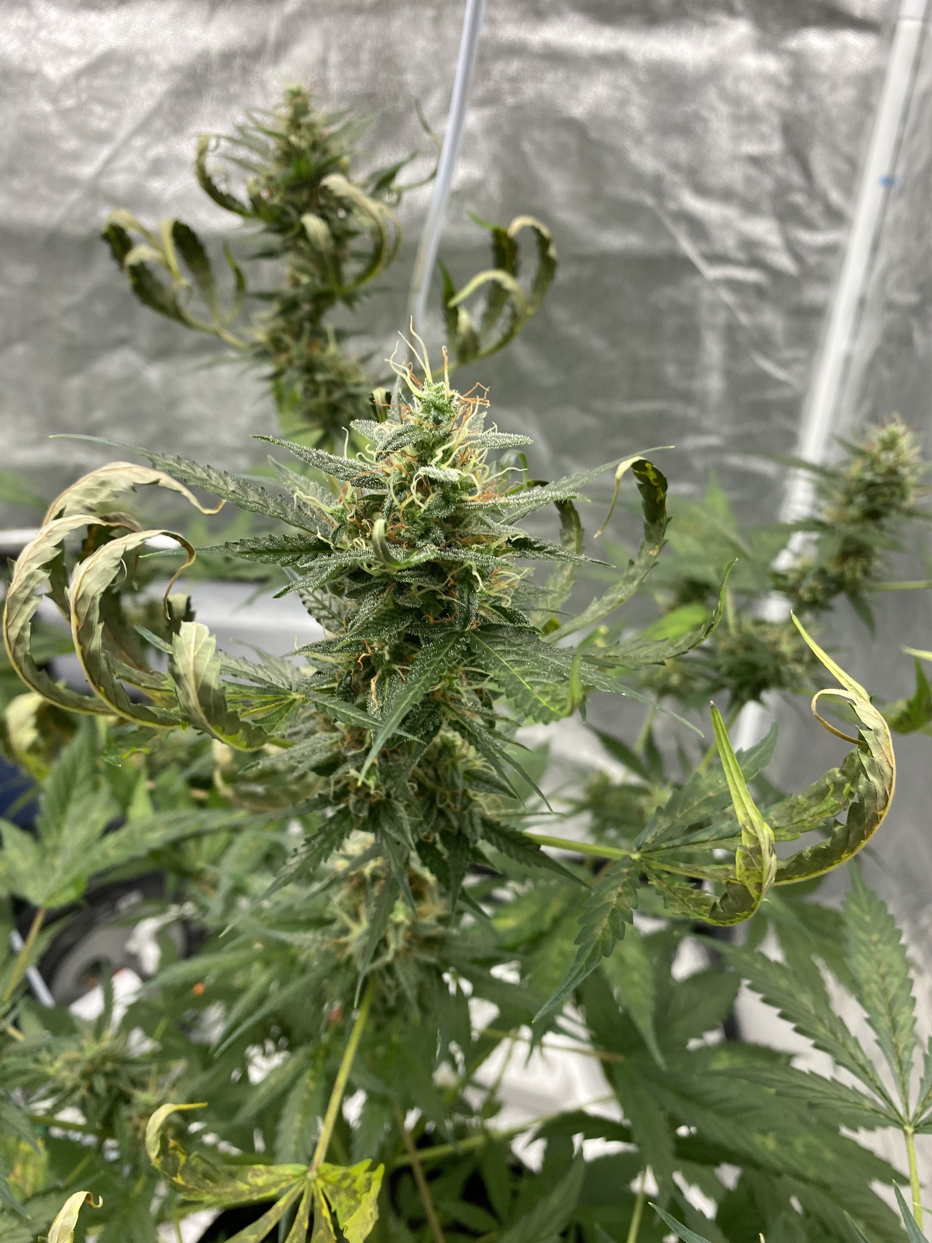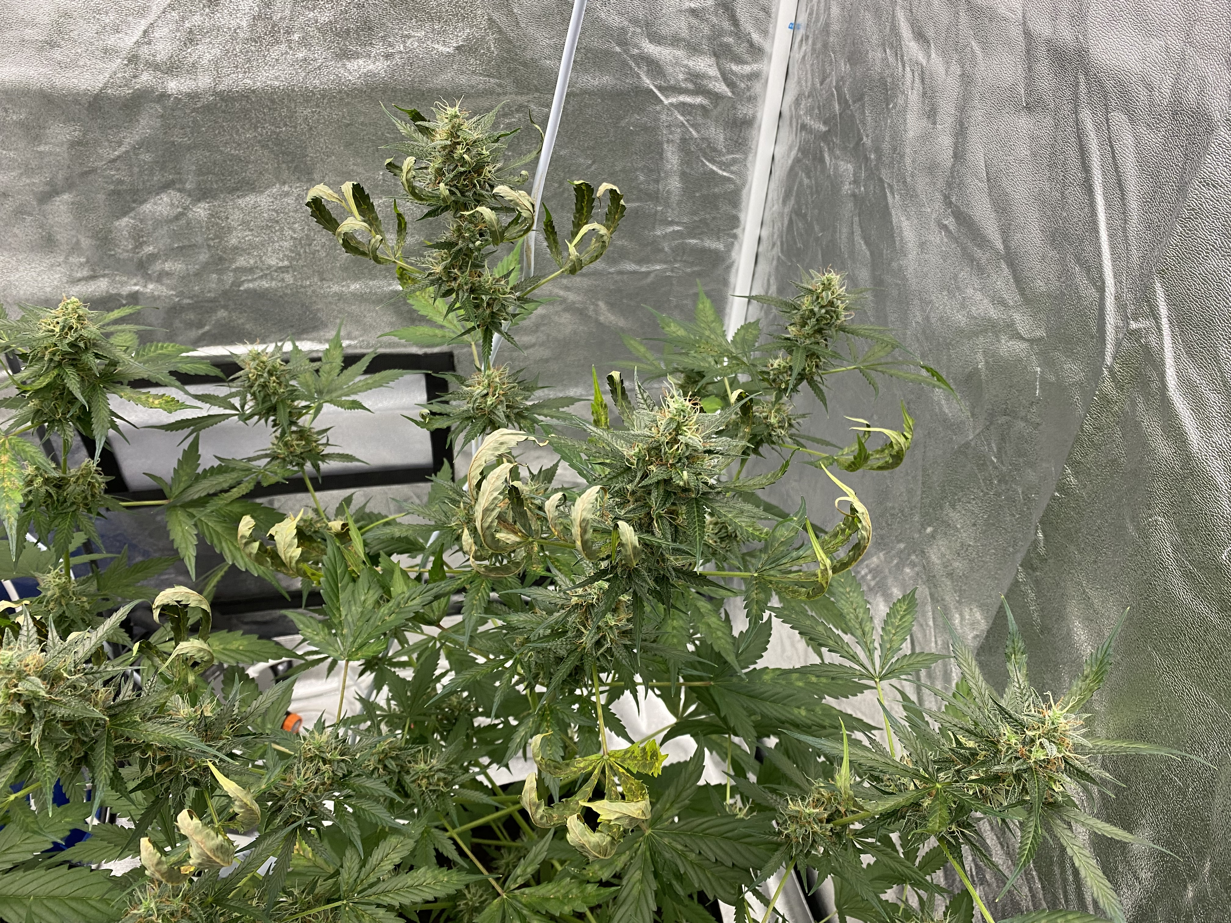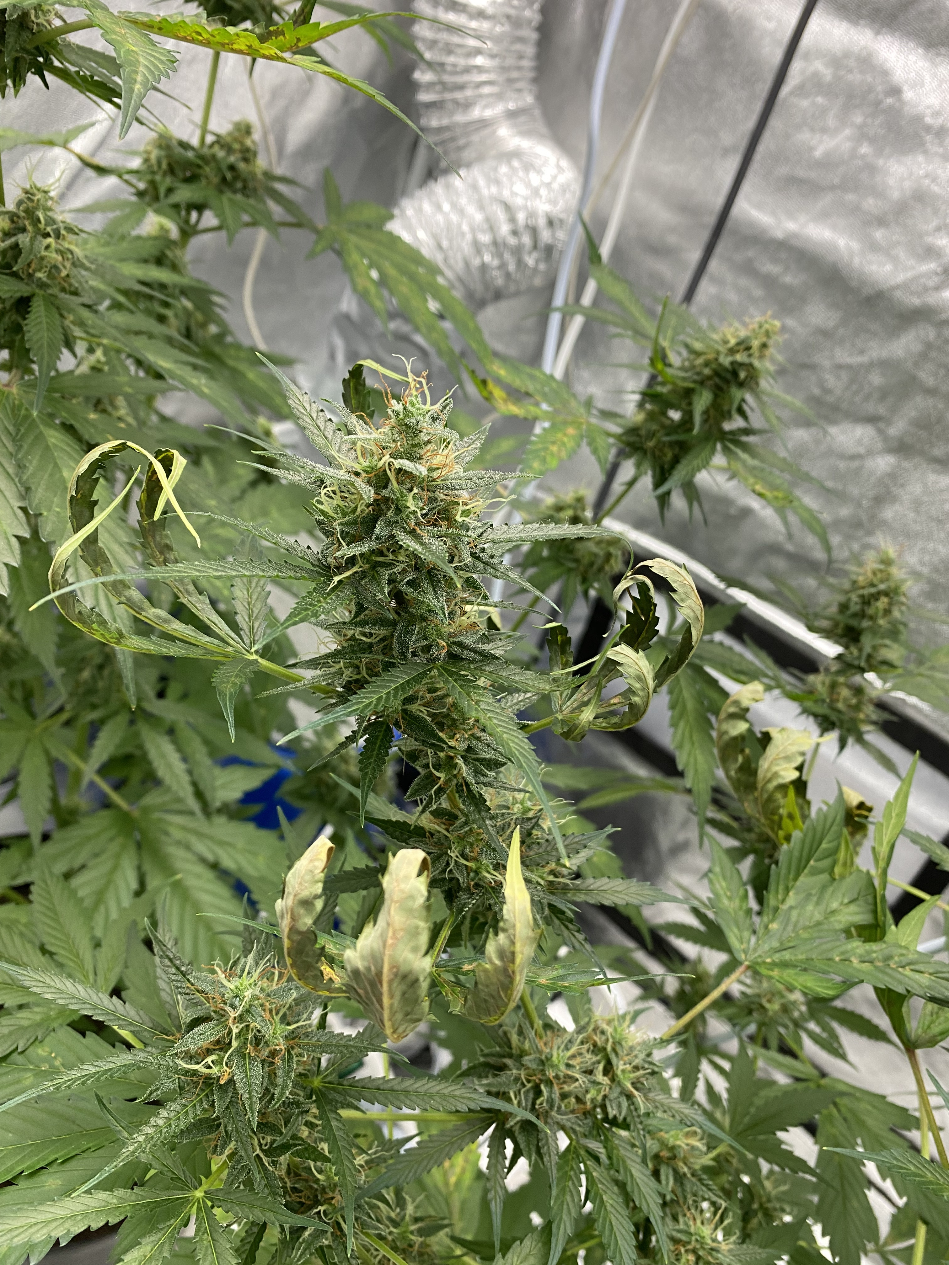 Need ugent help! I’m completely new at this. It seems I’m in pretty late flowering, and my plants look like this now. The leaves started drying up and curling (from the top). Last night I raised the lights all the way up to the tent cieling, and stopped watering. I also went from 4 hours nighttime to six hours. I’ve been watering them quite a lot every day. They are auto-flowering plants, and I read somewhere that they should have a lot of light during flowering, and needed a lot of water. Also, I should strive to get the environment as dry as possible, and now I’ve got it on 36%, and just above 20C. I stopped fertilizing them about a week ago, as I read that close to harvest that was important. What’s going on here? Is it over-watering, in combination with too much light? Have I taken the correct measures? And are the plants beyond saving? That would be really crappy, as they seem s