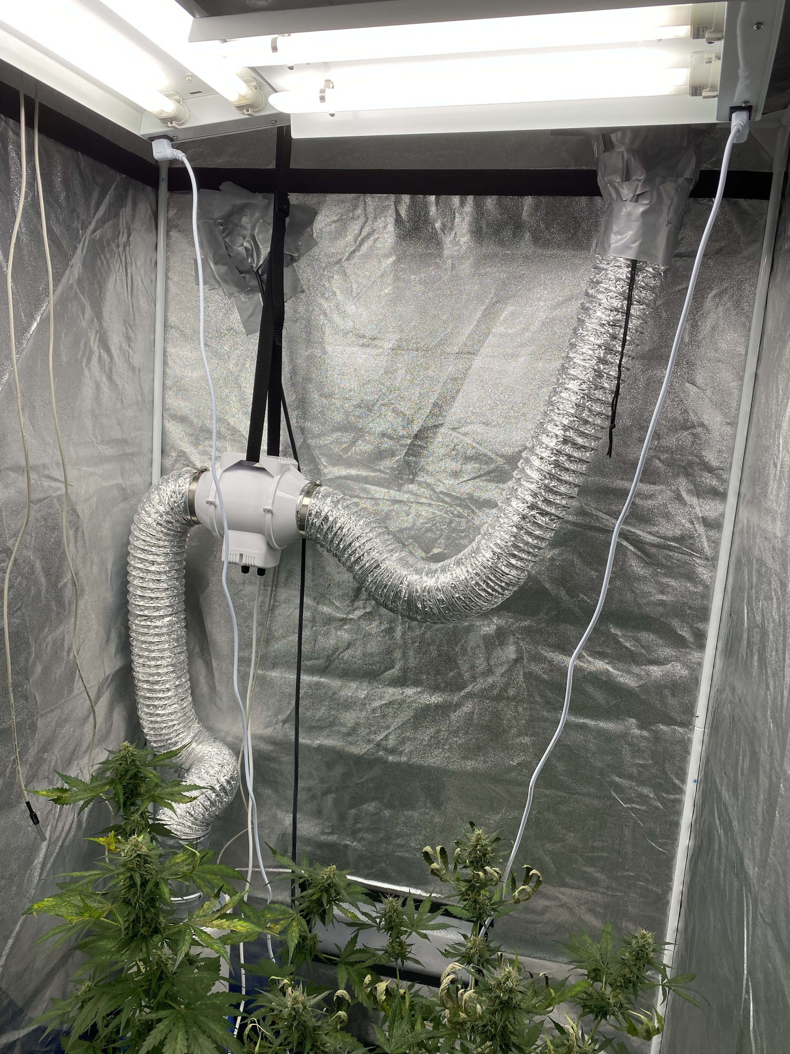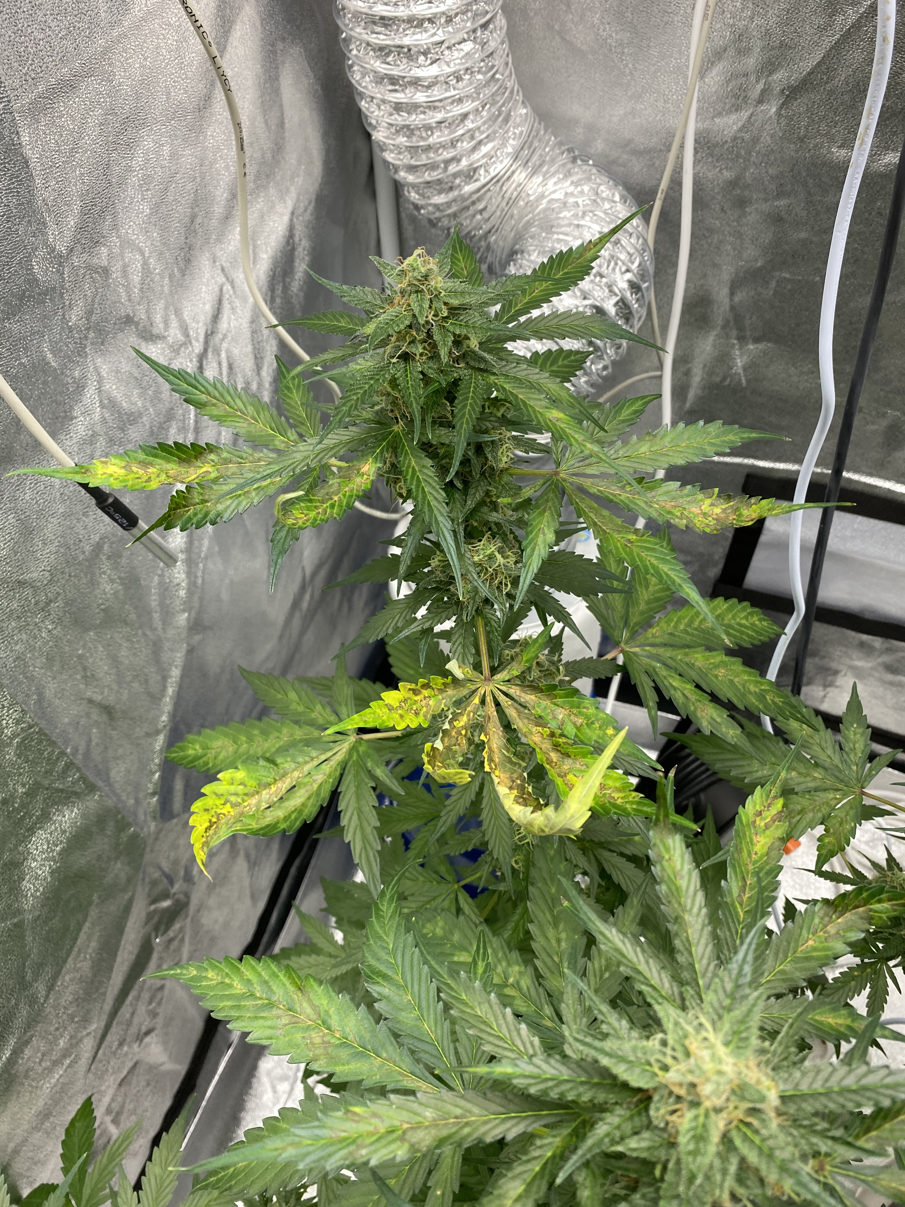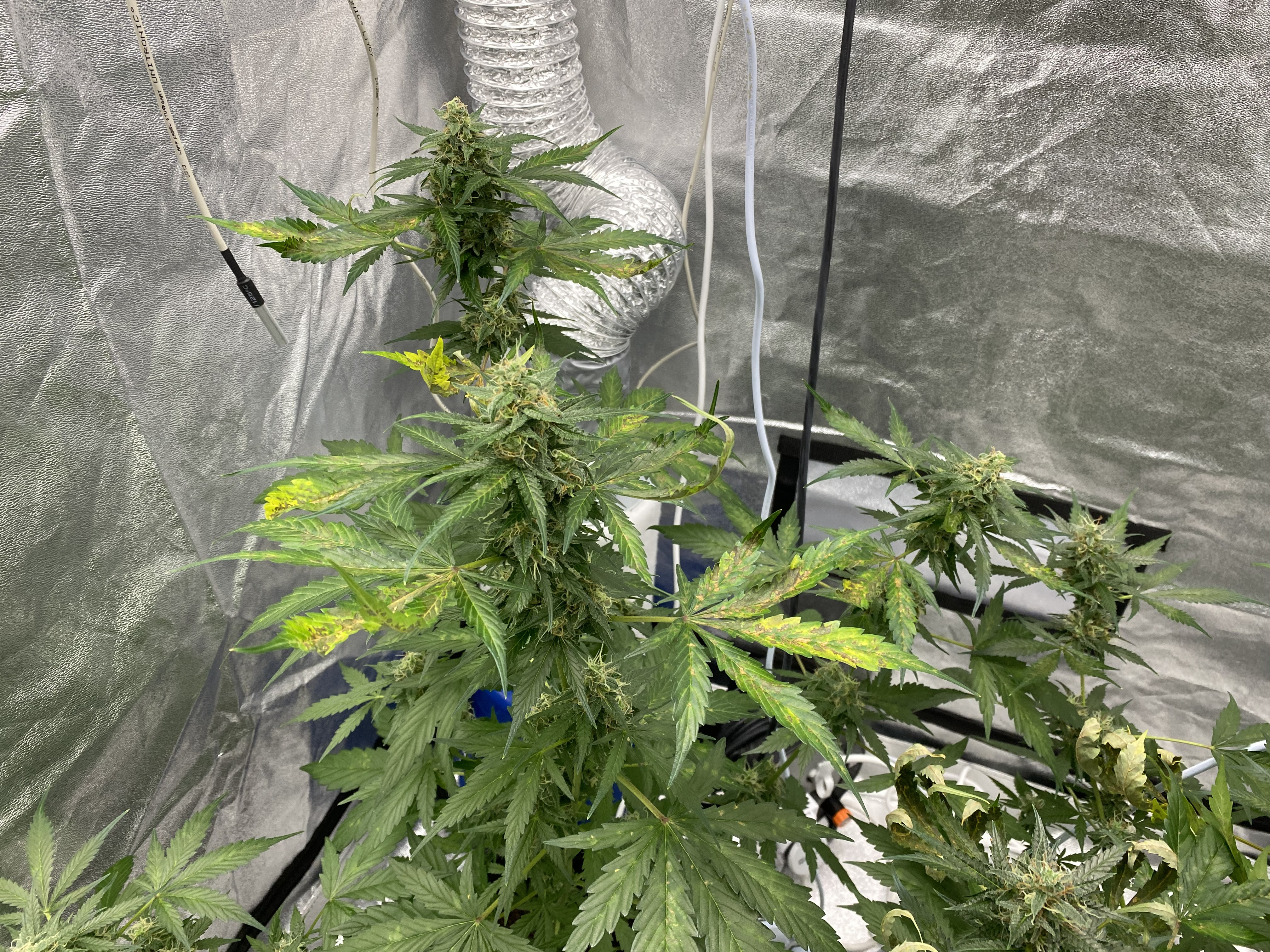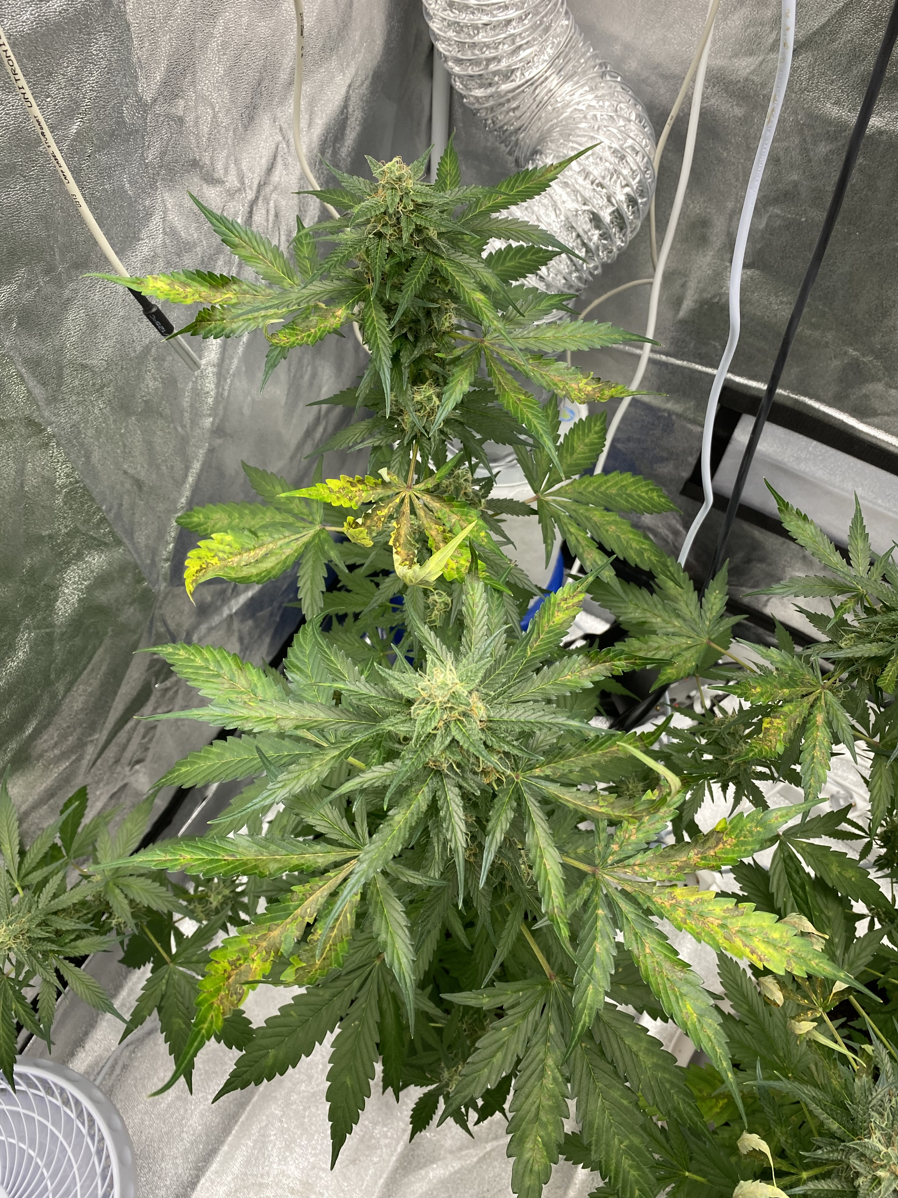 Need ugent help! I’m completely new at this. It seems I’m in pretty late flowering, and my plants look like this now. The leaves started drying up and curling (from the top). Last night I raised the lights all the way up to the tent cieling, and stopped watering. I also went from 4 hours nighttime to six hours. I’ve been watering them quite a lot every day. They are auto-flowering plants, and I read somewhere that they should have a lot of light during flowering, and needed a lot of water. Also, I should strive to get the environment as dry as possible, and now I’ve got it on 36%, and just above 20C. I stopped fertilizing them about a week ago, as I read that close to harvest that was important. What’s going on here? Is it over-watering, in combination with too much light? Have I taken the correct measures? And are the plants beyond saving? That would be really crappy, as they seem s