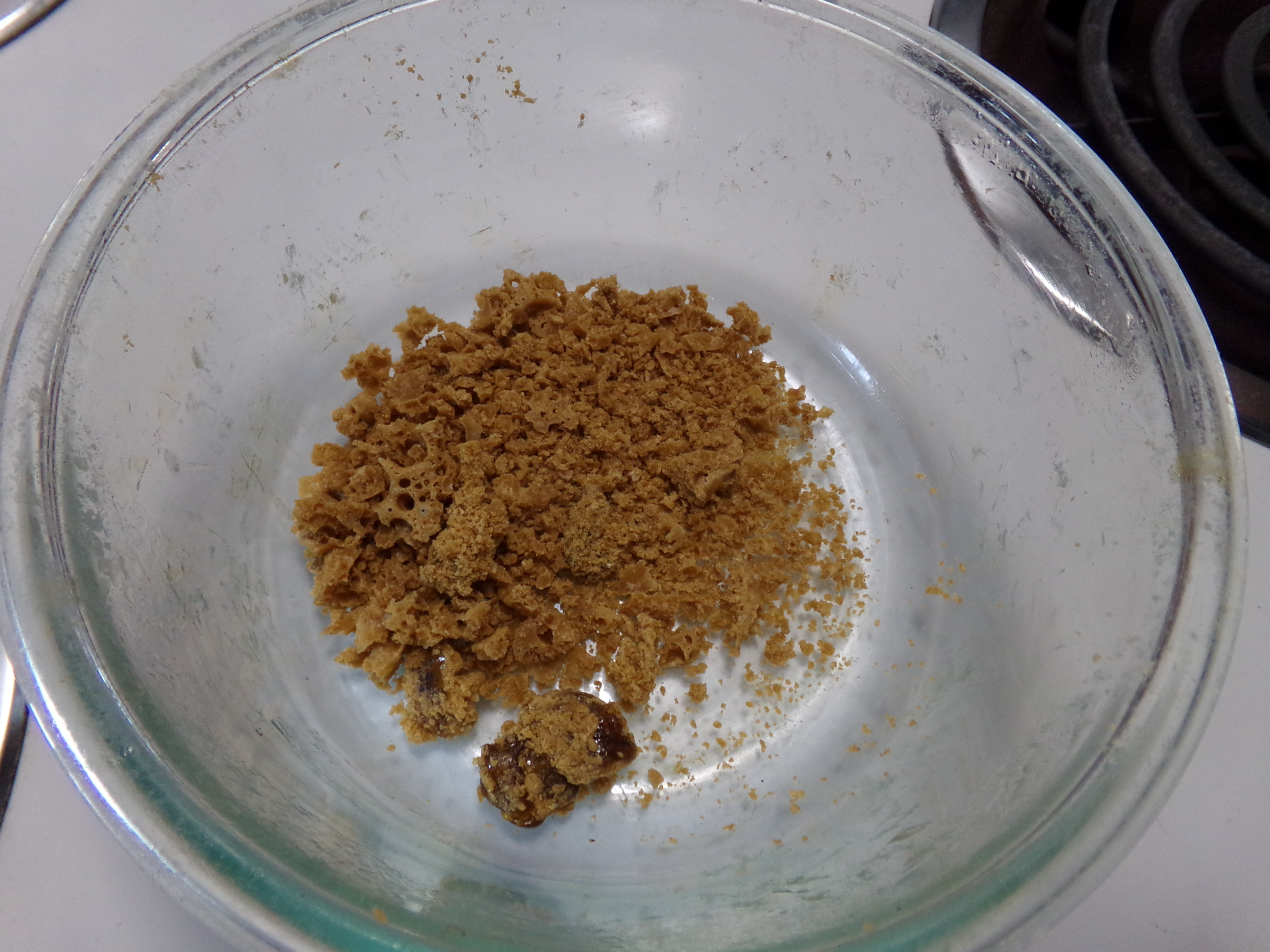 Ckbrew that booger is side scrapings that do not get agitated. To get the crumble consistency, the blast needs to be agitated to get air in and vacuum/heat purged to burn off the solvent. As the solvent evaporates, the goodness in the solvent warms up and holds the air pockets. It's a matter of purge, agitate, purge, agitate...