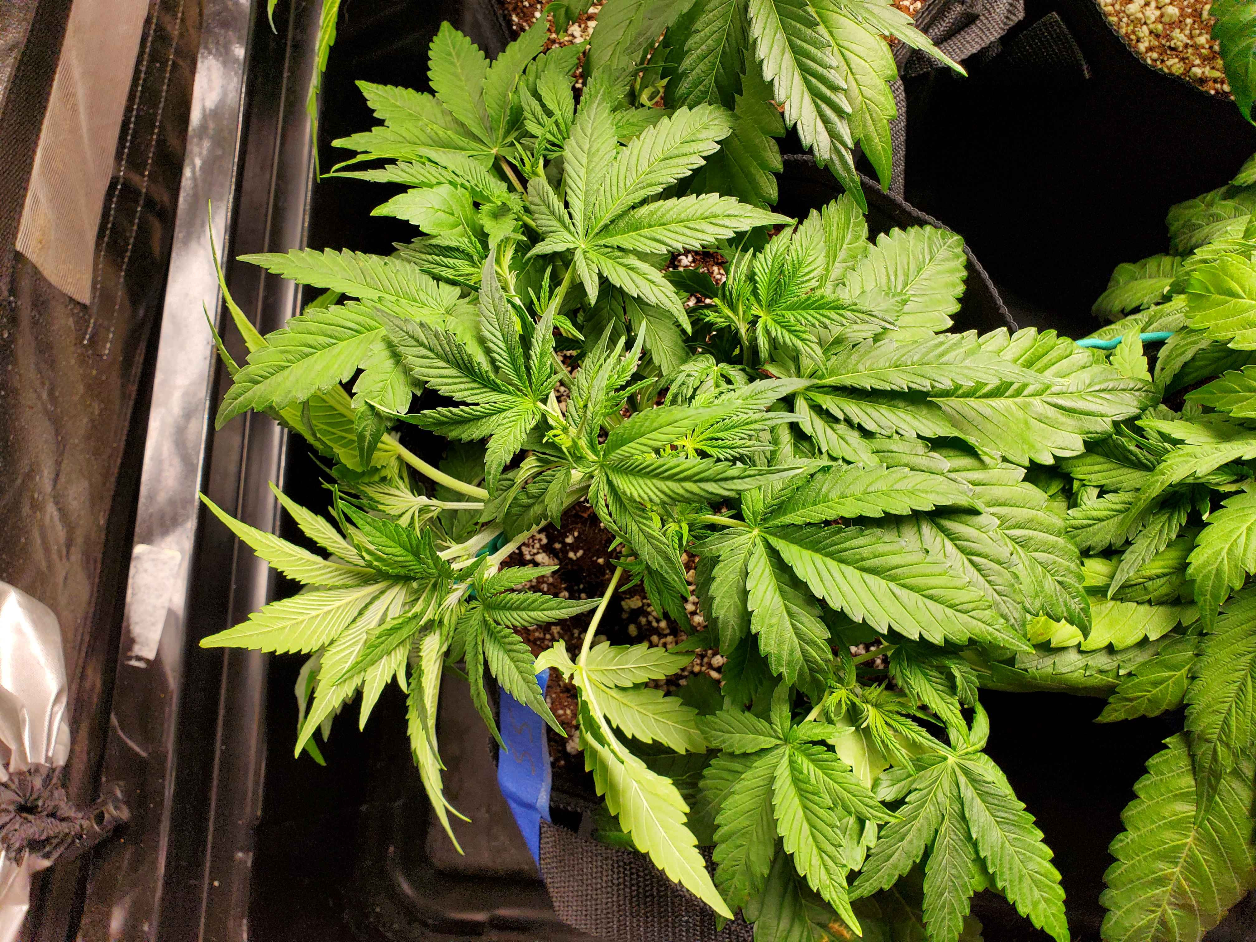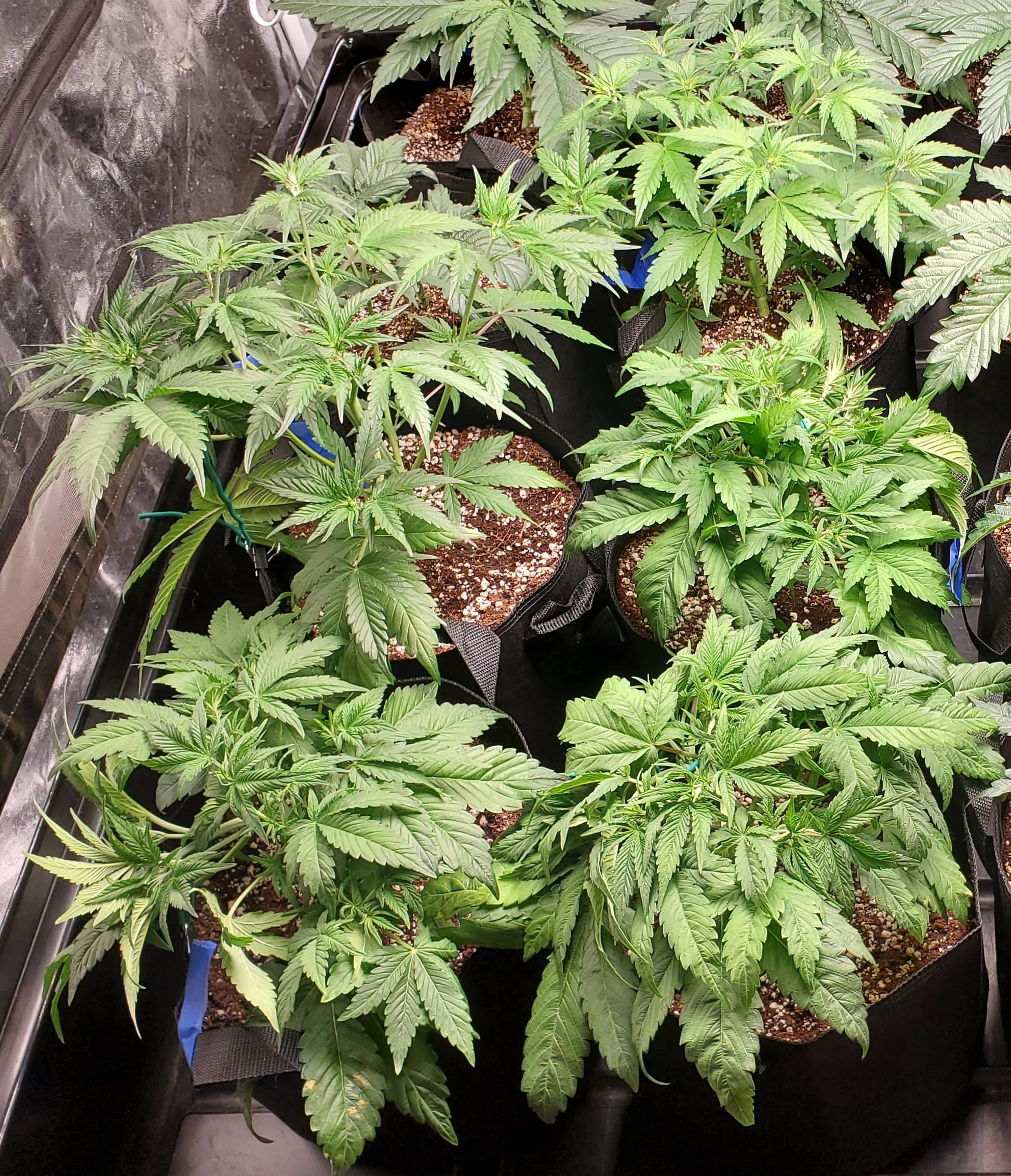 The Scarlets got a new home in the veg tent after they were tortured, bent over and tied down. I have taken to using binder clips on the edge of the pot and using that as an anchor for tying branches down and to the side. The Galaxies are well into the stretch and the Sunsets are starting. I am going to try 22/2 light schedule.