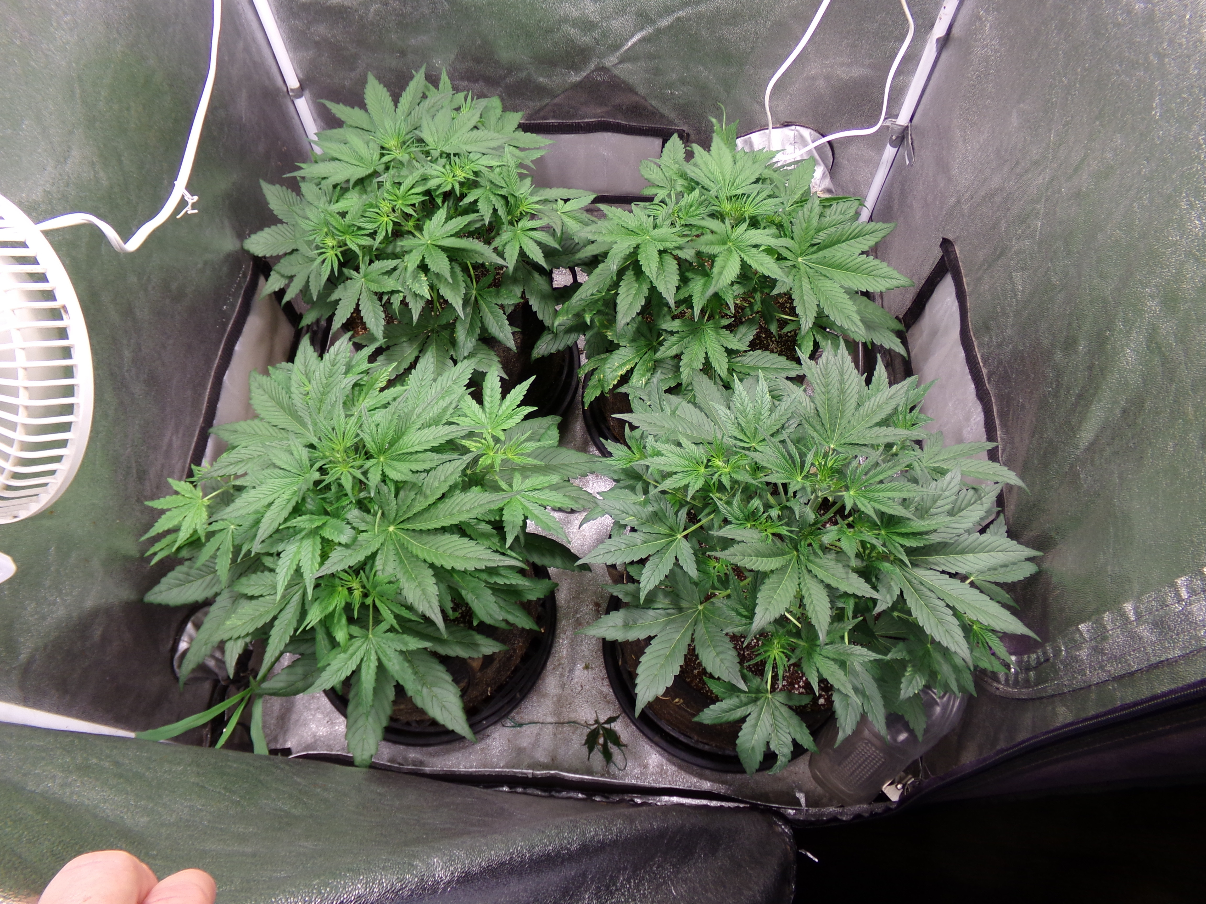 4x4 tent, Platinum LED P4-XML2, four Patio Pickers. Vegging Super Lemon Haze, Durban Poison and two Tangie x Blueberry crosses.