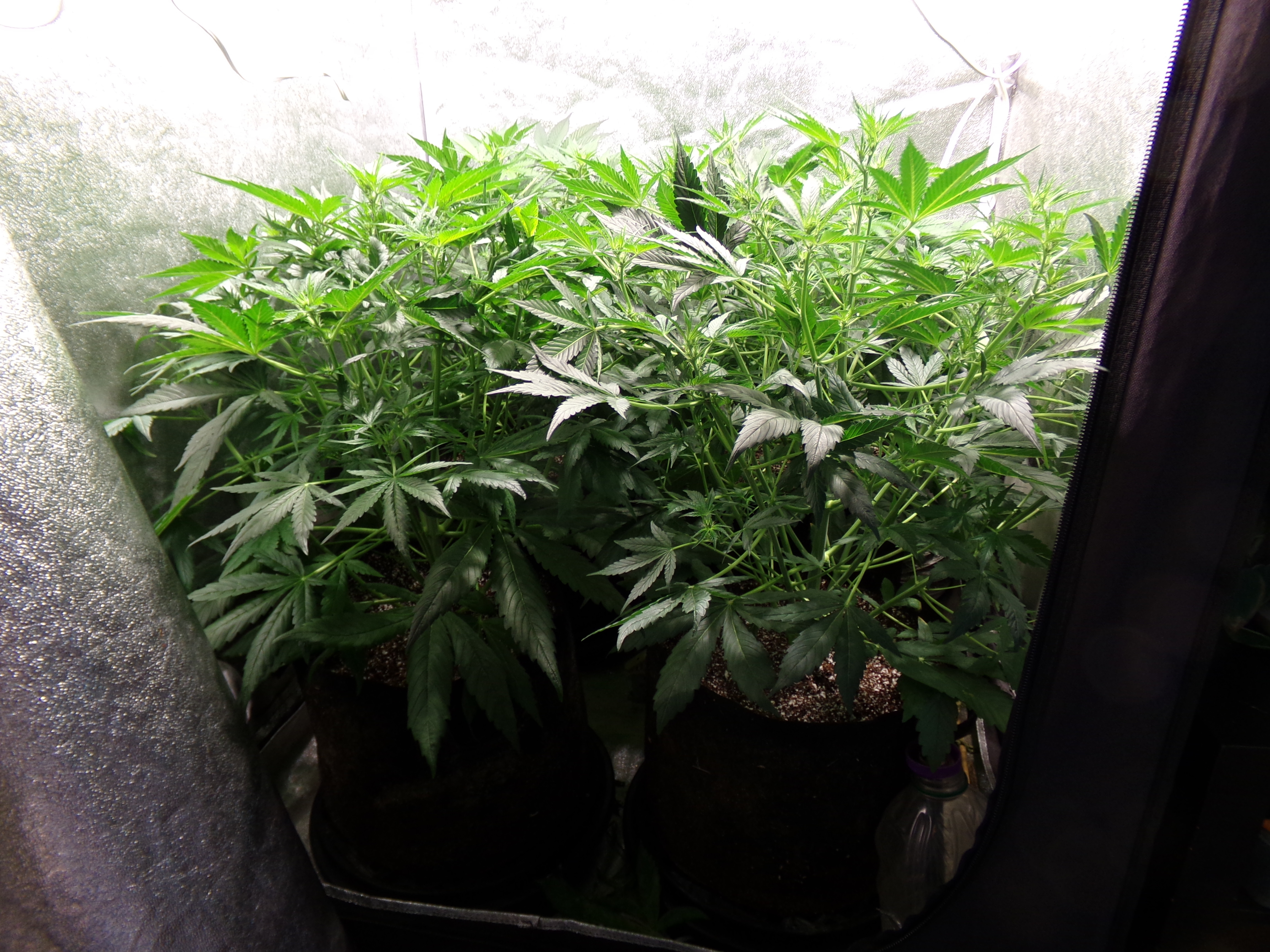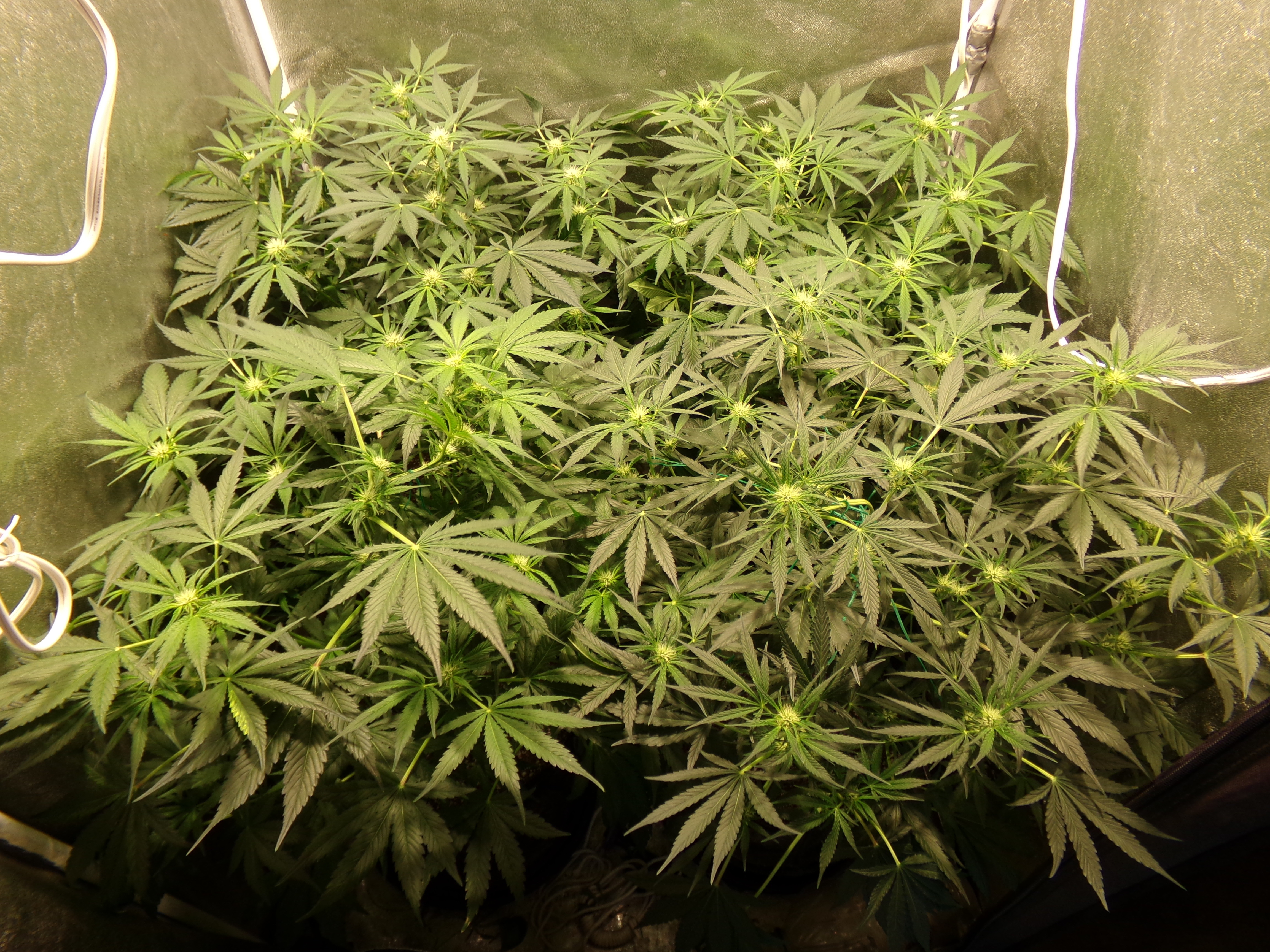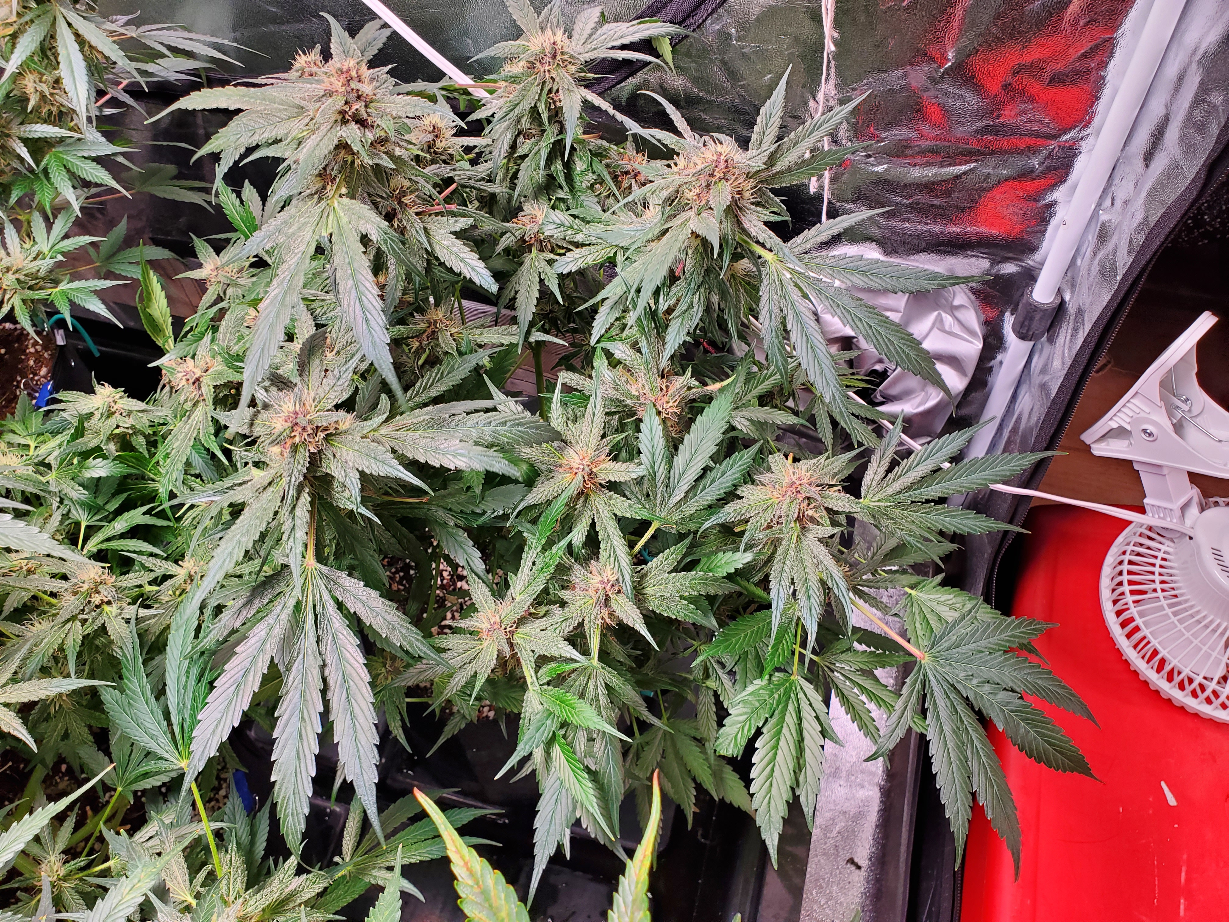 4 weeks. Flipped last night. The buds are as or more developed than I usually have. The plants are a few inches short of being my maximum height for feminized vegetation. If I get the same amount of stretch, the plants will be full size for my tent. I've only removed the soil sitter leaves. The more I grow, the less work I seem to do.