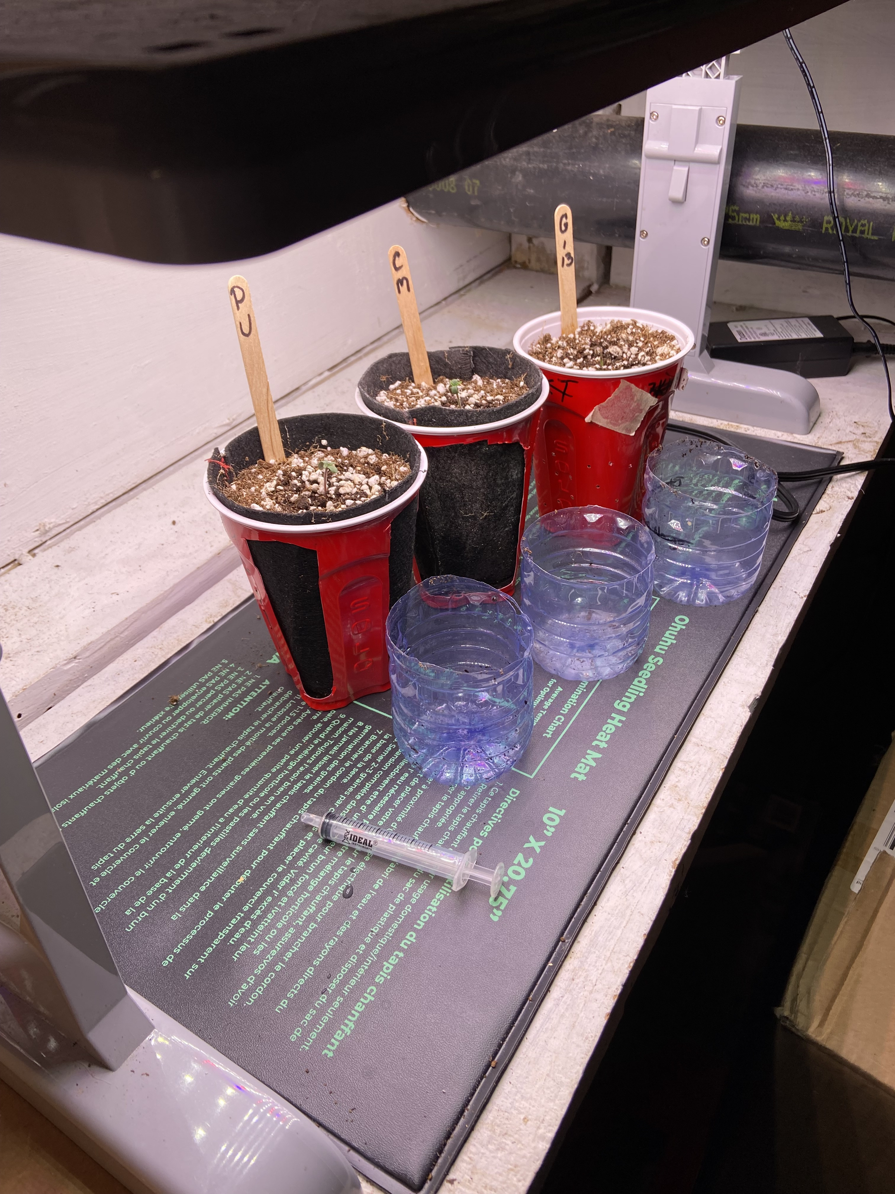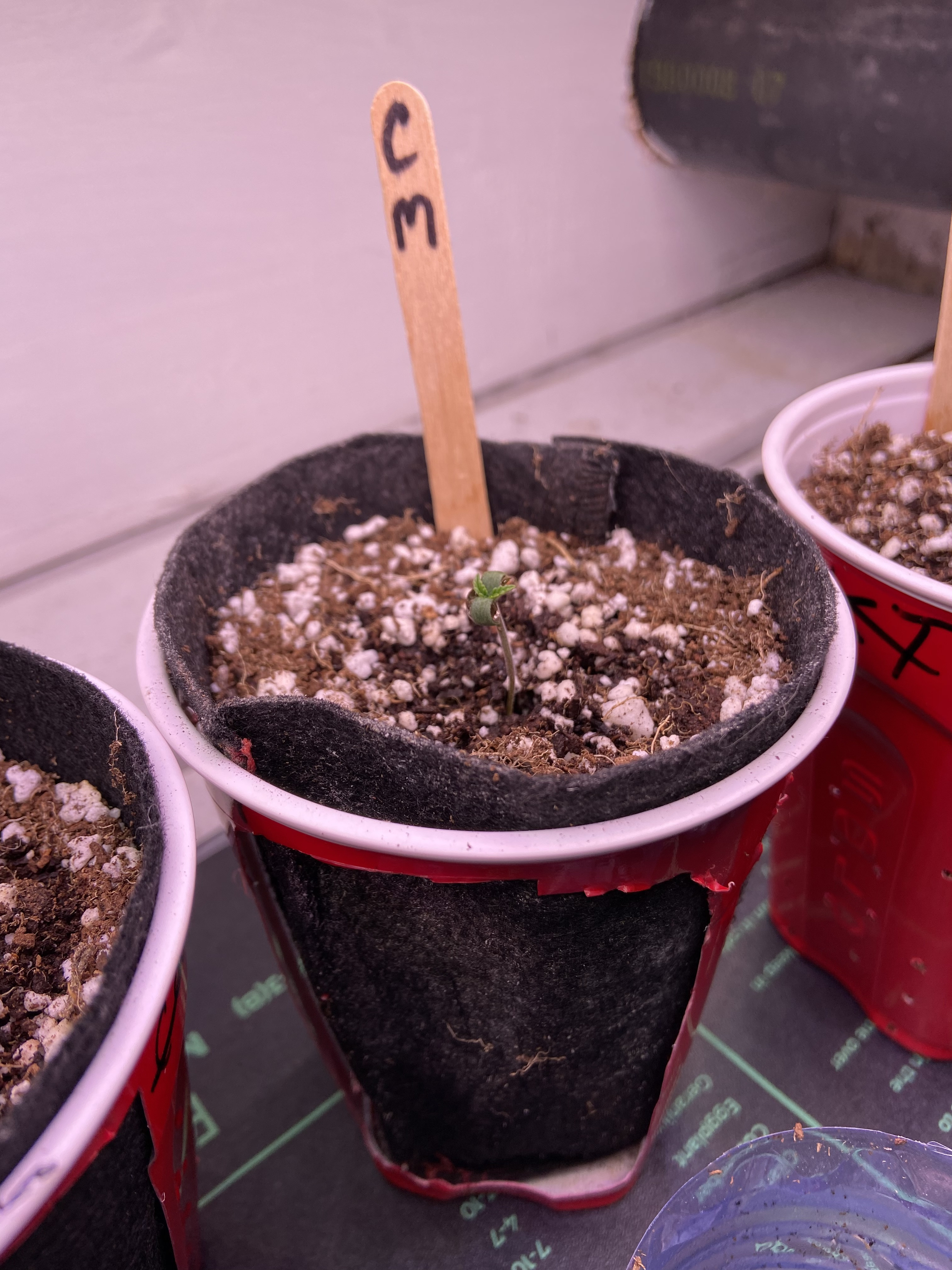 update... G-13's second set of leaves are 5 fingers! Maybe she's making up for having her helmet stuck on for two days longer than the other two I'm also over watering her..thats on me lol. My homemade fiber pots(purple Urkle and Critical mass) dry out really fast so they need water several times a day..the solo cup with G-13 not so much. Another week or so and i'll put them in 5 gallon fiber pots and some 4 yr old coco/perlite mix. its a lot like coco powder now but still works fine.