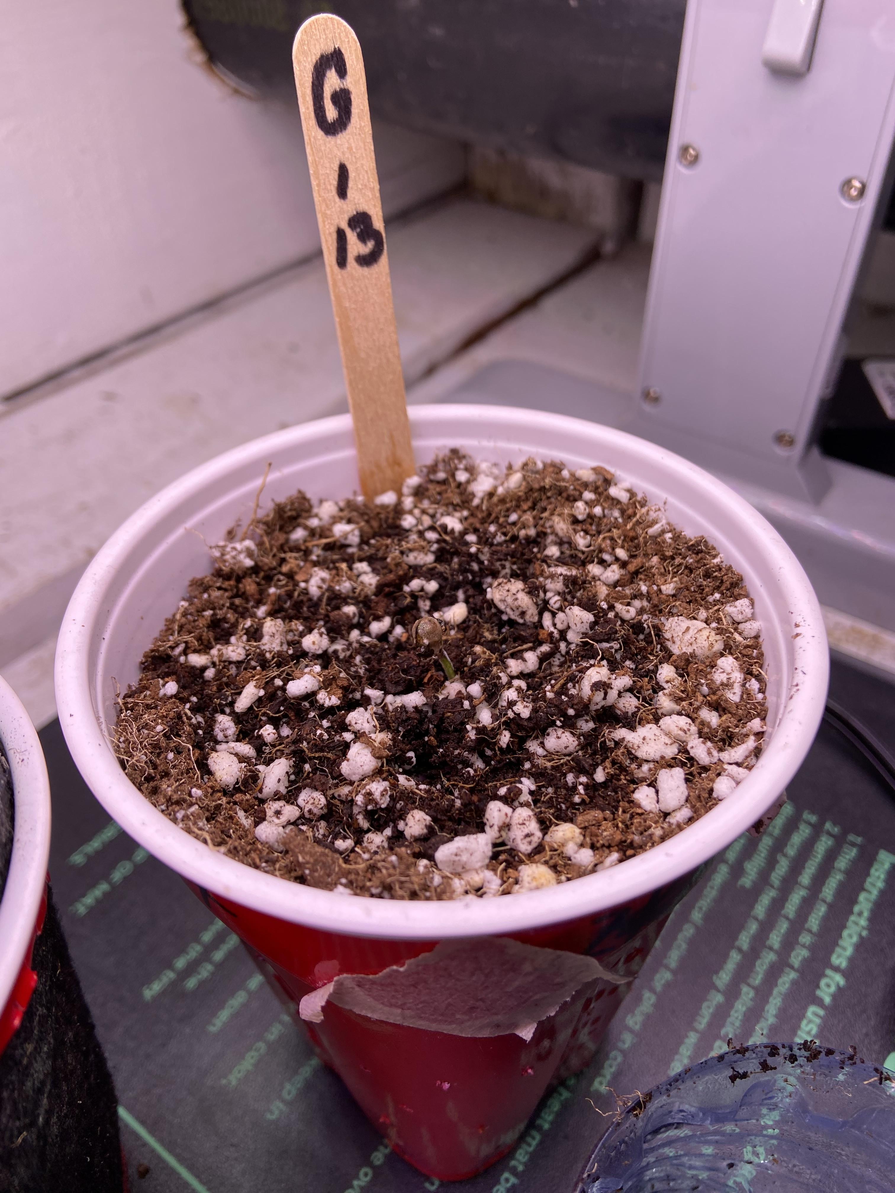 Well G(oofball)-13 has just put out a very impressive but wonky set of first leaves! Never had a first set come out with three leaves. Shes a bit lopsided, might need some extra care down the road but coming on strong!