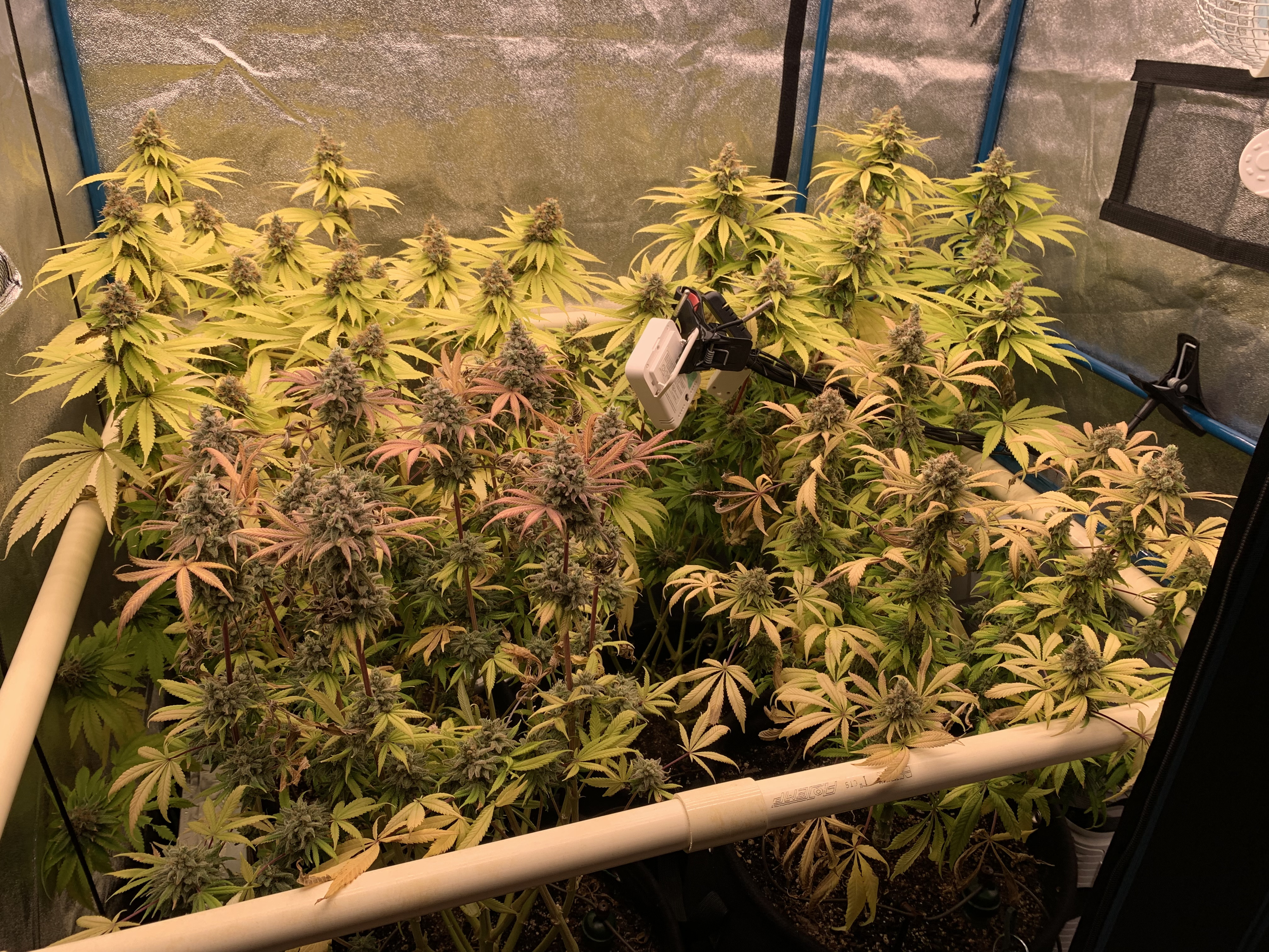 I suspect my foxtails are due to too much light rather than other stress like coming up a bit short on nutrients in my living soil at the end of the run. Obviously this can be done by dimming or raising your light. My light meter was around 750 PPFD for flower which seemed reasonable, but the buds are still foxtailing. Perhaps other factors are involved in this issue as well. I’ve refreshed myself on the Foxtail sections on GWE.