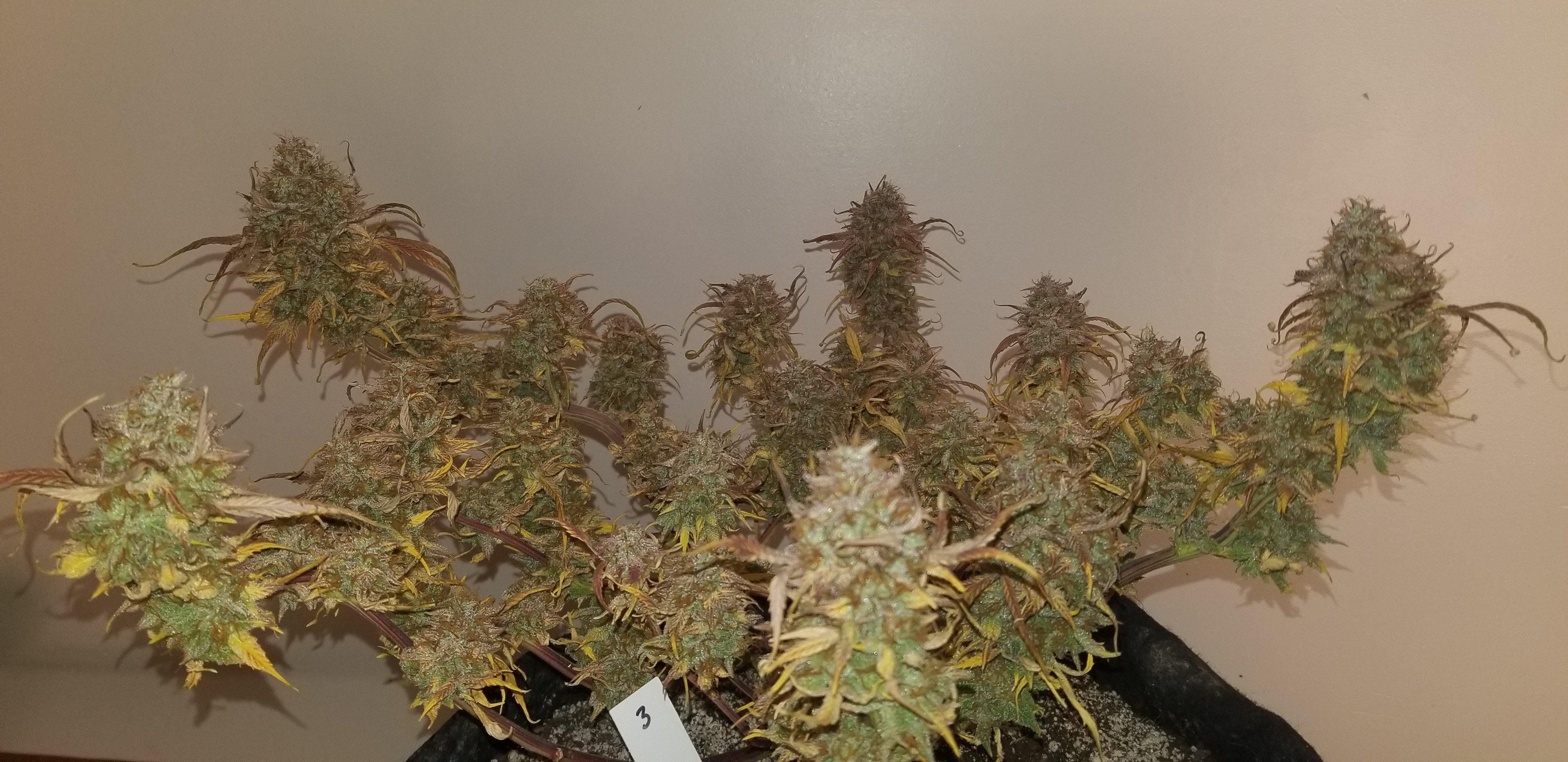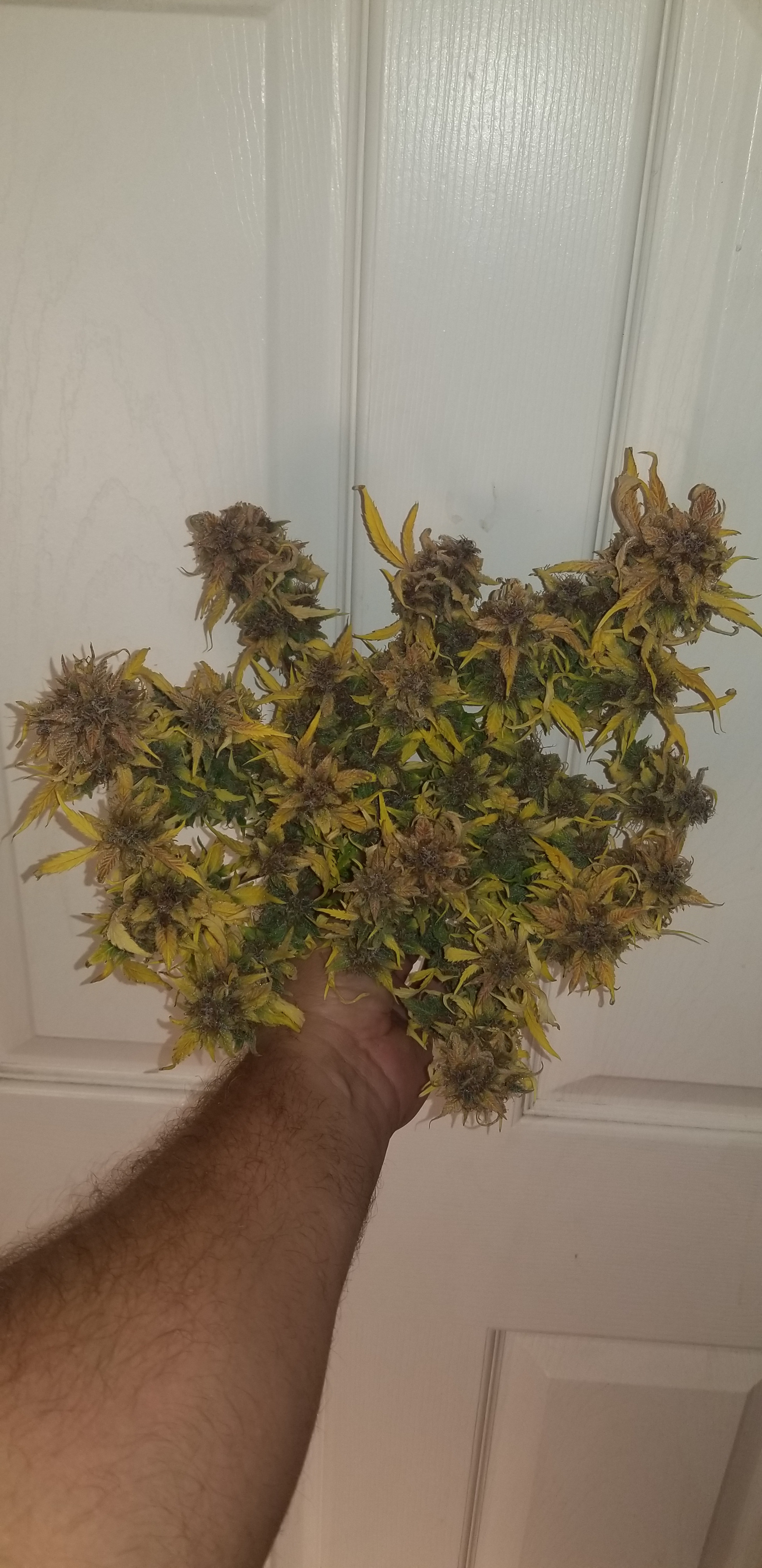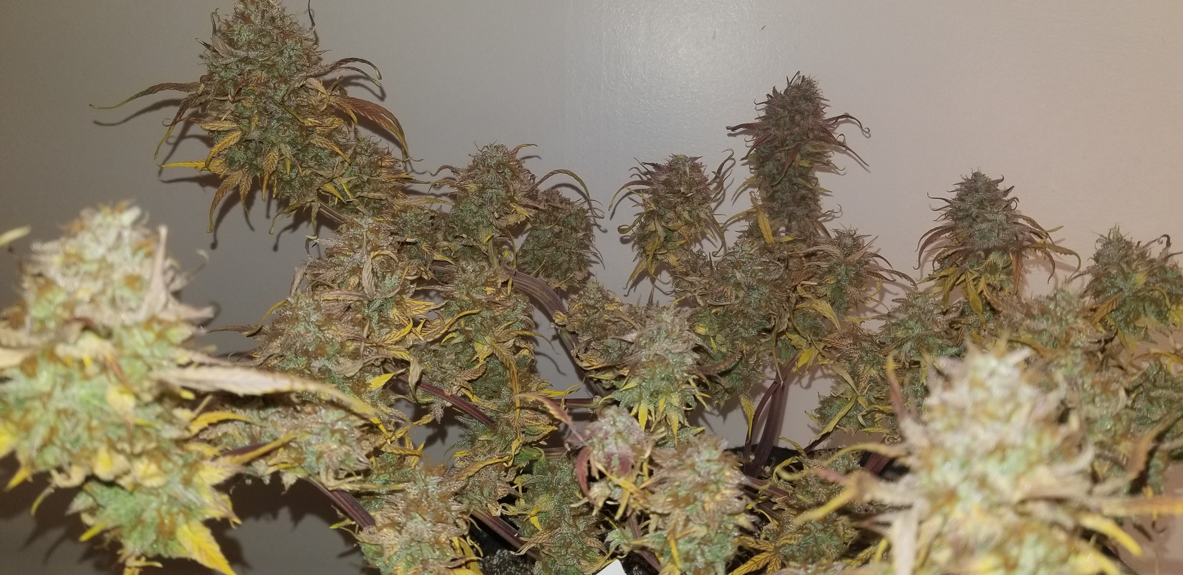 Don't beat yourself up bro. That's a fine harvest considering you got the beans from some random nobody on the net lol! No really. Hey I learned a lot from you being nice enough to grow them out. Them being nute sensitive on top of several other things. Thank you. I love her potency but she's still got a few kinks. Now I wish you had of done a 4 x4 grow like you suggested at the beginning just to see if it was soil related. They still look nice and sticky. Would like to here a potency comparison between scarlet and not scarlet buds by one of your buddies.keeping it green with the soil thing