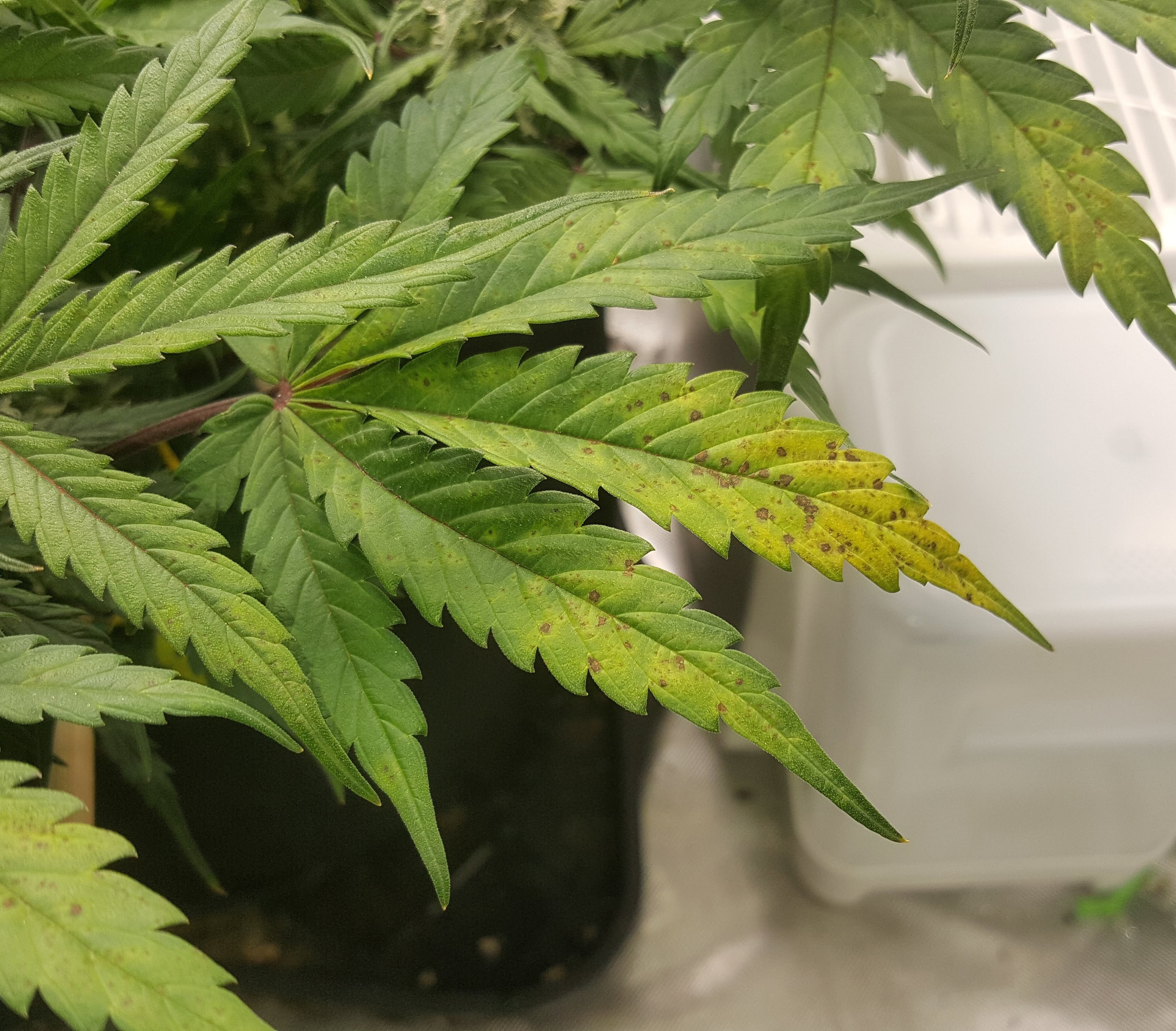 Seriously, this looks so much like the best color I've ever had this far in. The only reason I'm not in a panic is that it's always been so much worse... I think I can prune some of those upper fan leaves because usually they are dead by now!