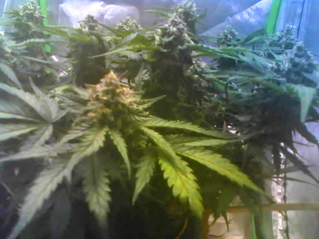 9 weeks - some plants are done in 9 weeks but this one is supposed to go 12-14. That would be great as she has 7 inch colas but they aren't thick yet. Introducing Canna-Cam. Image is horrible but it's a real time video feed. When you're stoned it's kind of fun to watch your marijuana grow when you're stoned.