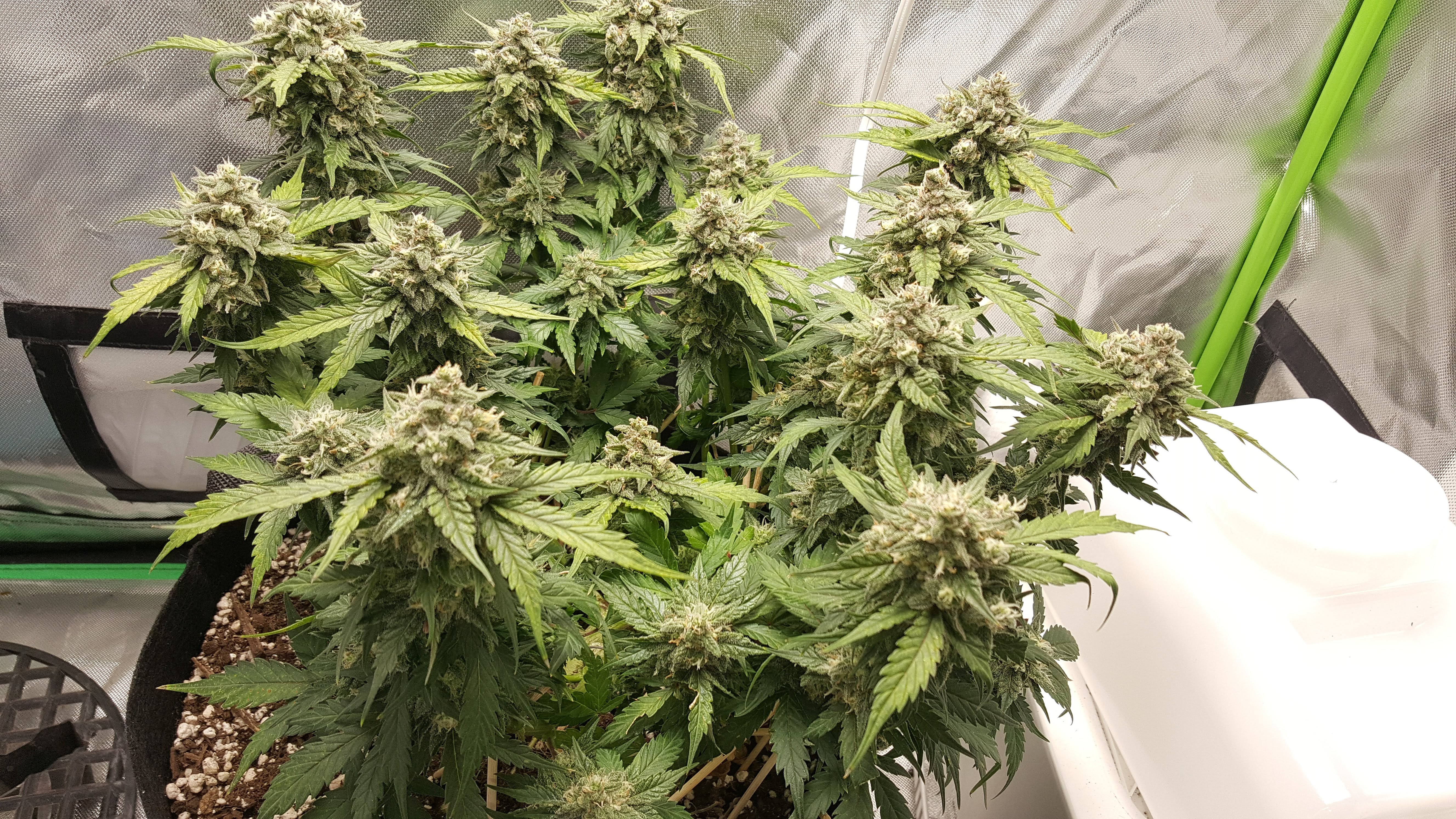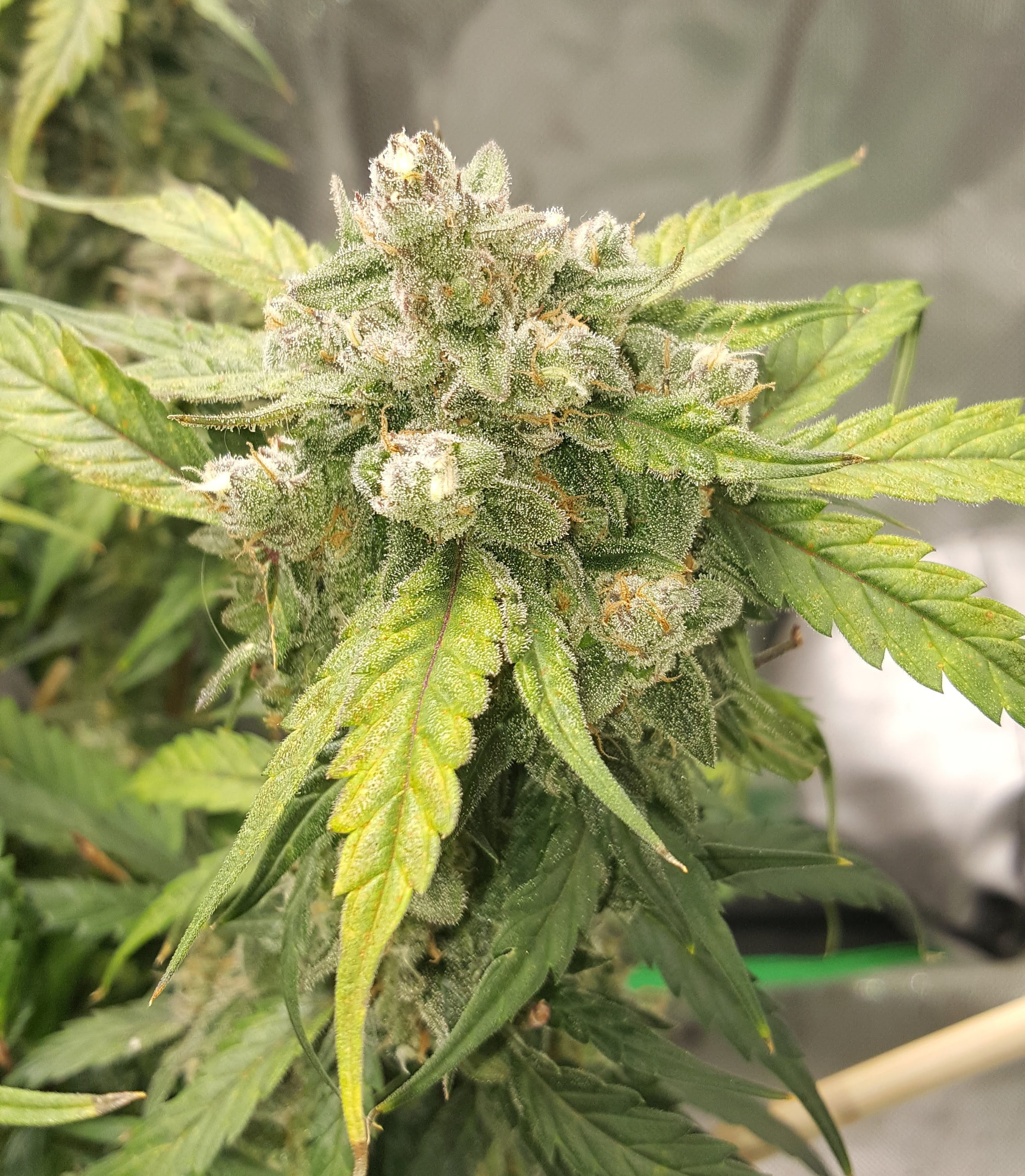 Day 73 - I guess this is as tall as it gets. 11.5 inches. Including trivet, 5 gal bag, 18" to the light and add on the light thickness then the total stack height is 44 inches... Although I have more space I think this grow would have worked on a 2x2x4' tent. Most of the pistals are golden but the trichomes are still many clear with none brown that I can see. There are a few white pistals at various heights so I don't think it's fox-tailing too much. (Please tell me if I'm wrong!) For me this is first grow where I've have green or greenish leaves at the end though there's still some time to go so good job Gizmo!
