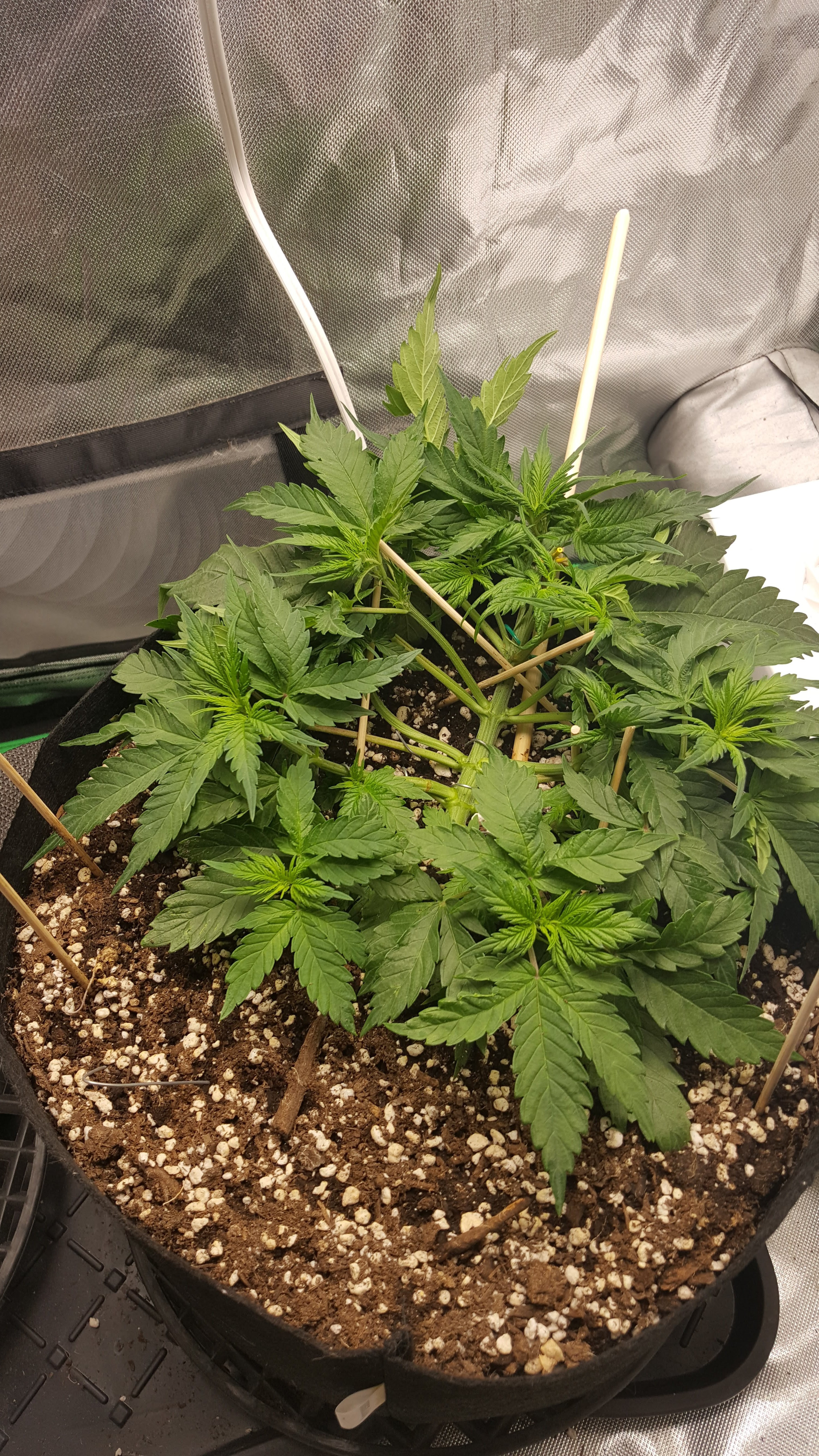 Day 30 - Tucked fan leaves under. Trimmed fan leaves node 1 and 2. Tied main stalk to bigger stick as it's now shooting over the side. Training is just pushing and tucking from here on out. She's getting big. Gave first full (5 gal) bag watering pHed plus SNS 209 (rosemary) bug repellent. Still not one drop of nute. Not one drop of nute... How will she know how much I love her if I don't fertilize her? I found out what I amended the used soil with: Hoffman Purely Organic Potting Soil Conditioner. One part of the conditioner with four parts of old soil.