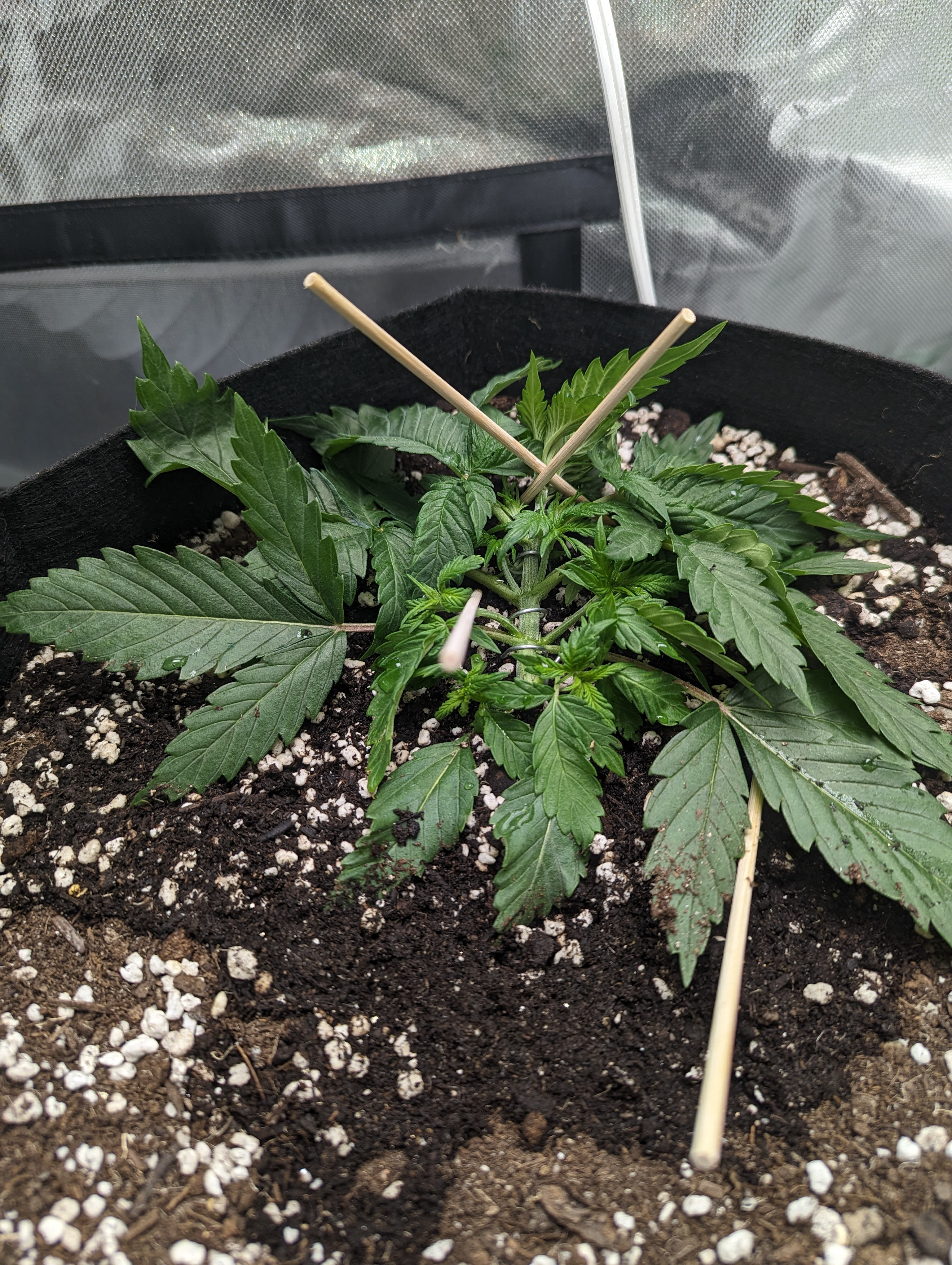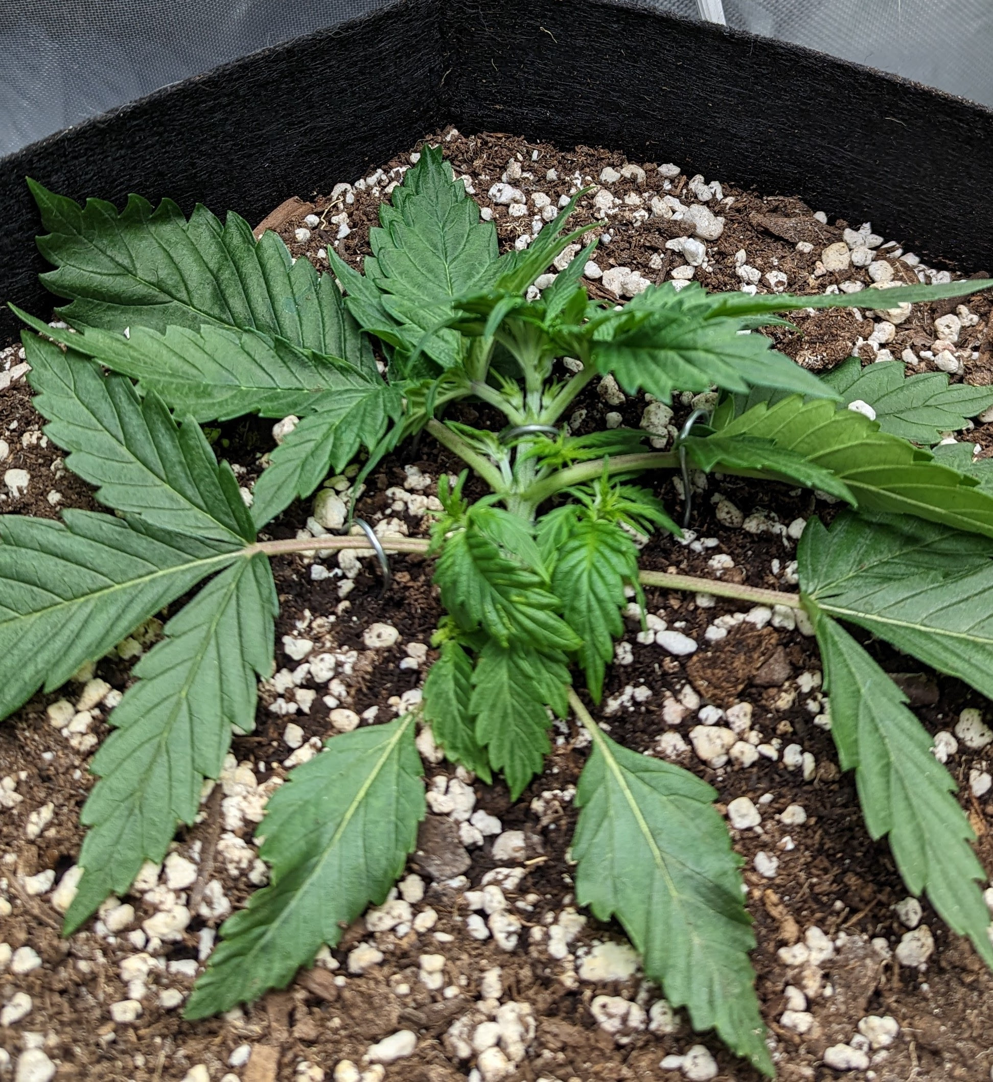 Day 20 - I did a little twist on the second node this morning mostly just fidgeting. I can see the fourth node spacing out from the third. It should be ready for a tug downward tomorrow. I read a recent post asking if 5 nodes was too soon to start LST. Definitely not! Might be there's no point starting as soon as I did but I think it helps to get as much light as possible to the lower nodes as soon as possible.