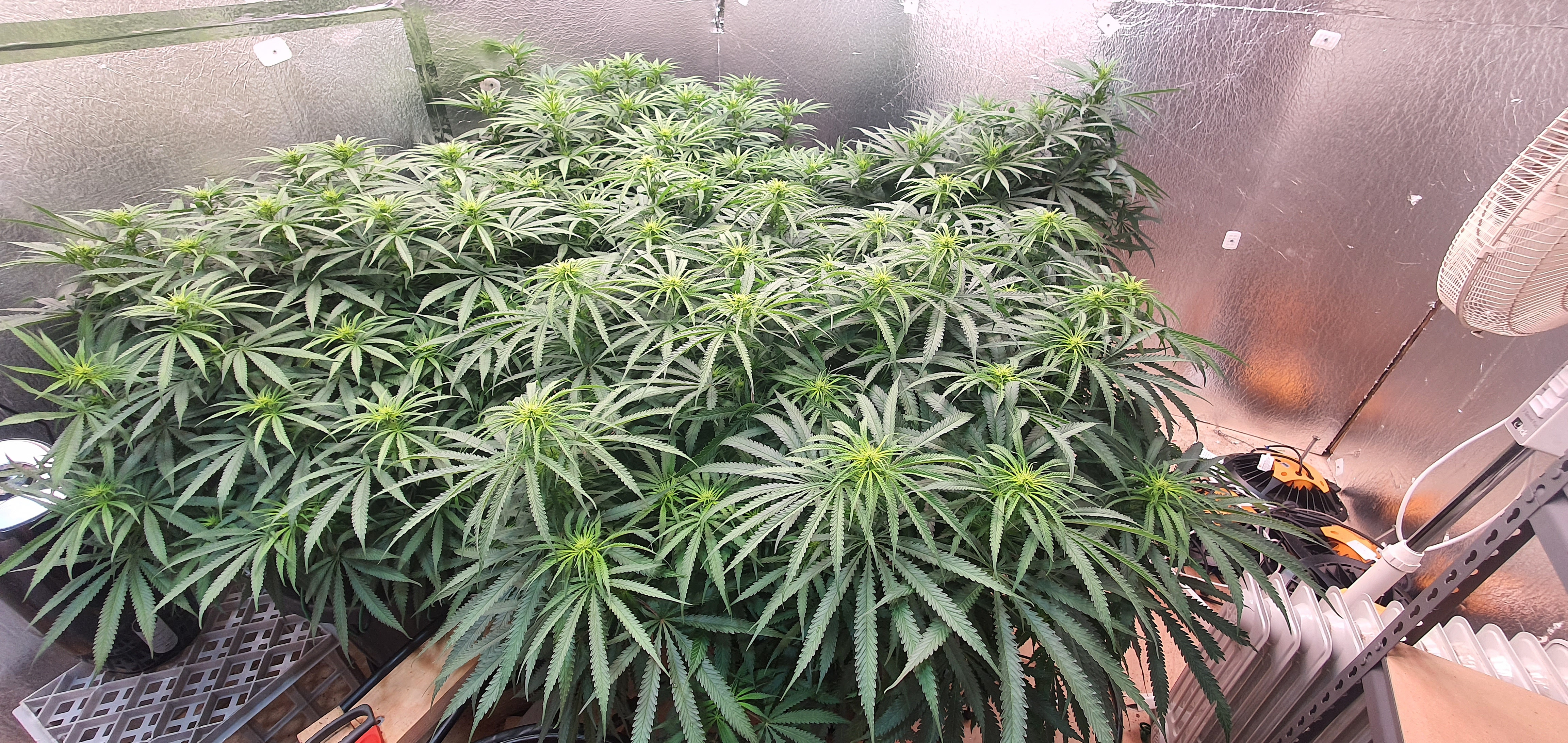 Flower Room: 11' x 7' x 7.5'H, 480w AC, 13gal/day dehumidifier, 1.5gal ultrasonic humidifier, 60gal (27gal usable) nute tank, 16" pedestal fan & 18" wall fan. Lighting and climate automated. Hand watering.