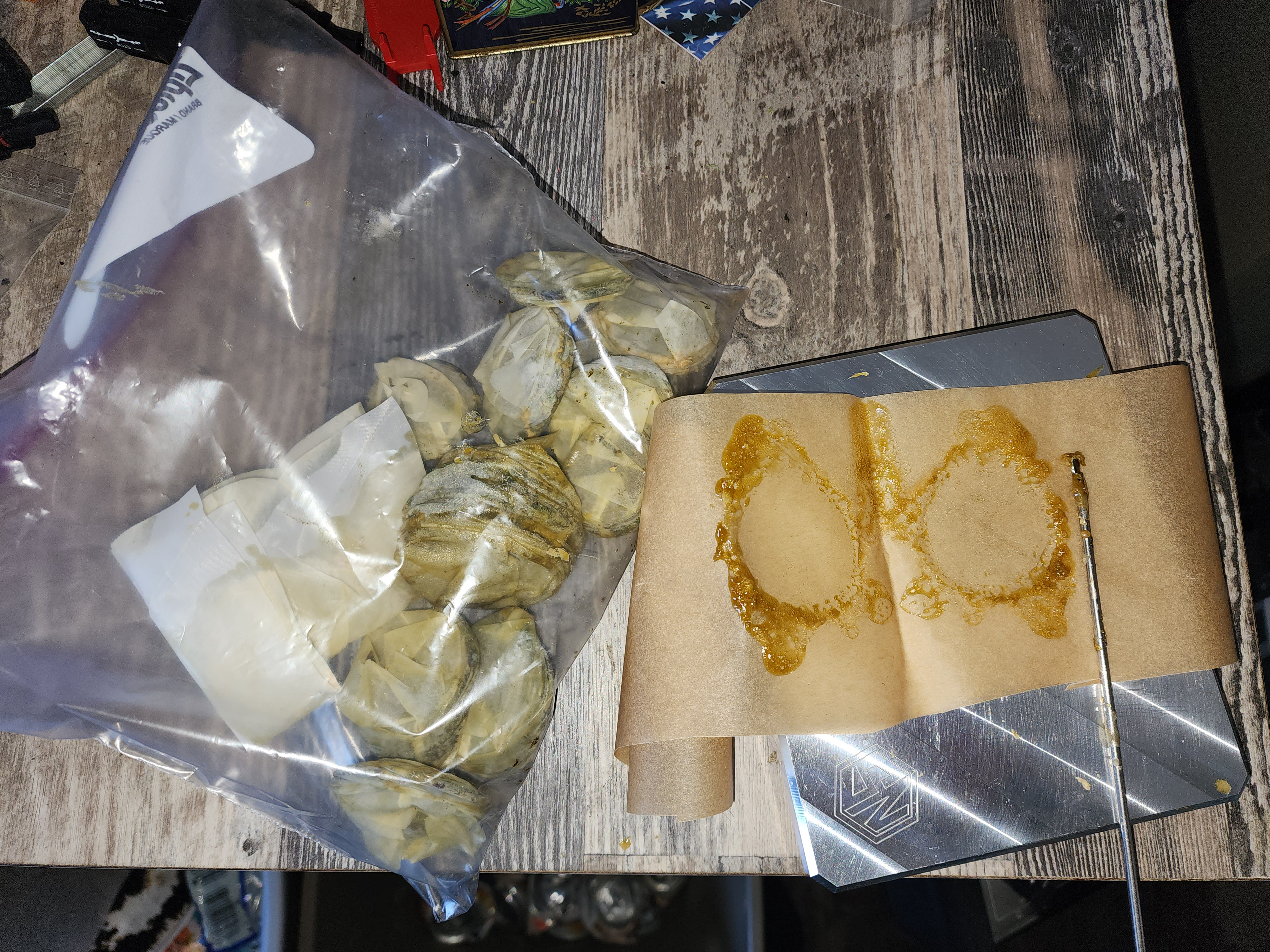 The "Oysters" are leftover pucks, with LOTS of good stuff left over. Thanks for asking. I will either decarb and make cannabutter or sugar-free chocolate cake, using MCT Oil. In this way, I stretch out my harvest to the maximum. My attempts at cannabutter have been much more successful than the MCT Oil. I wonder if the Nugsmasher "System" of decarbing (decarbing the rosin after press) isn't effective. When I called to ask, I got the obvious "company line", as she didn't answer what the difference would be with decarbing the flower first. Anyhoo, another tidbit for us rosin fans!!!