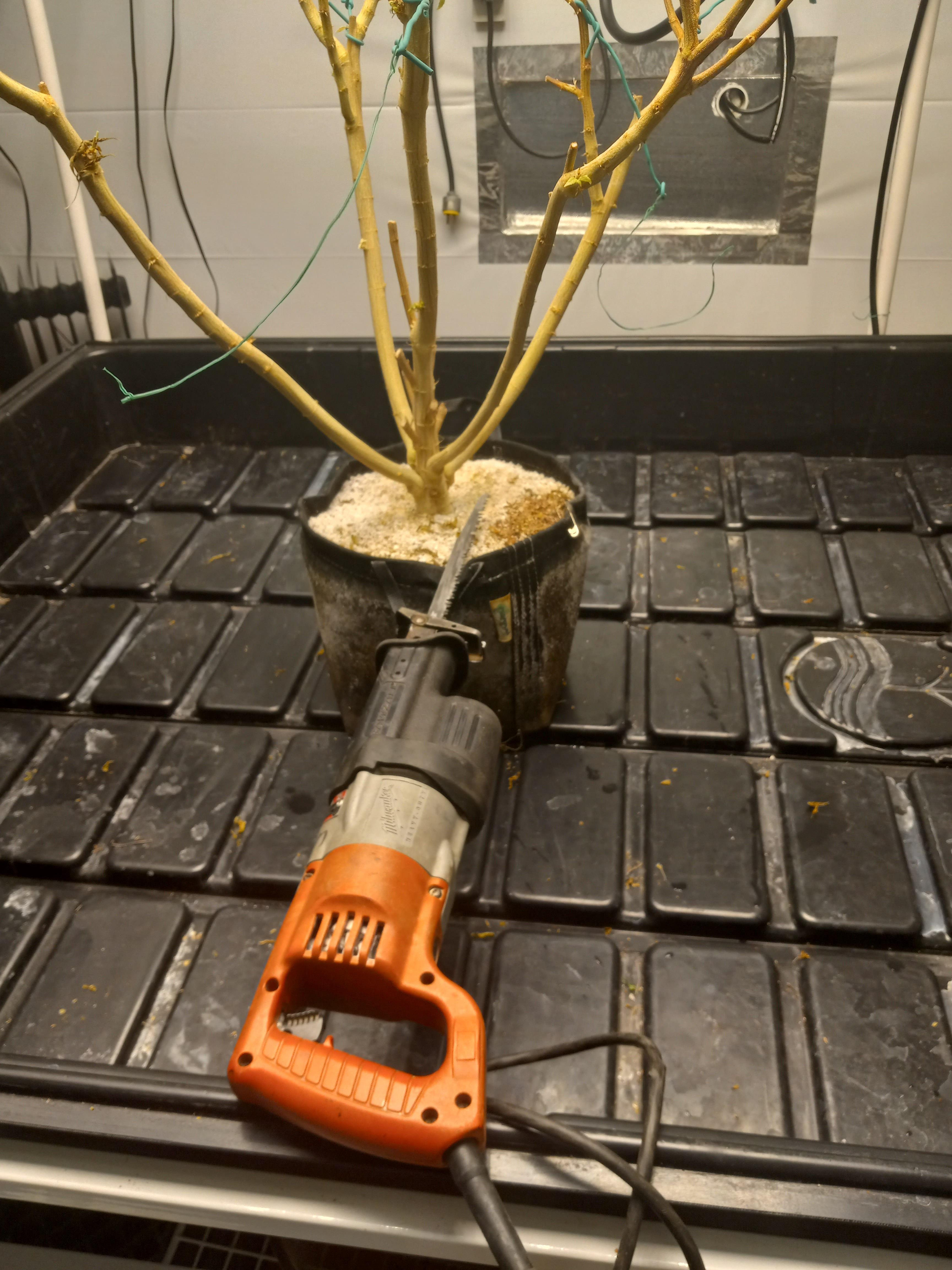 Ahhh men an their tools i mean toys one must hold the object firmly as to not allow the power tool to vibrate. For myself i hold the tree trunk with one hand a slam the shit out of it on my cement wall till the roots loosin from the pot viking style