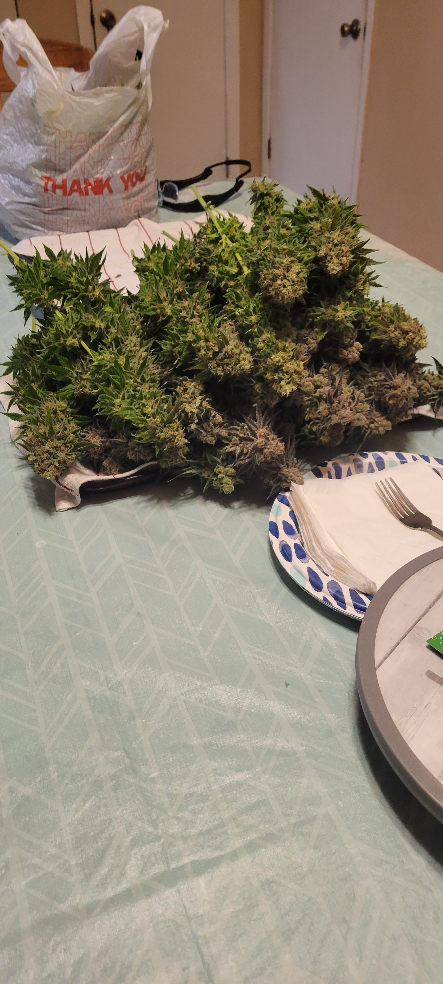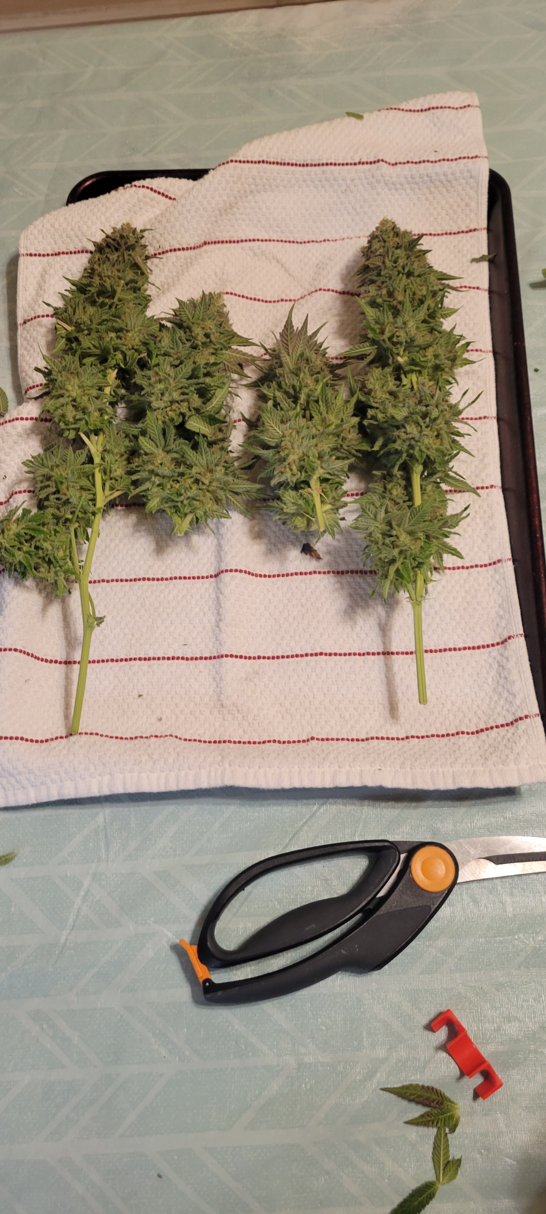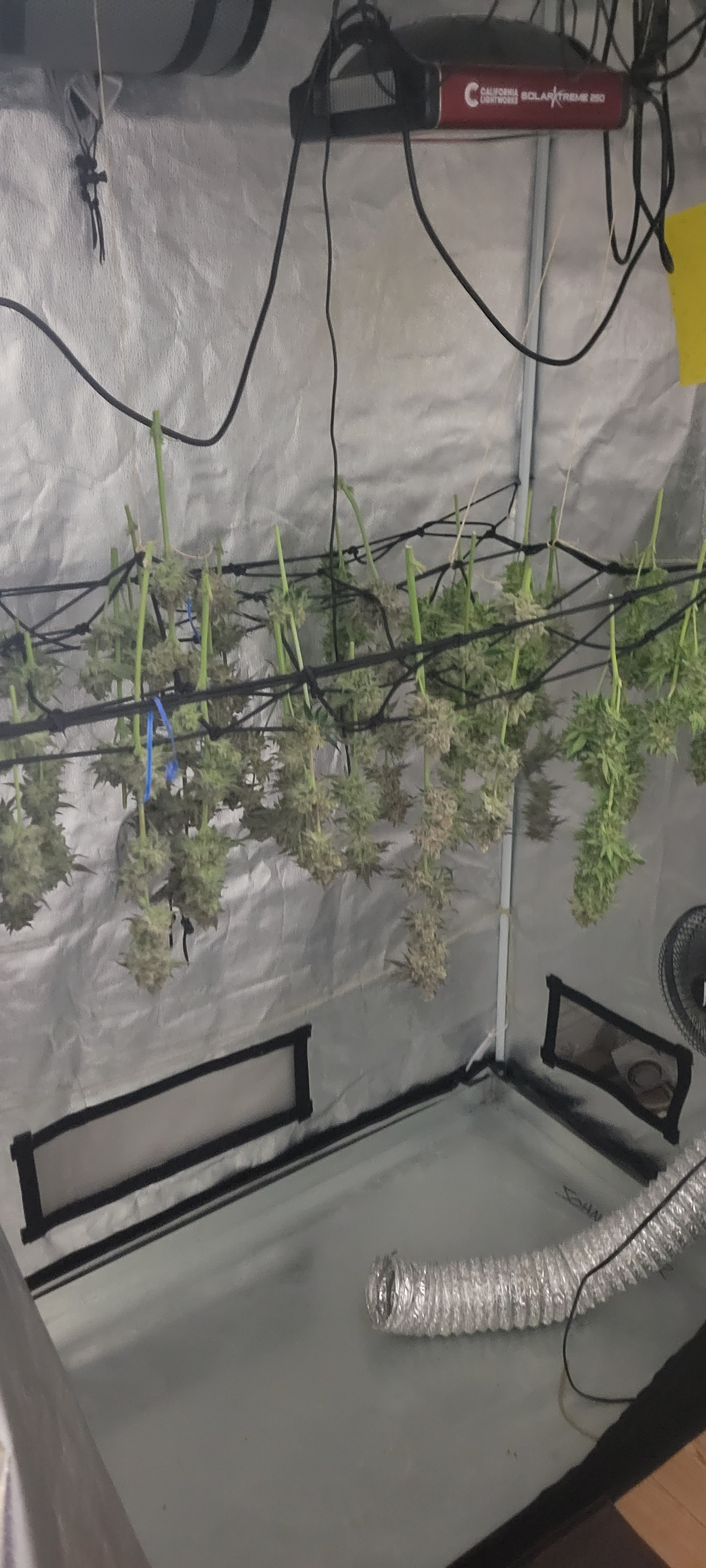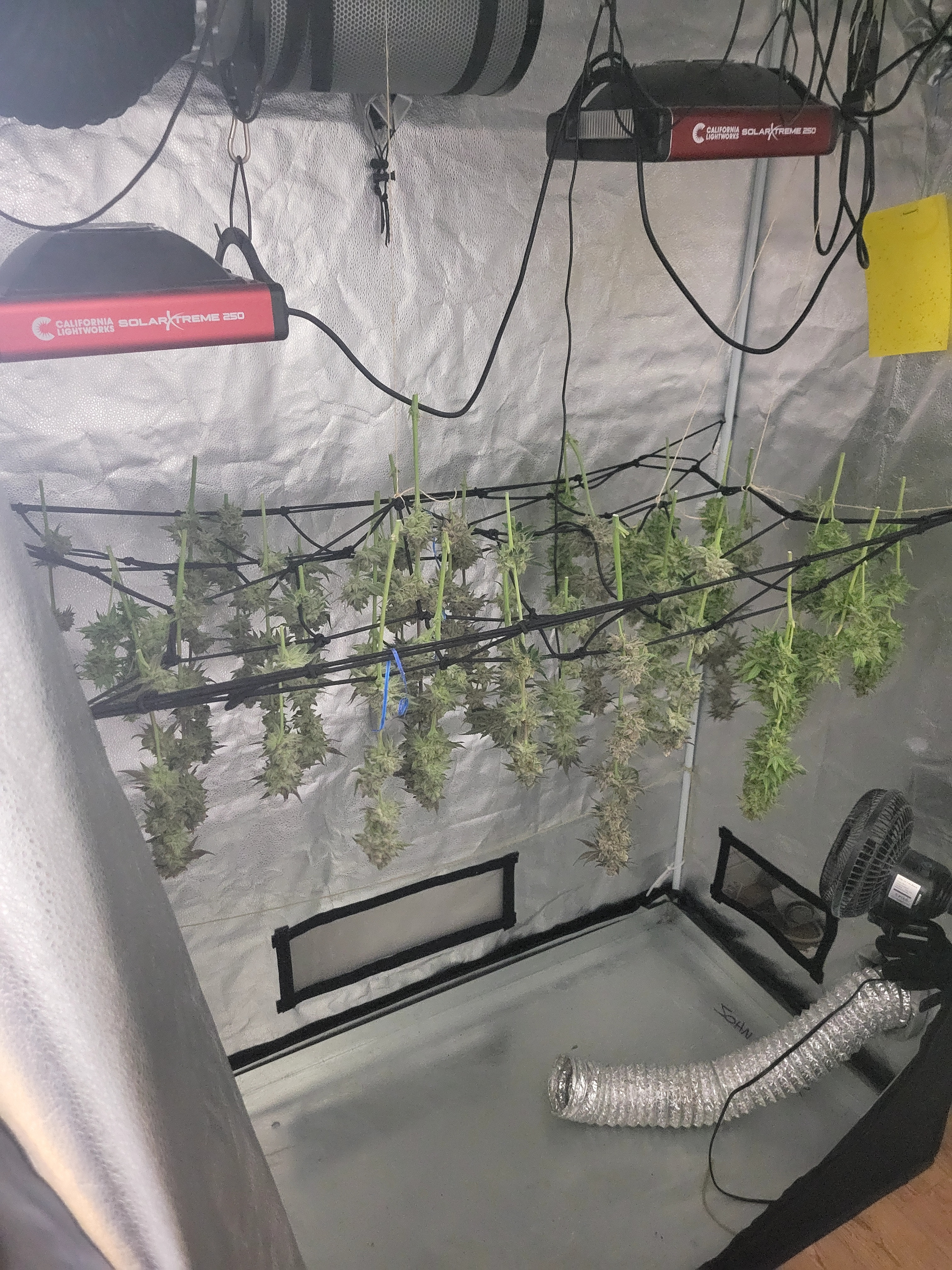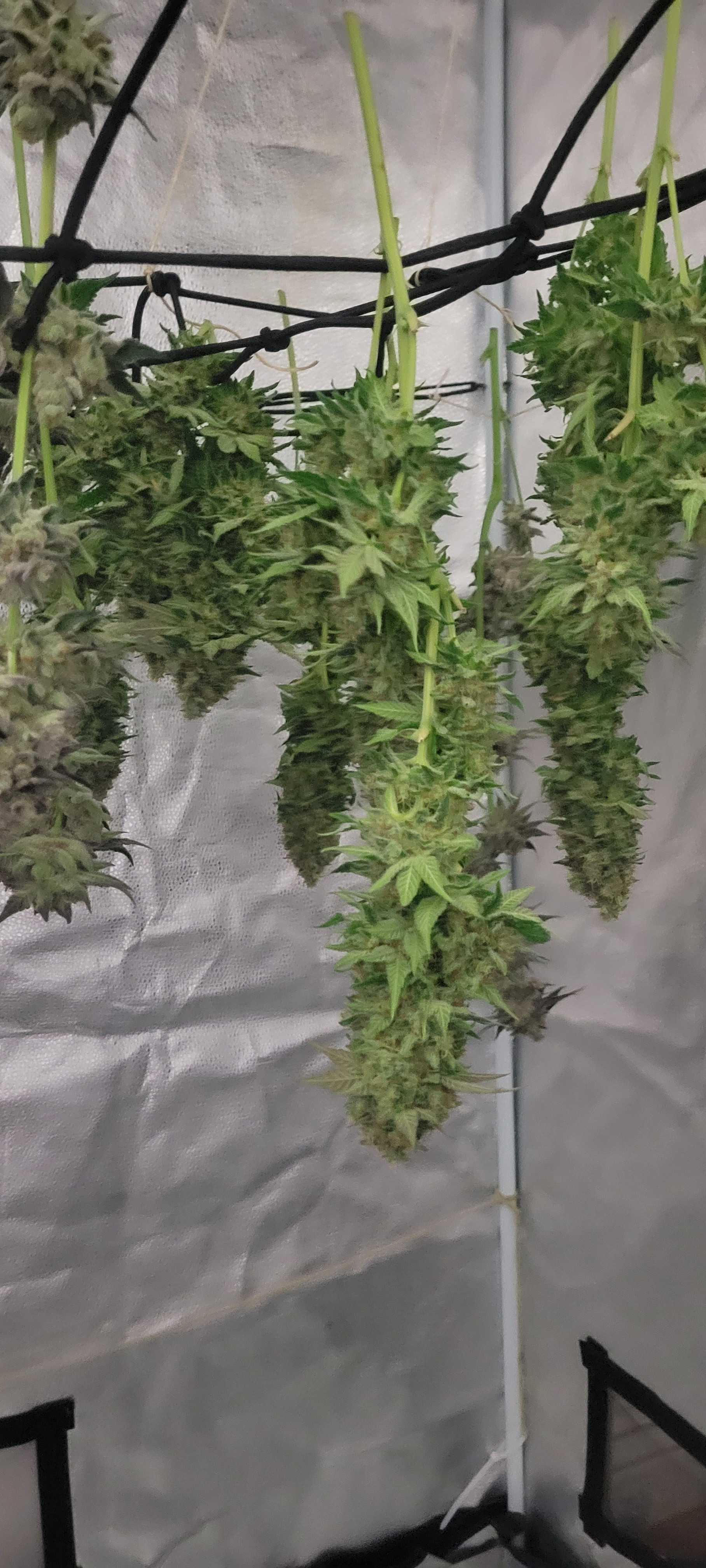 What a great way to start the day in my part of the world. Great looking harvest. I like using the scrog net to hang/dry the flower. Hadn't considered that but I don't especially like using clothes pins and usually just hang the buds on a string by a stem, but I don't like putting up the string, the scrog may just be the ticket.Growing Autos and Photos, Gorilla Grow tents, AC Infinity fans, exhaust, filter, humidifier, and controller, HLG Lamps, 50/50 Coco/Perlite, Autopot system, BlueLab PH Controller, CX Horticulture nutrients