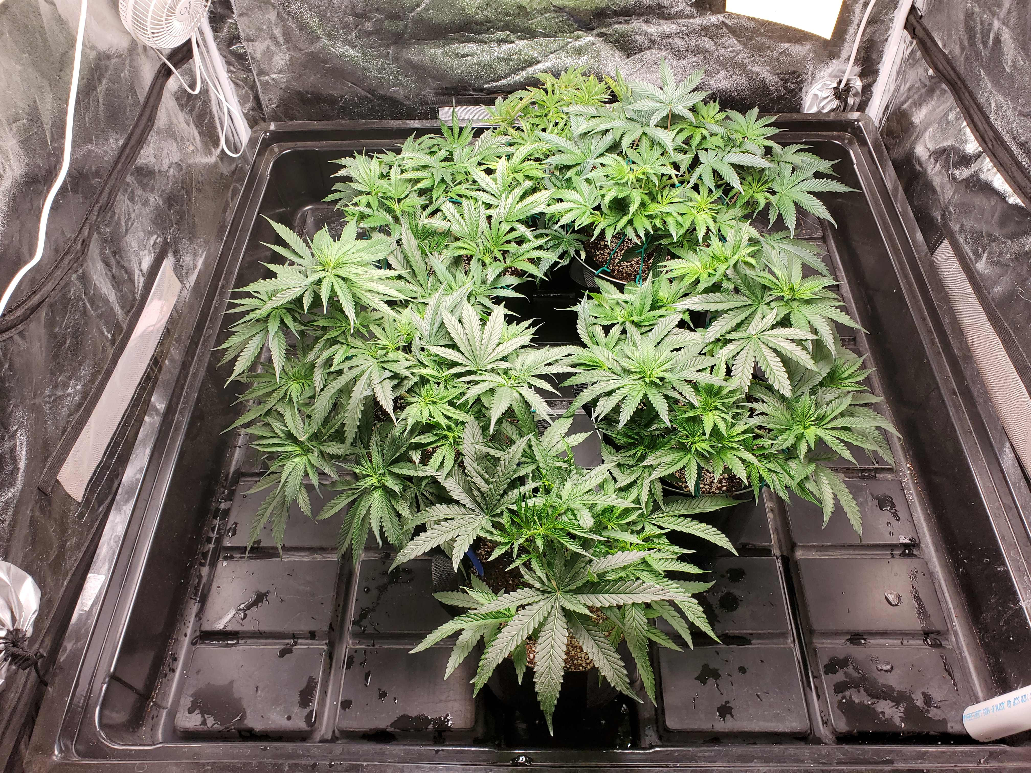 The photo tent has come out of 36 hour blackout. They all look happy. Not sure if it shows in the pix, all the centers are light green. Growth during blackout, hormones, something else? They are on their way for the flowers to come.