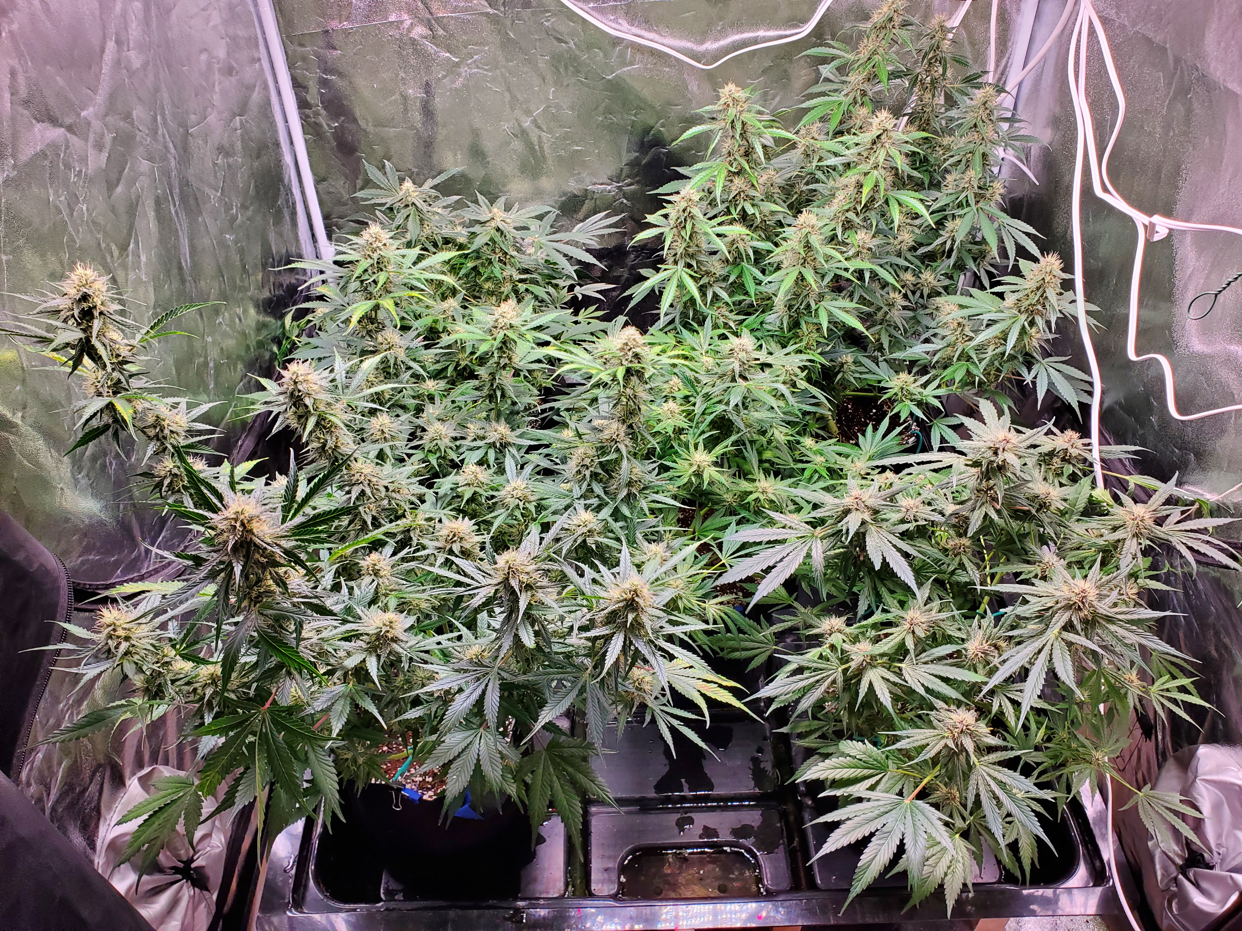 The bloom tent is humming along. They keep growing and growing, the stretch is starting but no sign of flower buds yet. I'm waiting. The experimental blooming seedlings, front left, are growing well. They have no clue what is happening.
