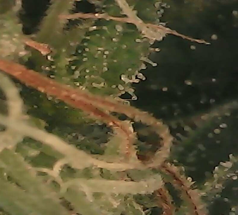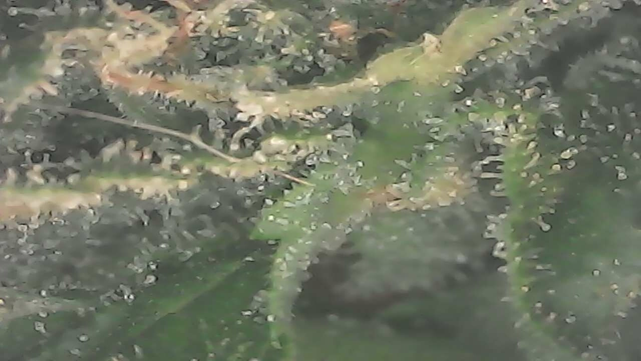 Its been Very cool the last week, over nights in the low 40's no bright sun to speak of, mostly cloudy. Just got done pouring for 2 hours so ill have to blast the girls with the leaf blower today. My Gusher plant has begun to re-veg fer fuck sakes! Thanks to a motion sensor camera that follows movement with a really bright spotlight...and a really persistent spider that wouldnt fuck off. kept setting the camera and light off i think. White widow and Sour diesel are doing ok, im amazed at how much crud gets stuck in them every day. Lots of feathers lately..got a hawk that's terrorizing the morning doves.
