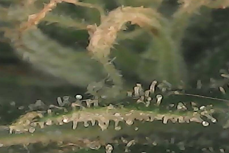 3x Strawberry Cough - That snuck up on me. I was adjusting some buds on the net yesterday and my hand came away wet and sticky. Today I snipped a small bud and brought it in for a look see. The trics are cloudy and clear. I didn't see anything like dark pistils with my eyes but the (cheap and crappy) microscope shows that some are starting to turn. I cut up a bit of it and put it wet and green into my vape. Weak flavor no cough I suppose from the water vapor but definitely a buzz. Seems like it's always "two weeks" until it's done.