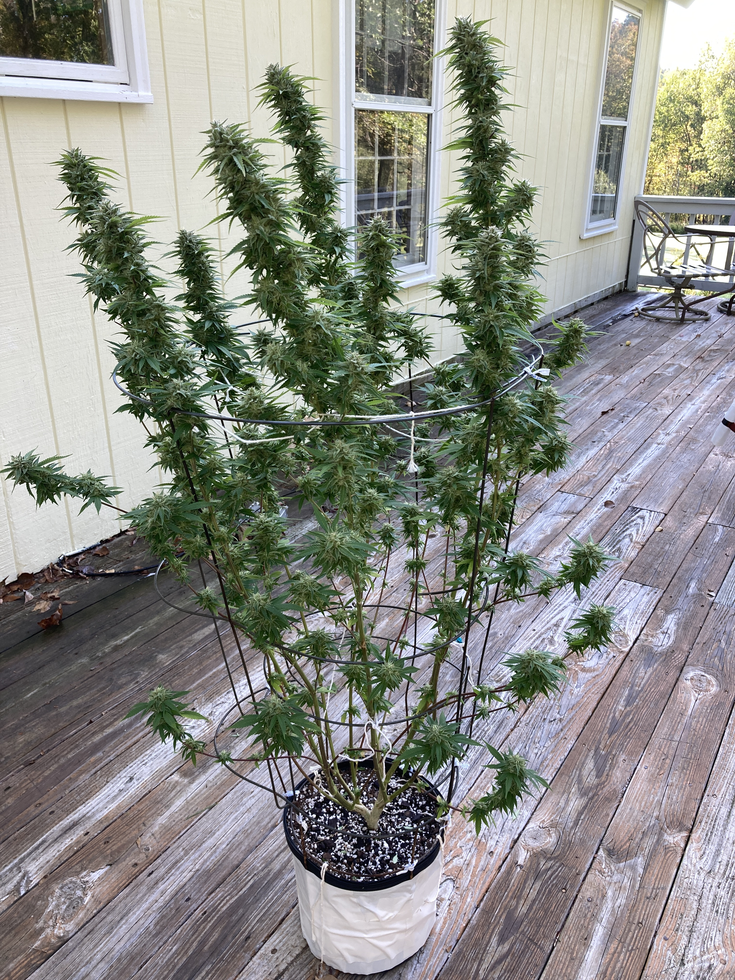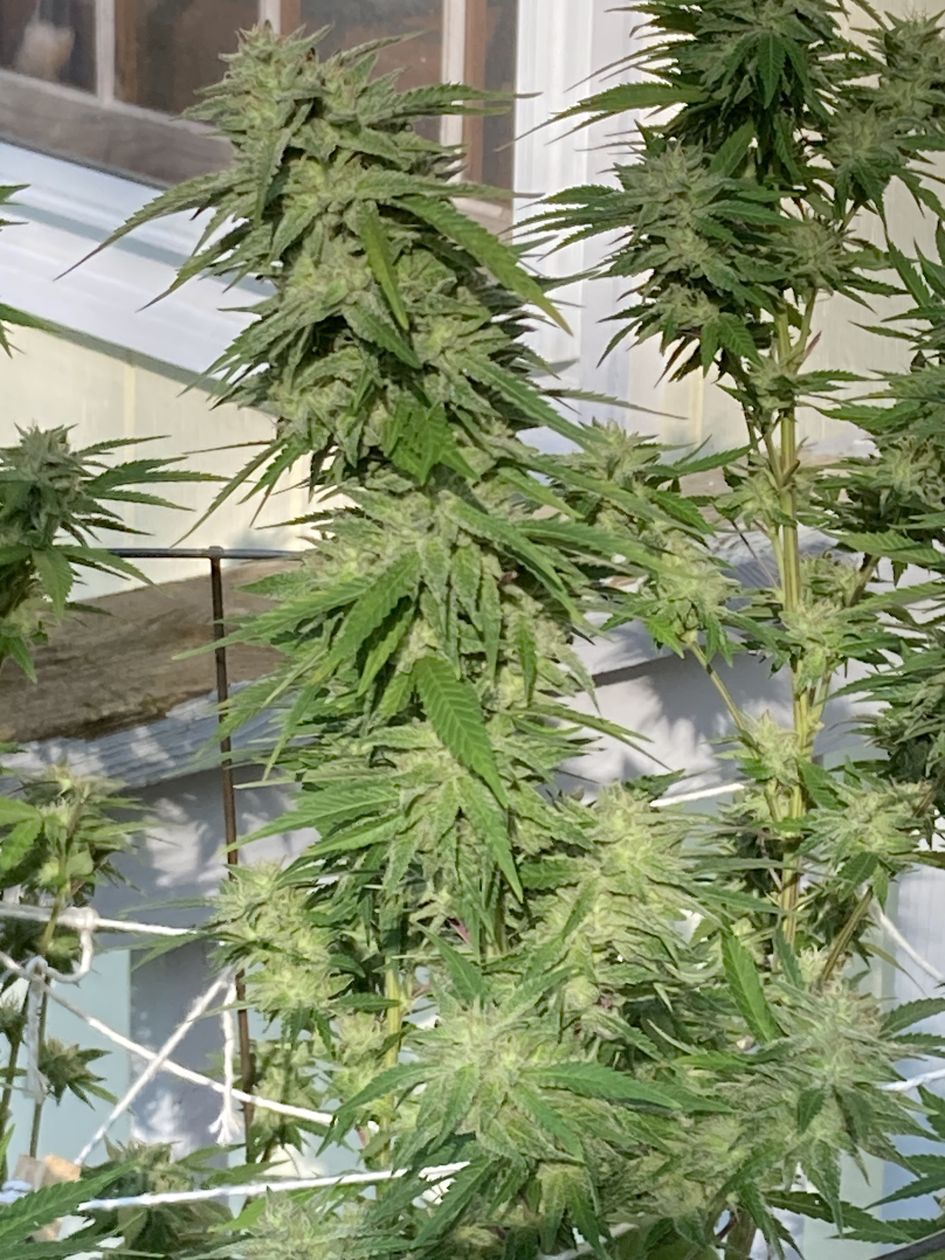 Goodmorning to all finally posting my pics i took 3days ago. I wanted to show a double headed bud from a wedding cake strain along with the full pic of the plant next to it. We are rapidly going into fall here now and very cool a.m. with just a few days left before the rain is predicted so i've moved 3 shorter plants into the small greenhouse and the rest under my patio. We had a surprise shower yesterday morning an plants were left out in the rain. Luckly the sun came out later an we had a good breeze drying them out. Now they have protection i sure don't want any mold/rot after 6months of care. Last 2 are the ones that will be taking up the greenhouse and super cropped once i harvest the smaller ones. Looking at taking one on Saturday it's suppose to rain and maybe 2 more mid week. Freak show still about 2wks out. I have stringers hanging in my garage and will begin removing larger fans pre chop. Catipillers are here not huge problem/investation but they are showing now so that's my sign to begin cutting back on the watering for the cloudy/amber ones.