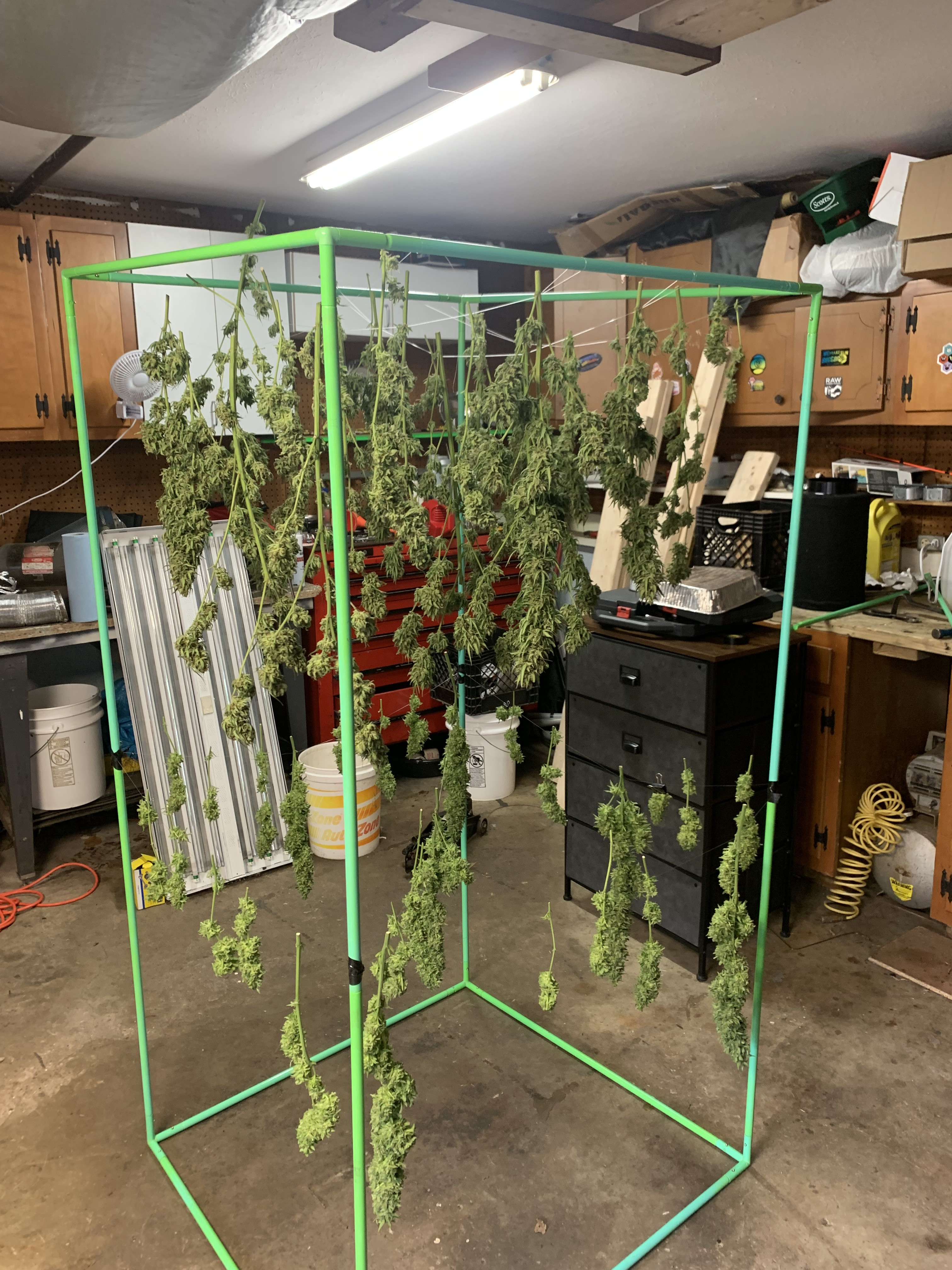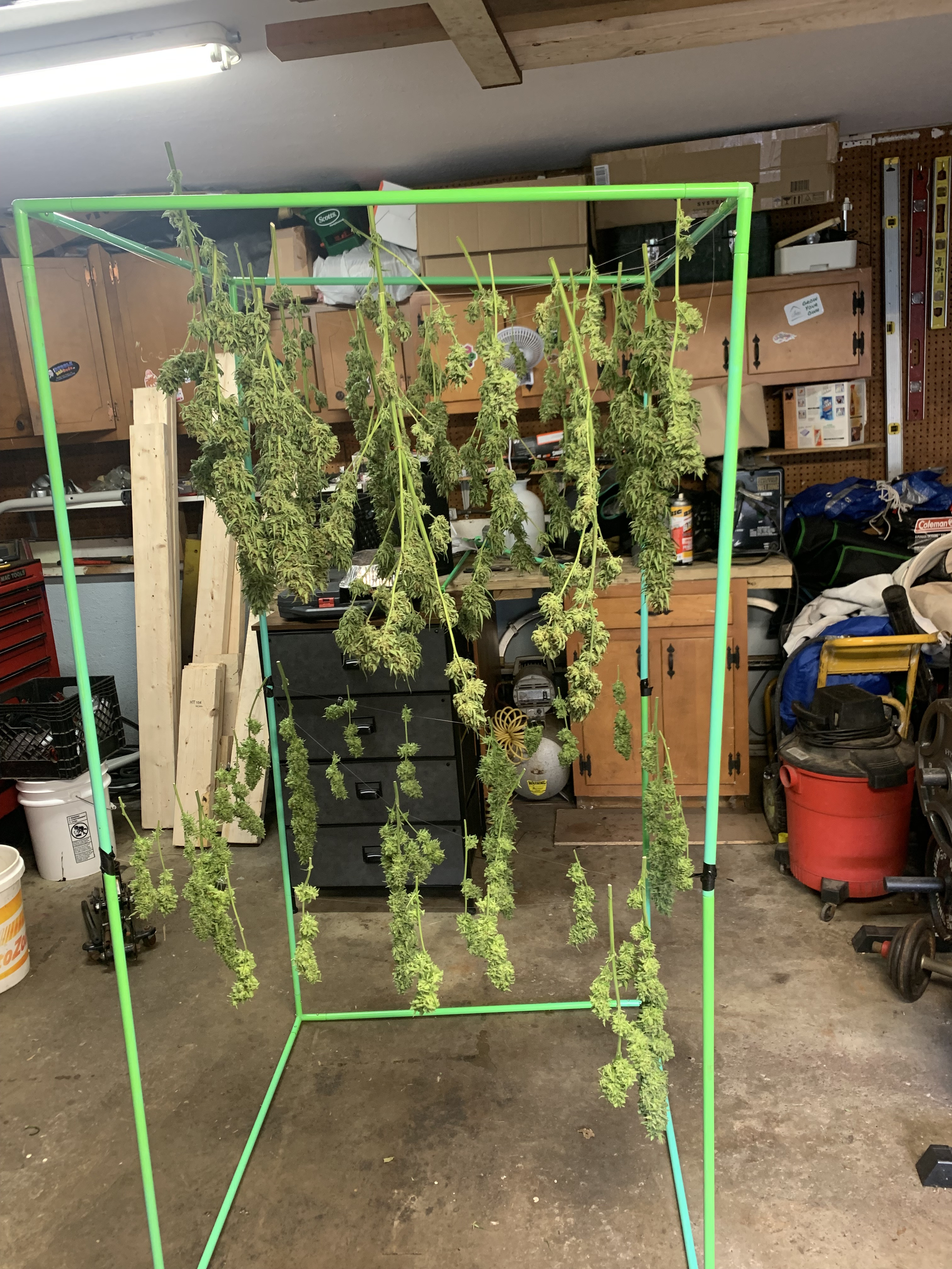 Took down Franklins Hindu Hogg. Took the frame of my grow tent and ran some 10 pound test fishing line to hang the duds. If you have been lucky enough to be gifted any of these seeds from Franklin you should grow them. Flowers early. It has been a joy growing.