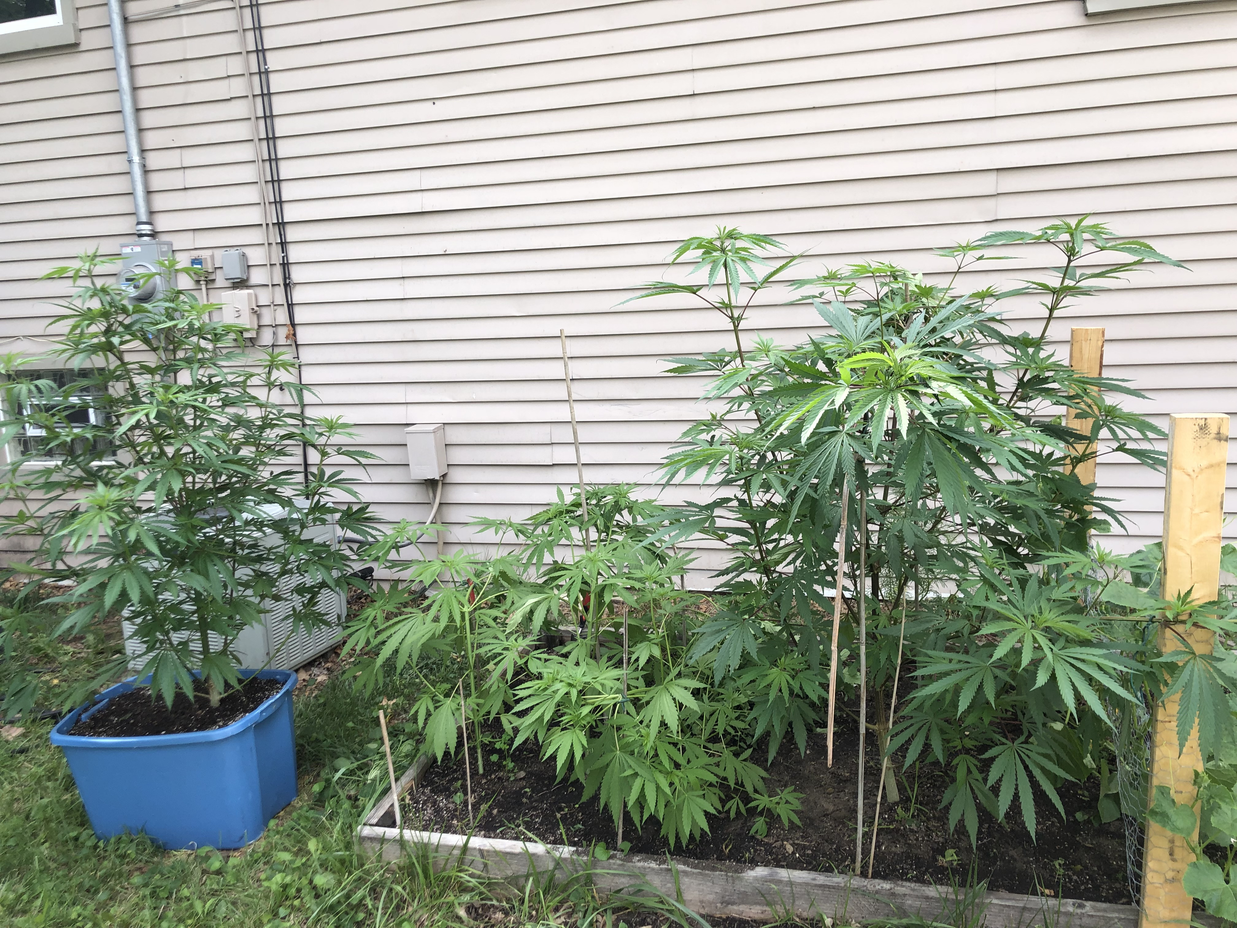 The misfits.... Wound up having a few extra plants this year. Had two choices, trash um. OR move them all over the backyard everyday to catch the sun rays(done it before,its a terrible idea) I went with the terrible idea lol. Slow learner. Even Hildeguard thinks im nuts. We have a White Widow clone, and a Sour diesel and a Gusher from seed. Grown in soil/compost and fed with pond water and fresh fish poop! Let the good times roll...