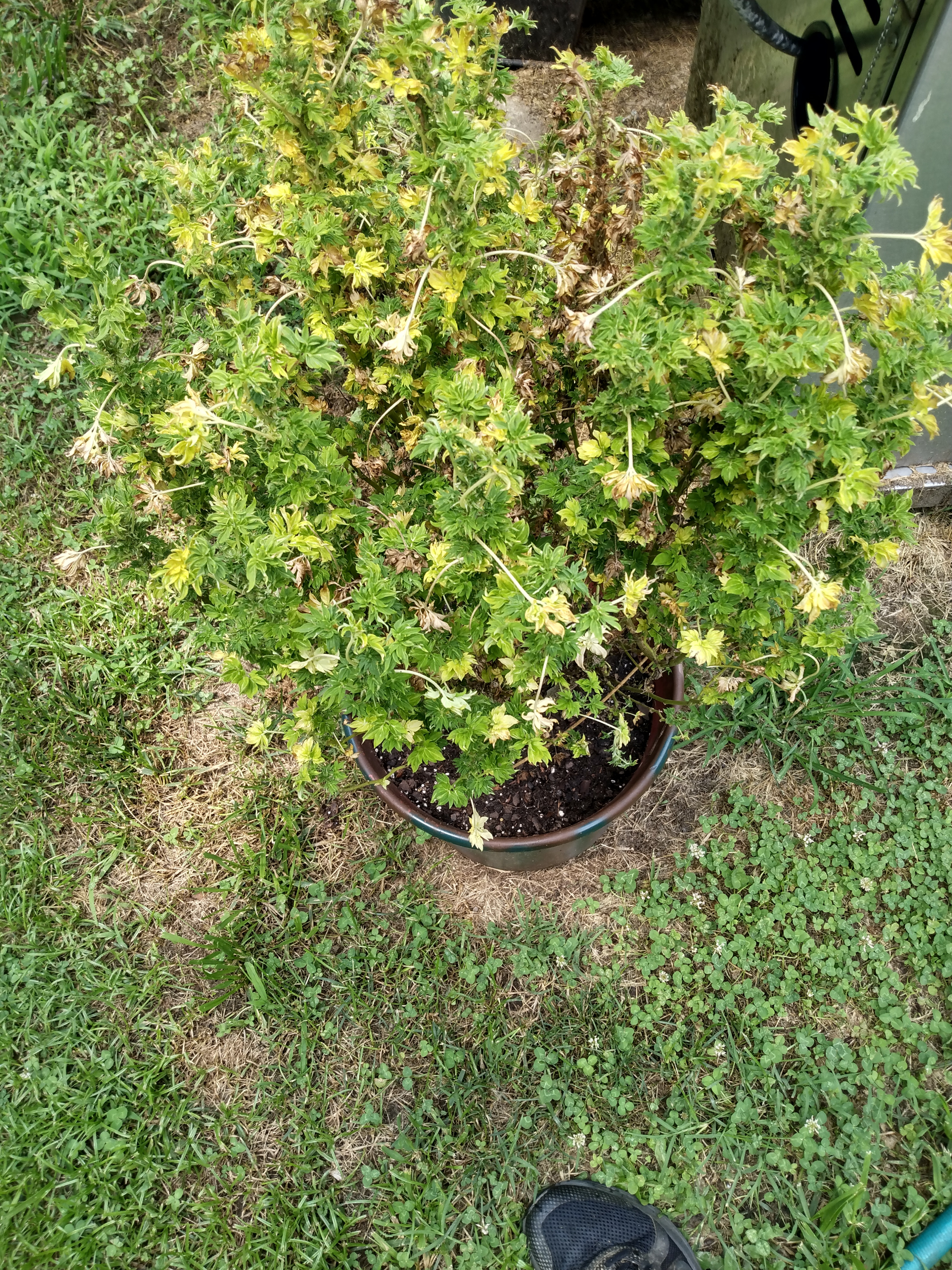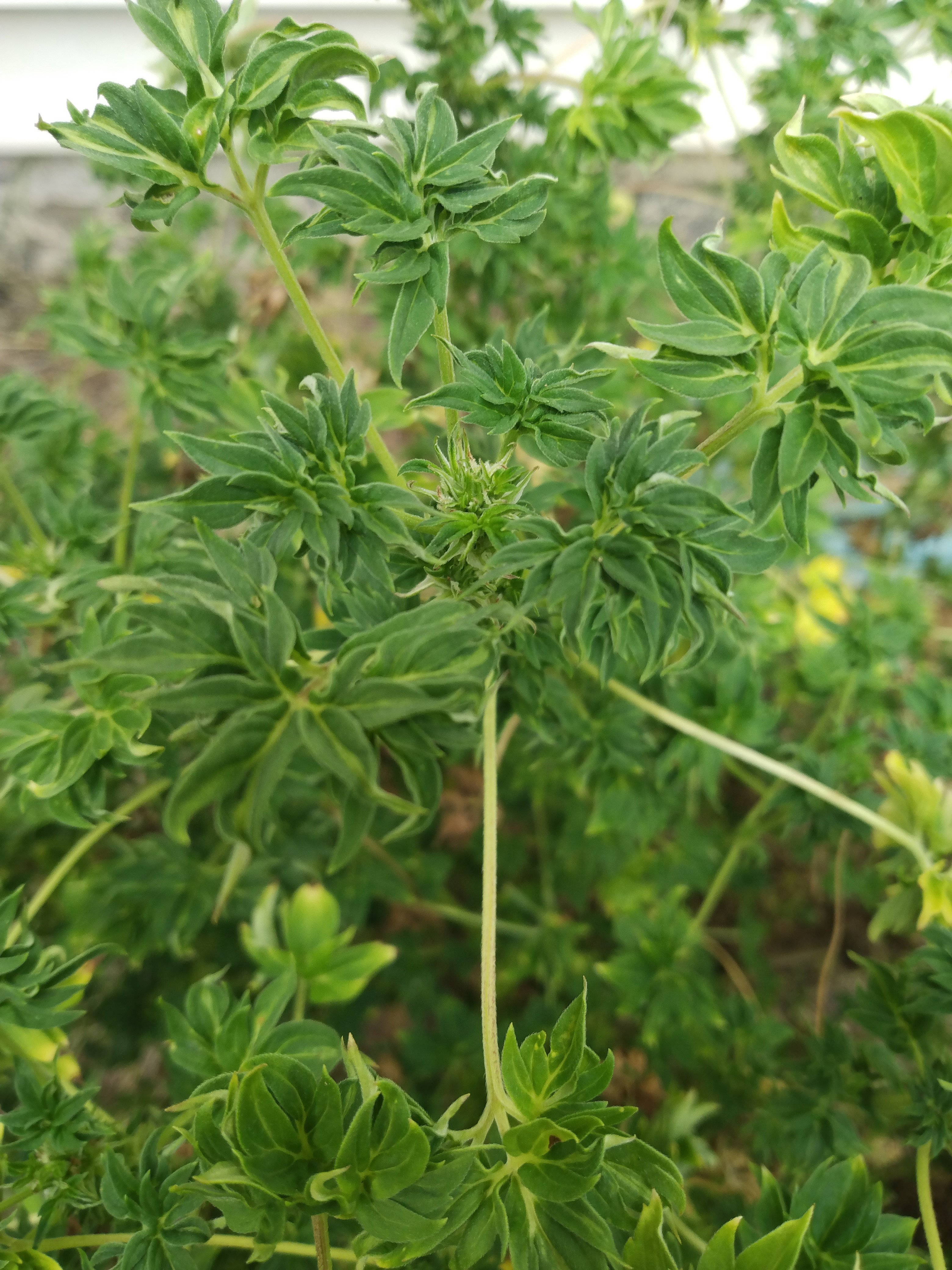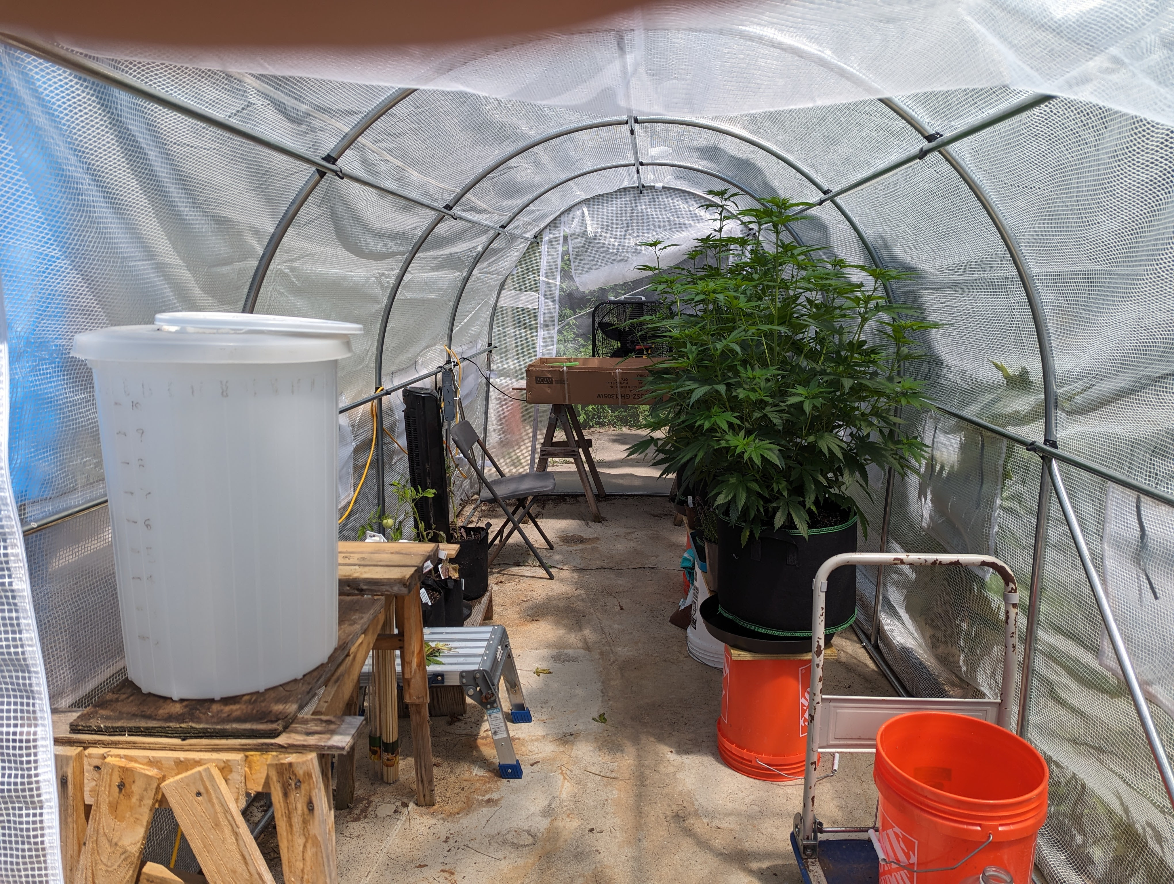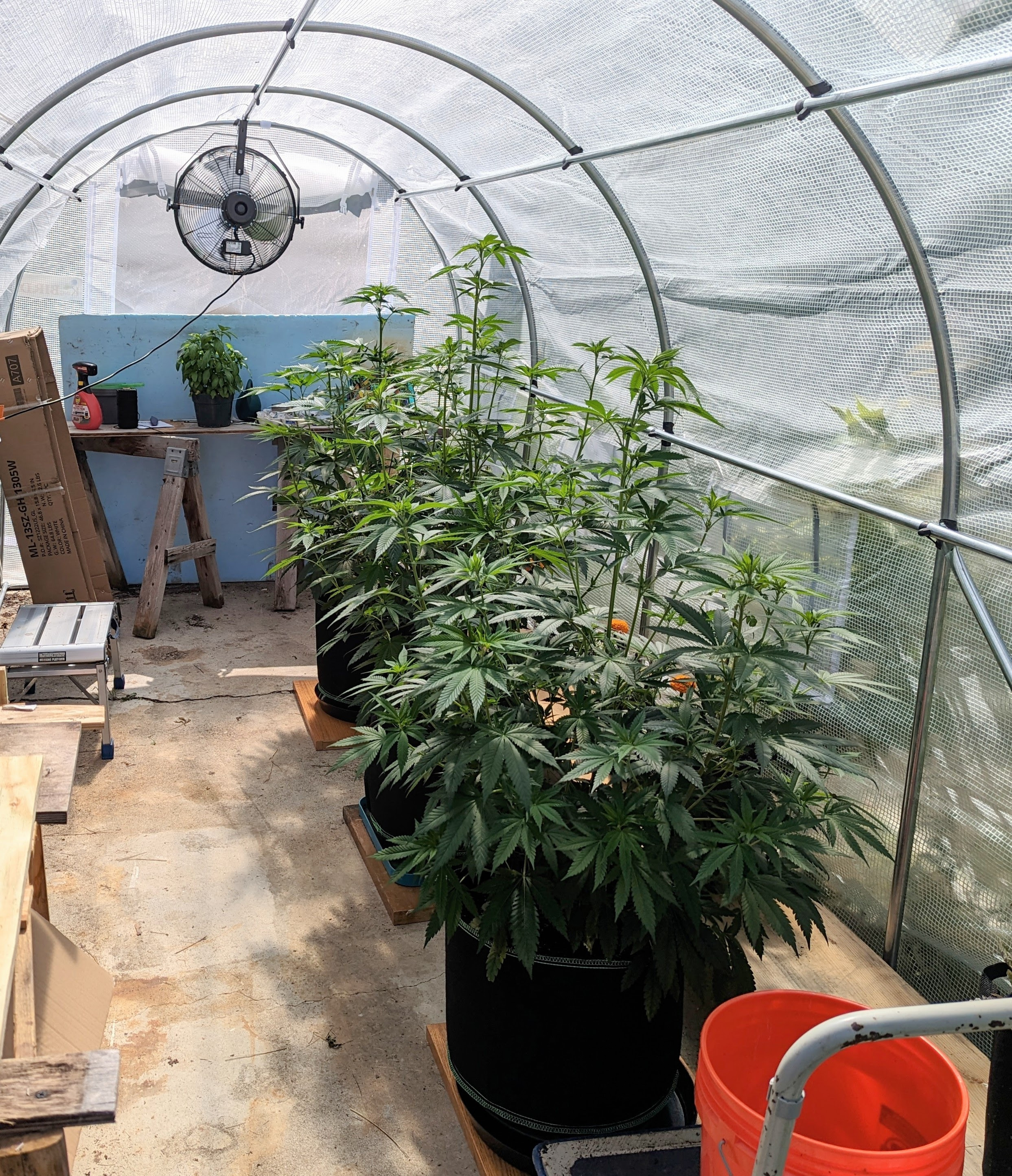 Two weeks down. Eight to ten weeks to go. It's a lot of work keeping up with the watering but the big one grew more than an inch overnight so I guess they're using it. I trimmed all the small stuff underneath yesterday including some branches that were too late to the party. The big girl was 34" tall ​​​​when I brought them outside. Now it's 49" after 13 days so that inch/day has been the rule lately. It's got almost another foot of room before I have to insist that it stop. Branches don't need support yet. Hope the do when they are fat with bud. I've got my sticks ready.