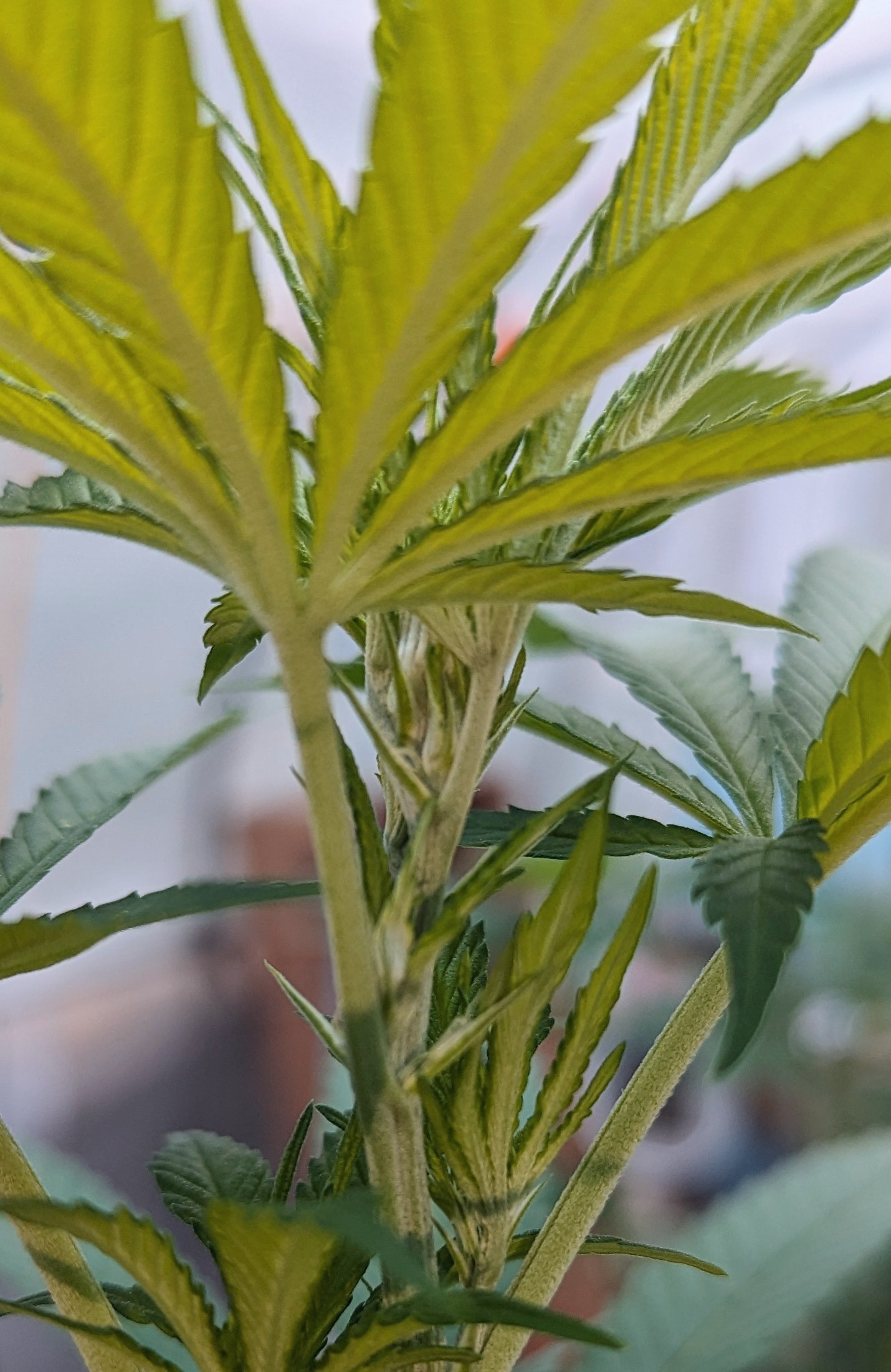 Here is one of my photoperiod plants, already took a few buds as they were in the window and wet weather moving in. I was afraid of reveg until the days started growing shorter, another week or 3 and I'll take more buds leaving the undergrowth to expand. My fear is bud rot with the hot wet weather coming now. I have one other that is also flowering and 3 that show only preflowers. This is Berryfreak x Santa Marta Colombian Gold, I have no idea as to why she is flowering early. I'll take the staggered harvest!1 Photo