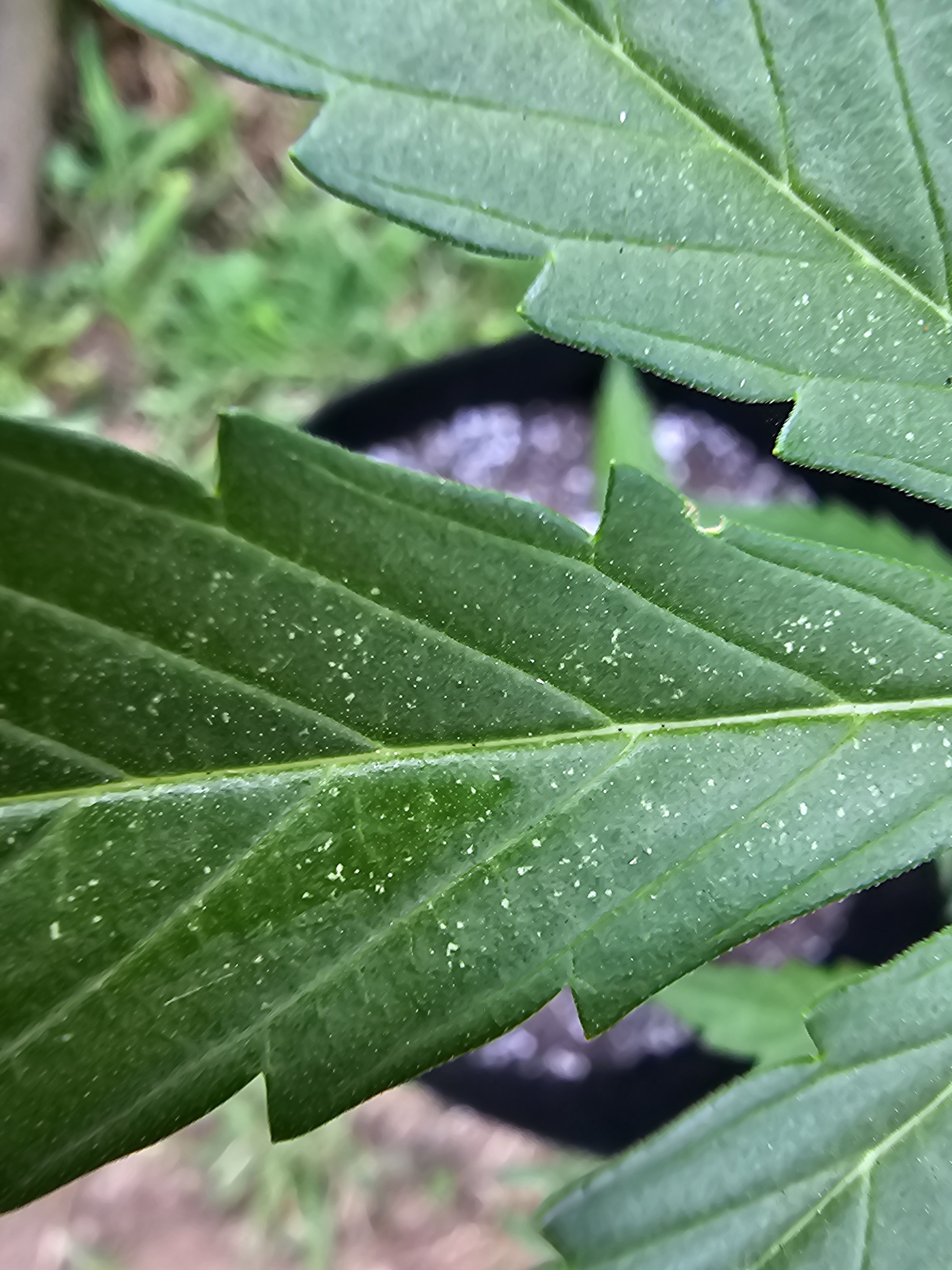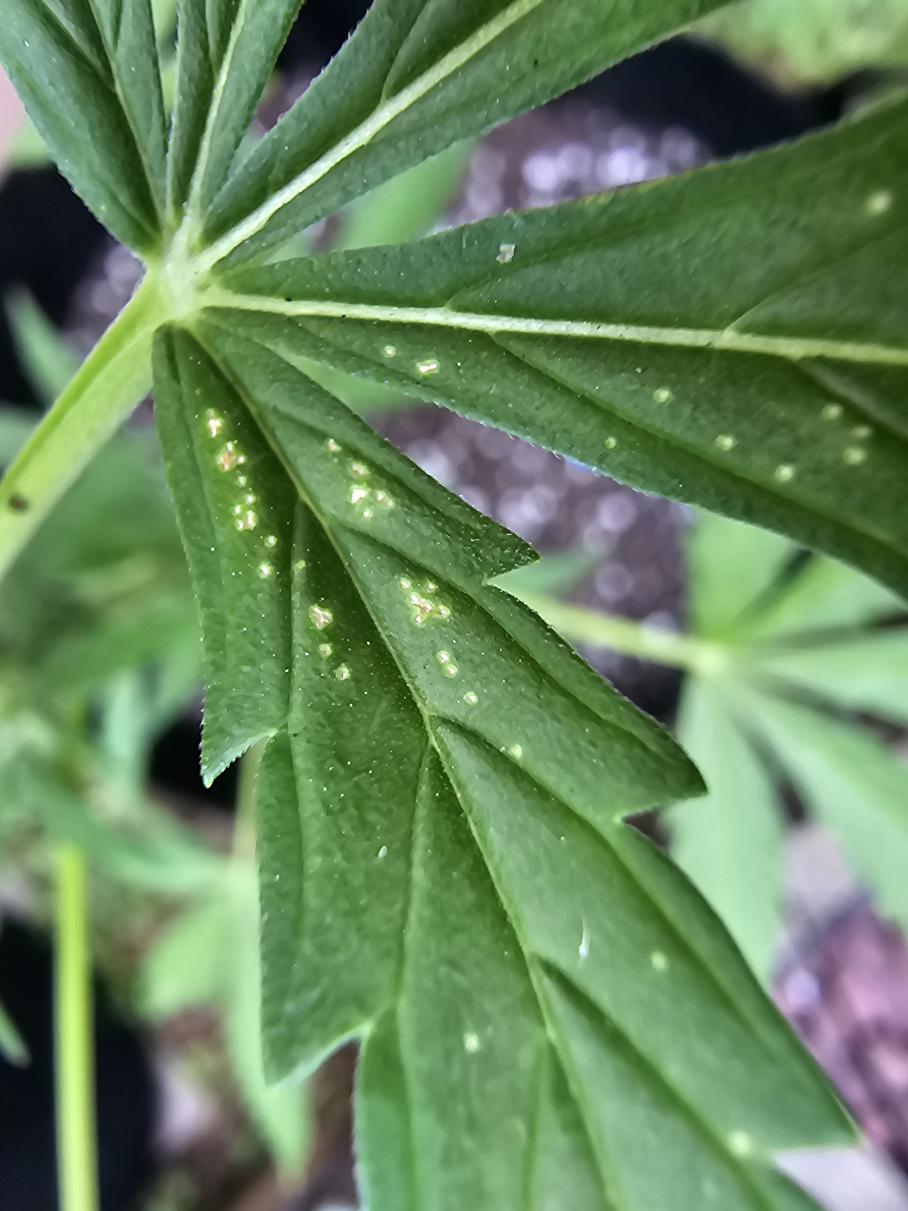 Woke up this morning and saw these little yellow spots forming on the upper leaves. This is an outdoor grow but they are moved under shelter when it rains. It's only on a few leaves. We just had over a week and a half of rainy, super hot and humid days and their soil was wet/moist for longer than usual due to the weather. I've been searching forums but have found multiple different causes and am trying to pinpoint what to do. Any help is greatly appreciated. New grower here.