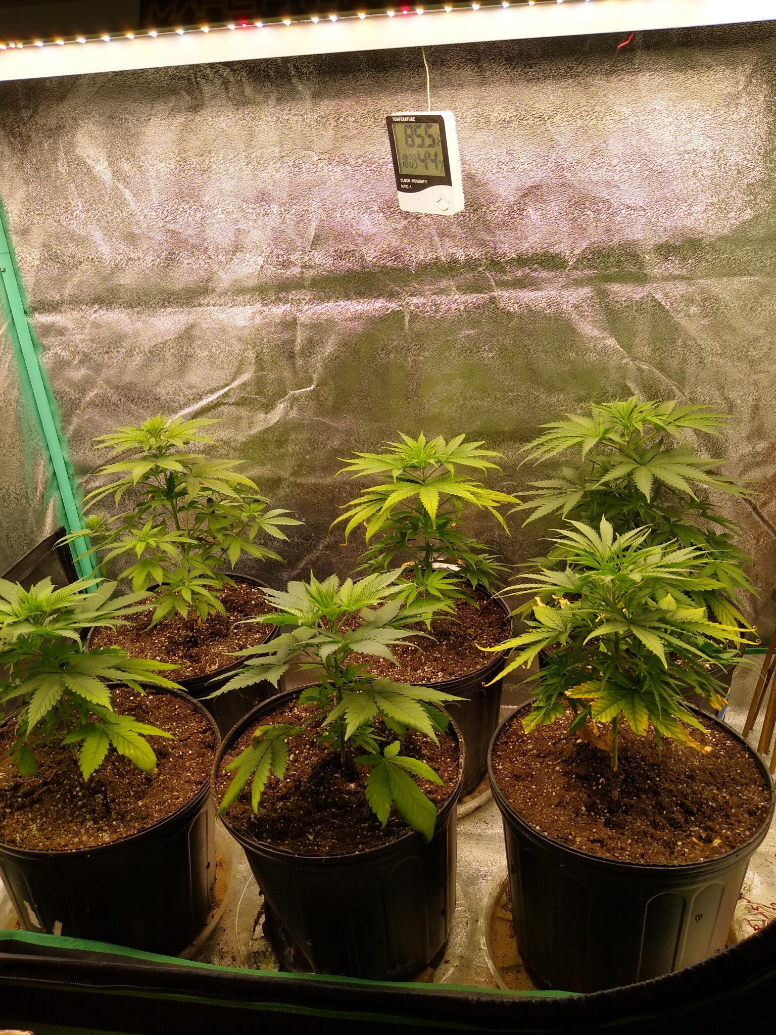 They are definitely behind schedule but can be sorted before flip for sureFlower Room: 11' x 7' x 7.5'H, 480w AC, 13gal/day dehumidifier, 1.5gal ultrasonic humidifier, 60gal (27gal usable) nute tank, 16" pedestal fan & 18" wall fan. Lighting and climate automated. Hand watering.