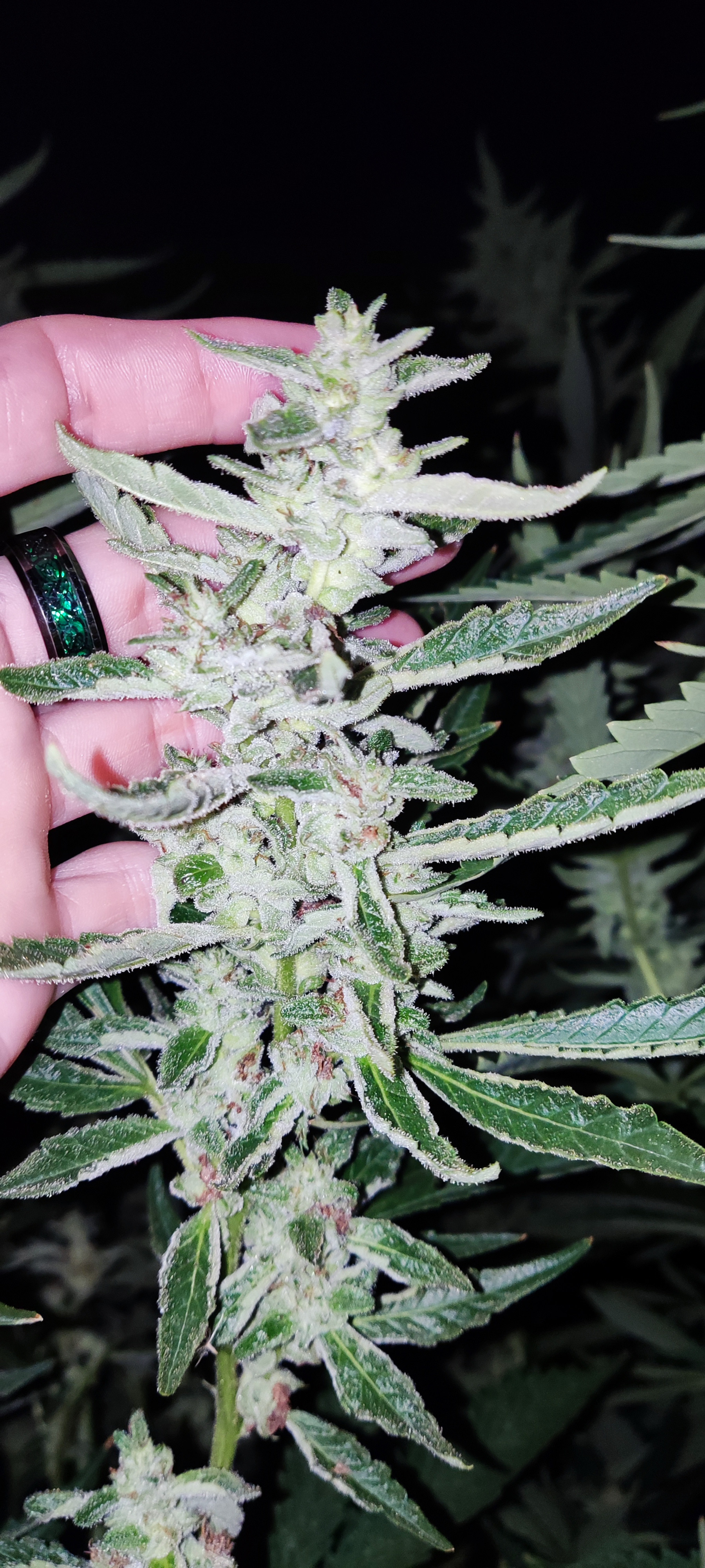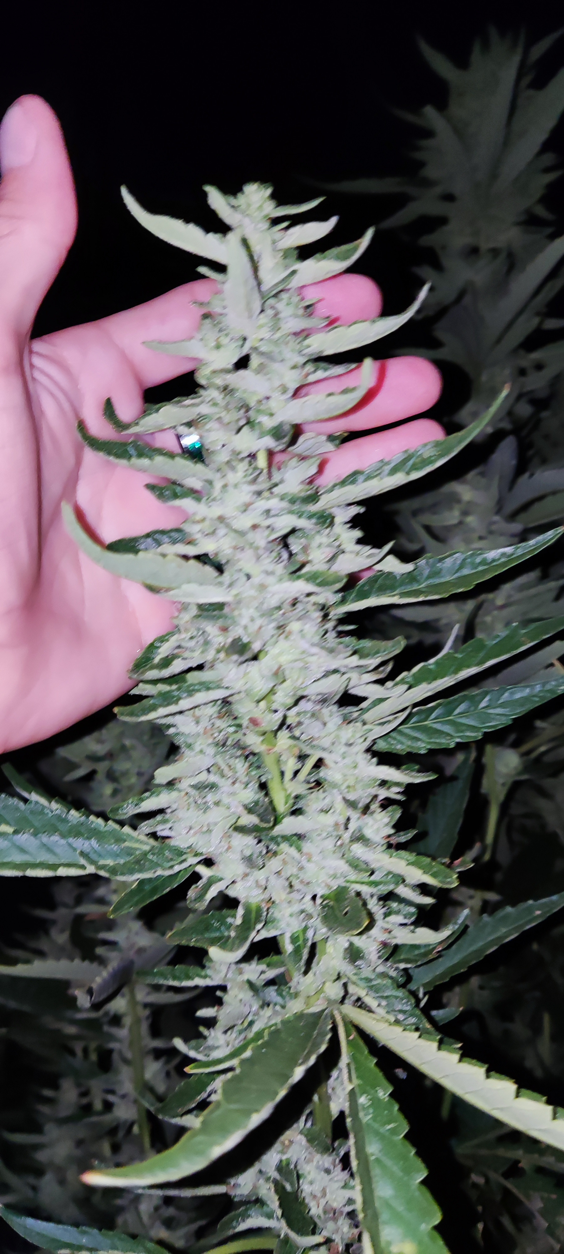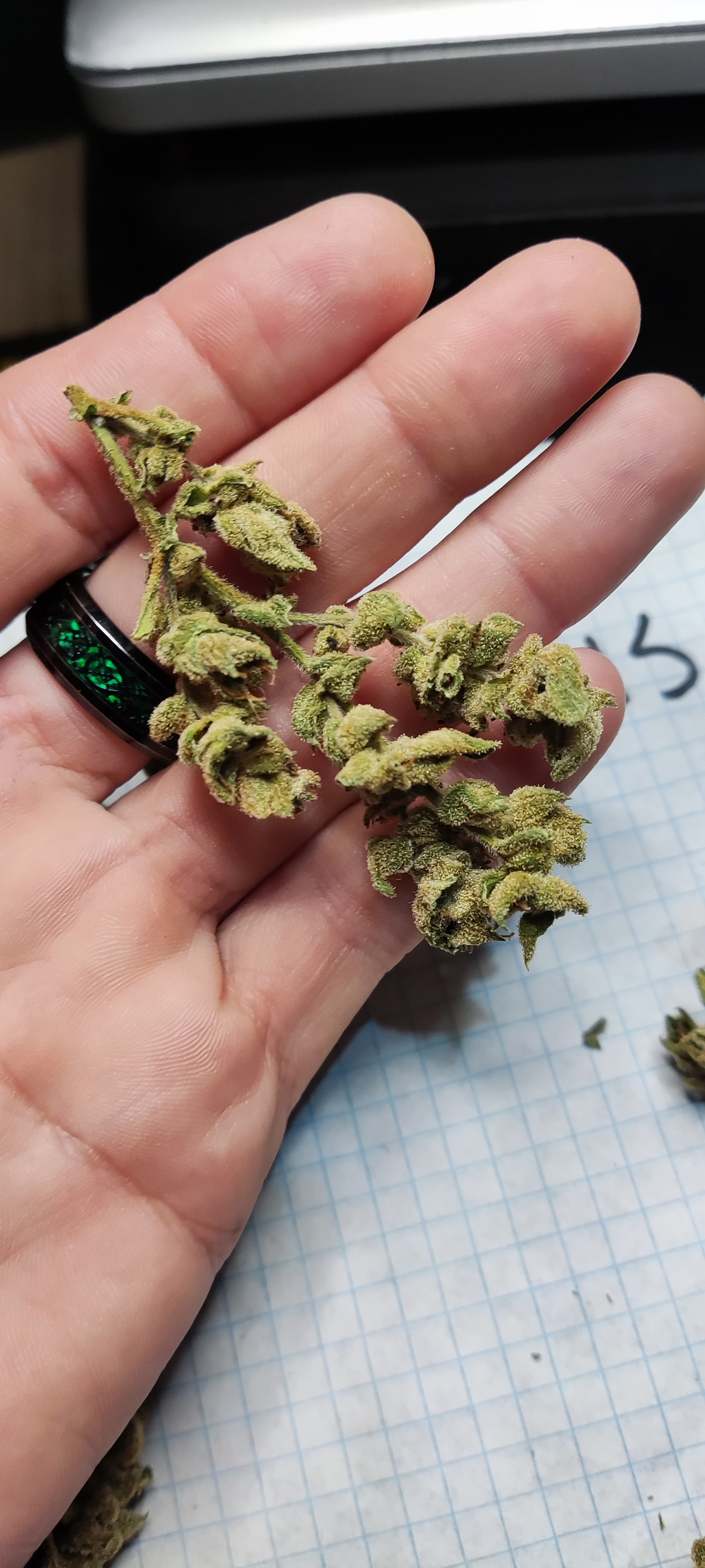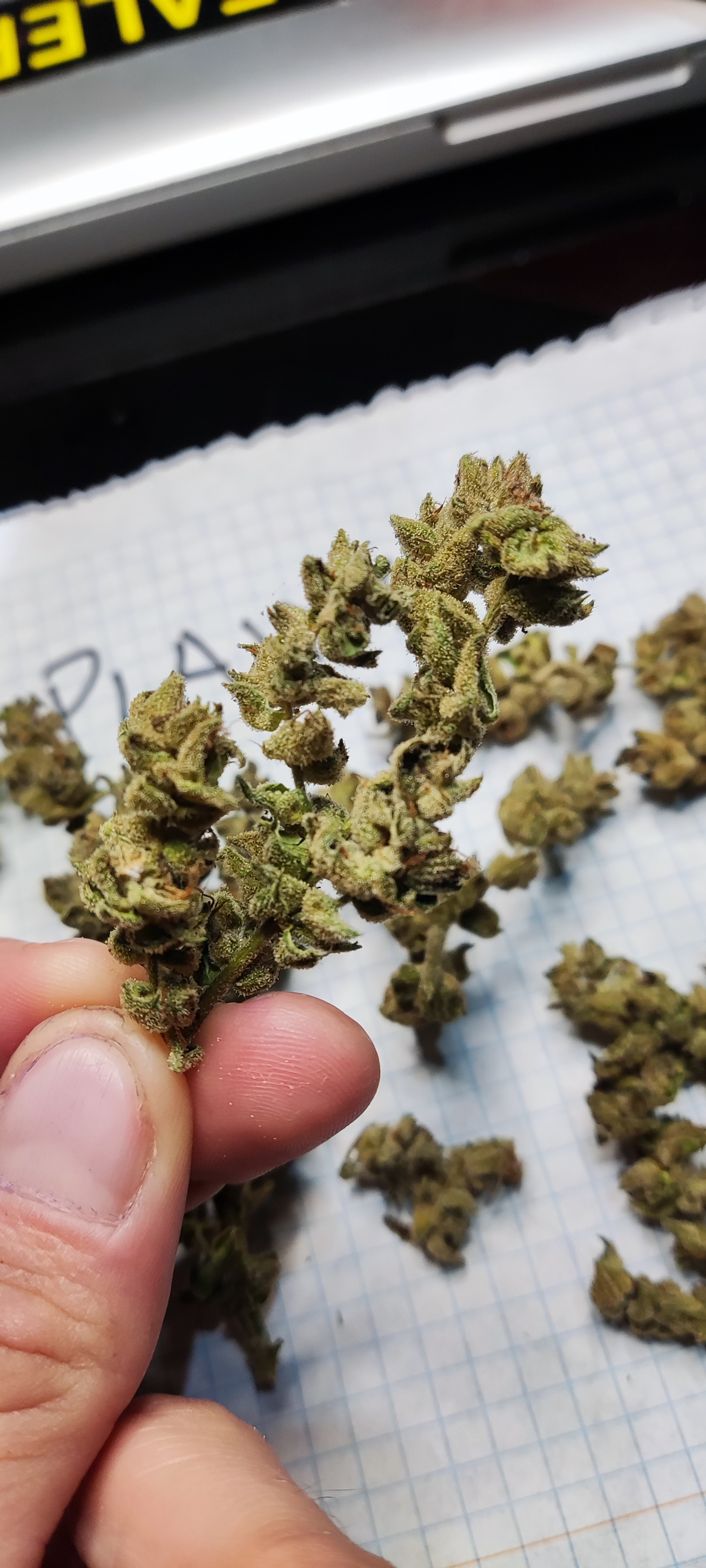 I just took some picture of s couple of strain that got too stretched due to what I'm explaining. The calyxes are hard and meaty. Swollen but sparse. I out your handle of the piece of paper so you know I just took them. Normally buth these strains are very dense but this was the hottest summer I've ever grown in and it shows