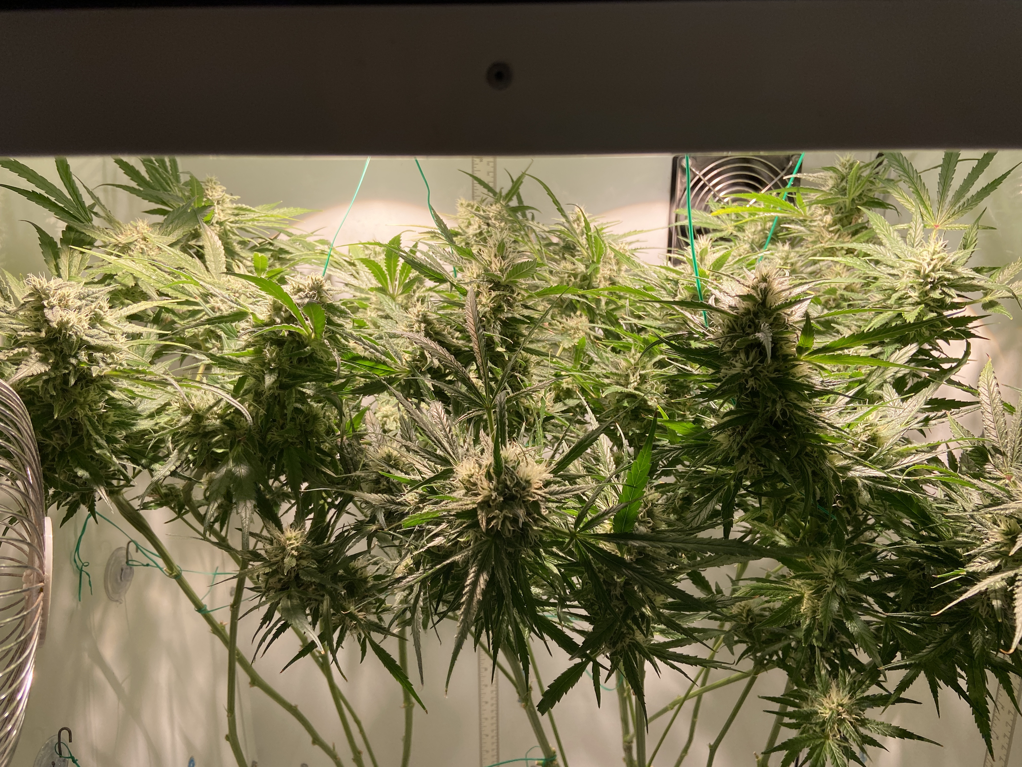 This is what the end of flower looks like for me: everything stretched horizontally under the light. No larfy bud. Not the largest harvest I could get, but all the bud is top shelf quality. Just so you can see what I do with my growing conditions.