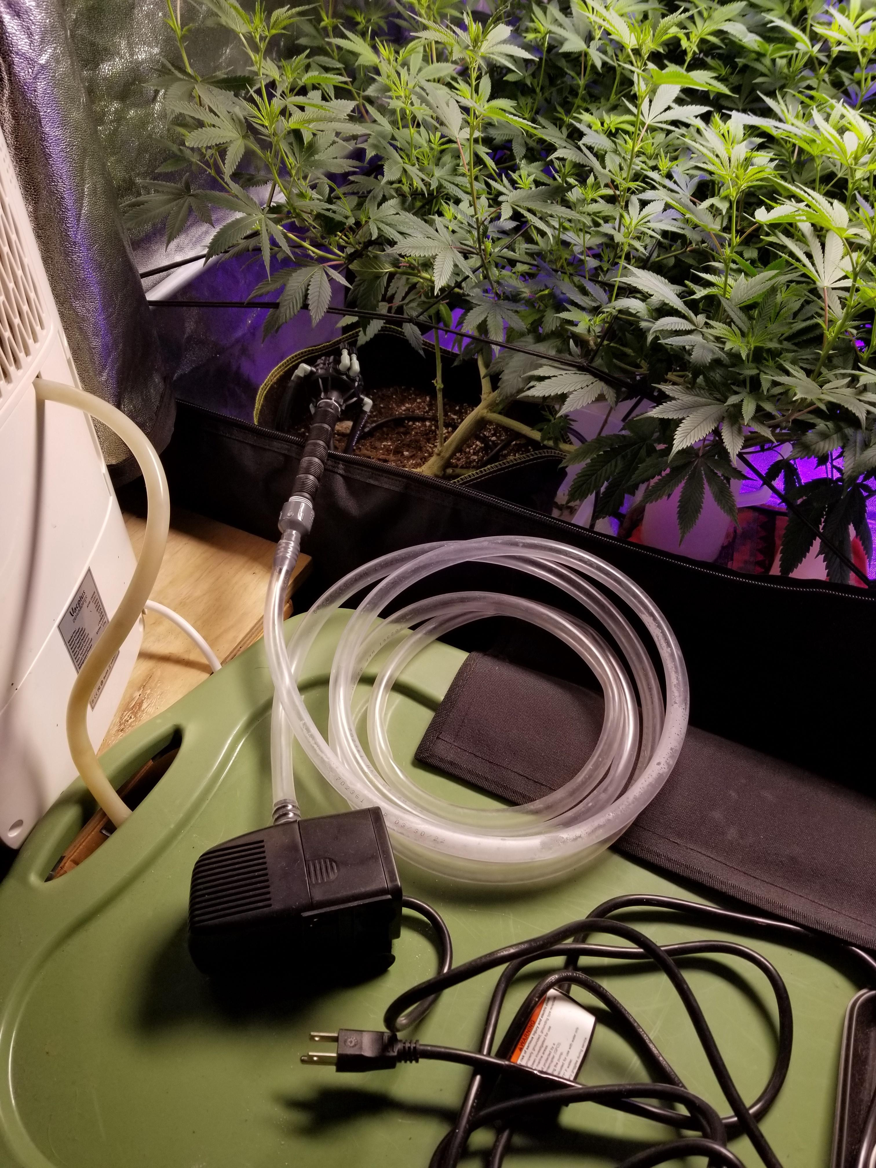 I DIYed my own irrigation system and left for 6 weeks. This was at the end of week 2 of flip. My dehumidifier drains into my reservoir so I don't need to top it off much. I made watering rings out of the 1/4" drip feed line but I'm going to replace those with watering plates from Floraflex. It's super easy to make. All you need is a reservoir, a pond pump, a timer, a 6 or 8 port drip distribution head and a roll of 1,4" drip feed line. 6" riser to mount the distro head and a 1/2" barbed adapter to connect the pump to the distro head.