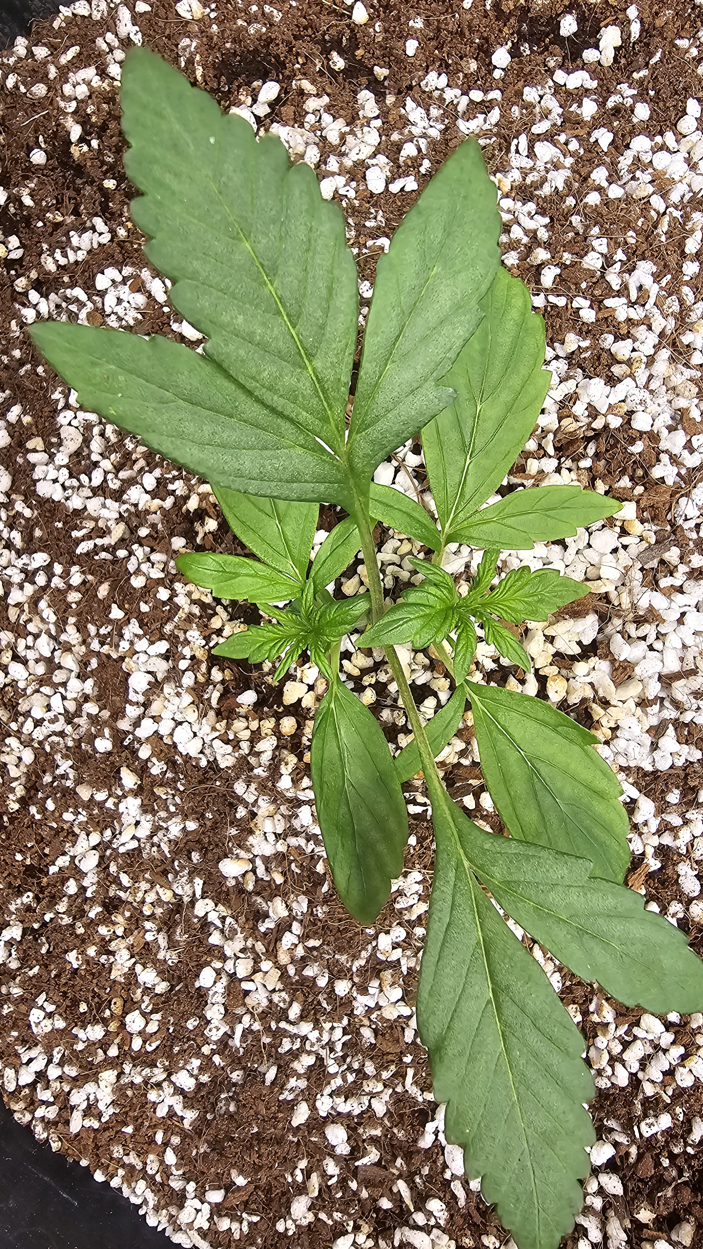 One of these 4 is the Orange Zkittles x photo but all 4 actually look identical, all getting that dark bluish tinge on 4th node. Bottom leaves have very fat fingers, maybe 2" across. No signs of problems, but they appear close to their healthy limit. Wound the light back a tad last night as the very tips of the leaf serrations were showing the slightest of up lift/curl and very minor start to clamming/taco.