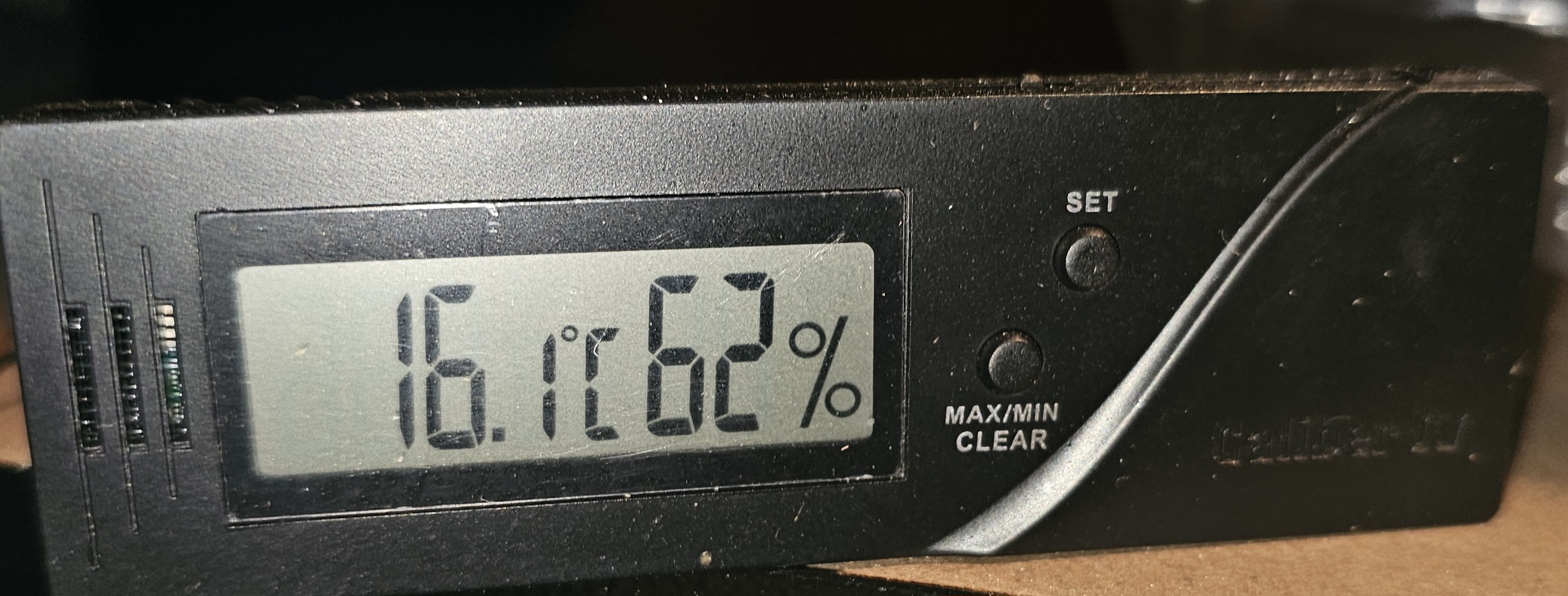 Day 5, 4 & 3 of the dry. Started nice and slow at around 60/60 or 16⁰C 60%RH. Today temps had dropped and a rise in humidity to 14.5⁰C & 62%RH so a nice slow start but getting a bit too high with risk of mold now so bringing humidity down another 5% and temps will rise a little bit now over the next day or two. I have done two jar tests and still quite some way to go before jarring.....nice and slow with as stable as I can temps & humidity.