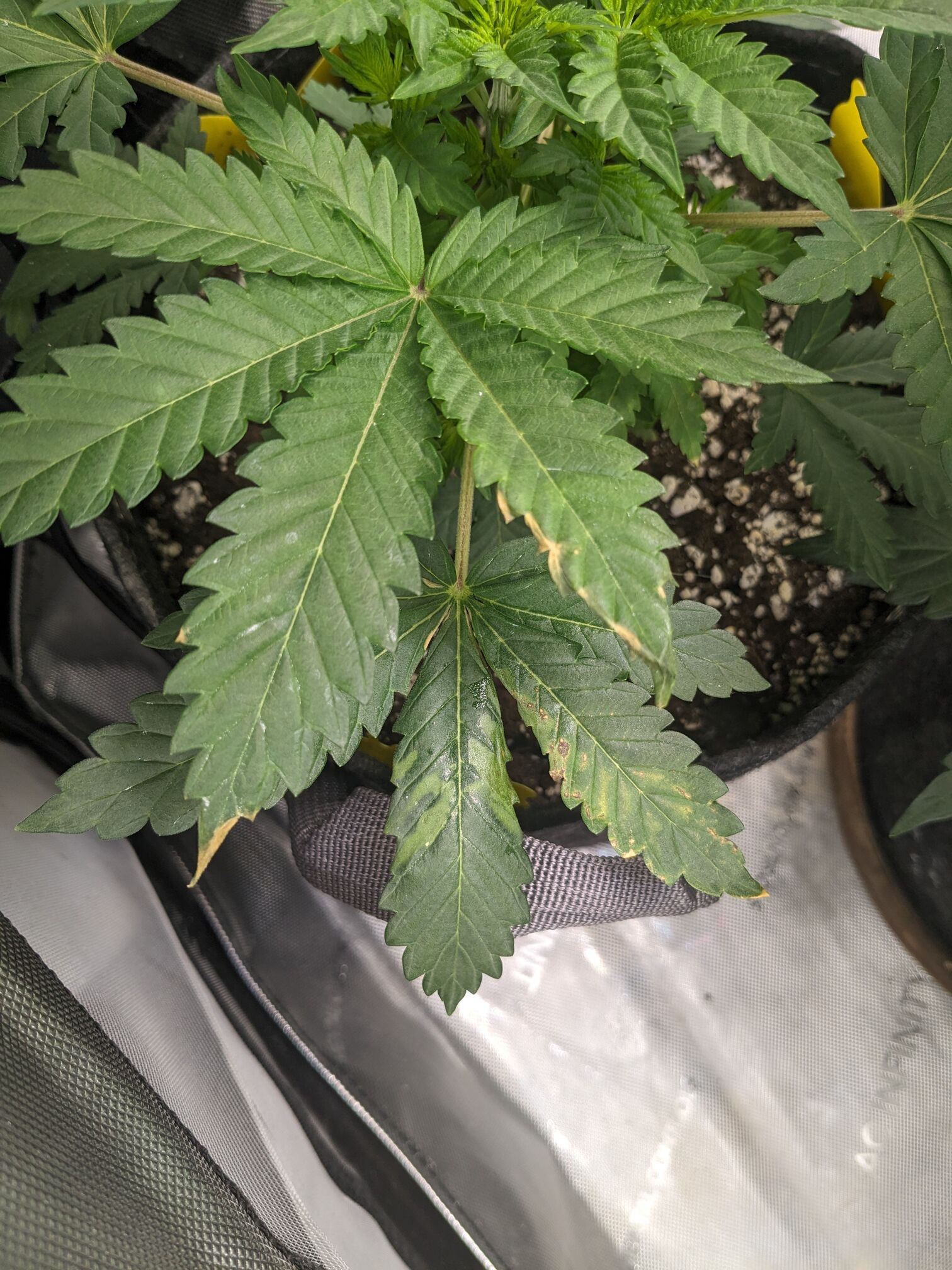 edit:day 26, 14. watered old plant 1.5L with same ratios as above but a bit of bloom mix. transplanted new plant. got yellow from last watering. seemed root bound. added maybe 5 handfuls of perlite to the 3 gallon mix