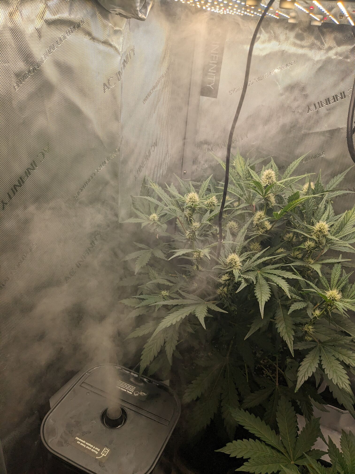 Flower Room: 11' x 7' x 7.5'H, 480w AC, 13gal/day dehumidifier, 1.5gal ultrasonic humidifier, 60gal (27gal usable) nute tank, 16" pedestal fan & 18" wall fan. Lighting and climate automated. Hand watering.