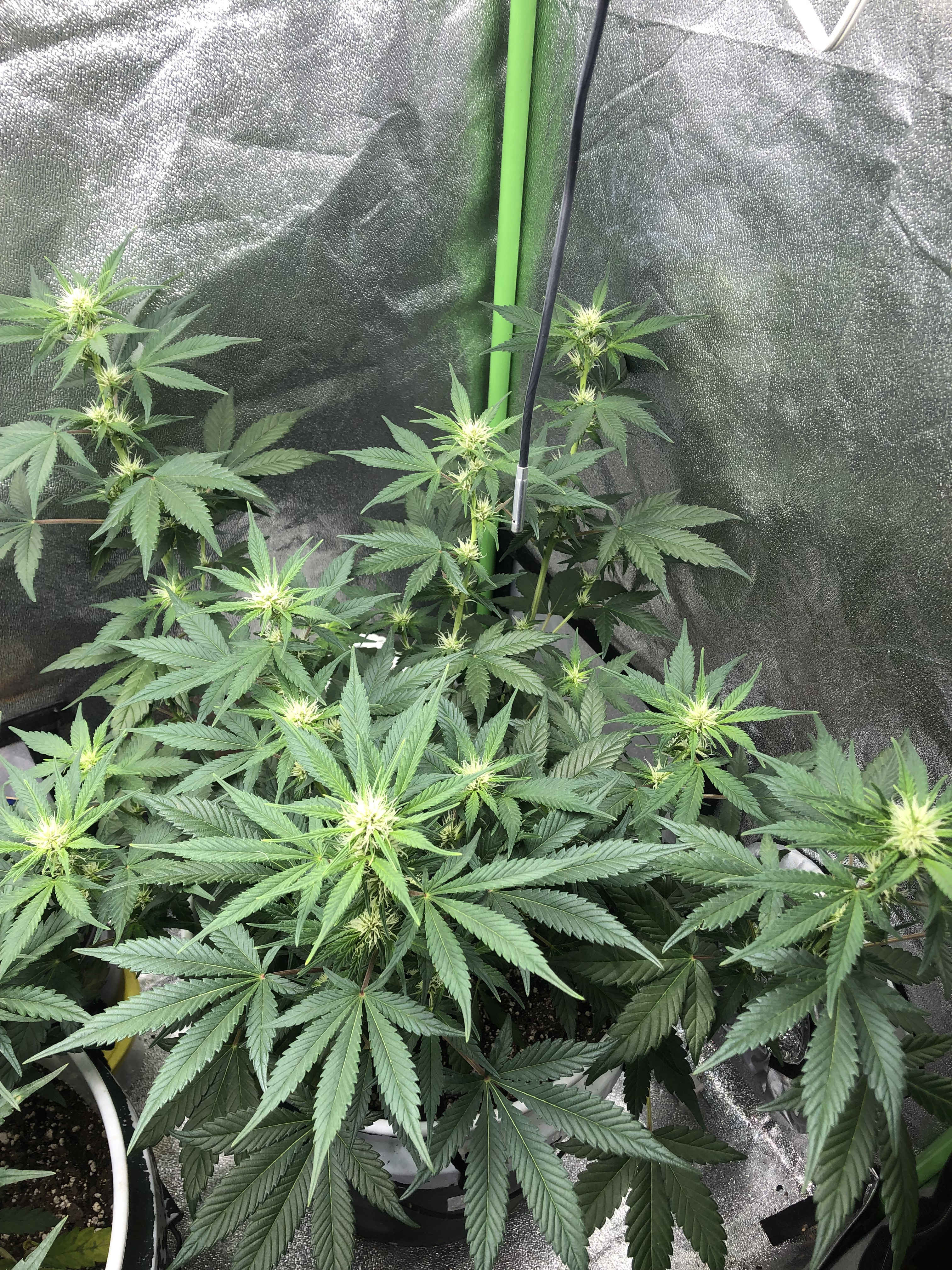 Grape ice cream is still having issues assuming they stem from ph. I’ve removed a few dead leaves and moved the light up. She is more sensitive to the light and ph no doubt. All that said she’ll make it to harvest and is frosting up quite nicely. Their tent mates are doing well. DeezNuggs is short and stocky, looking healthy, and just starting to stretch out. Bare Assed Monkey is less droopy, I added a lst clip higher up and she will yield a little something at the end.