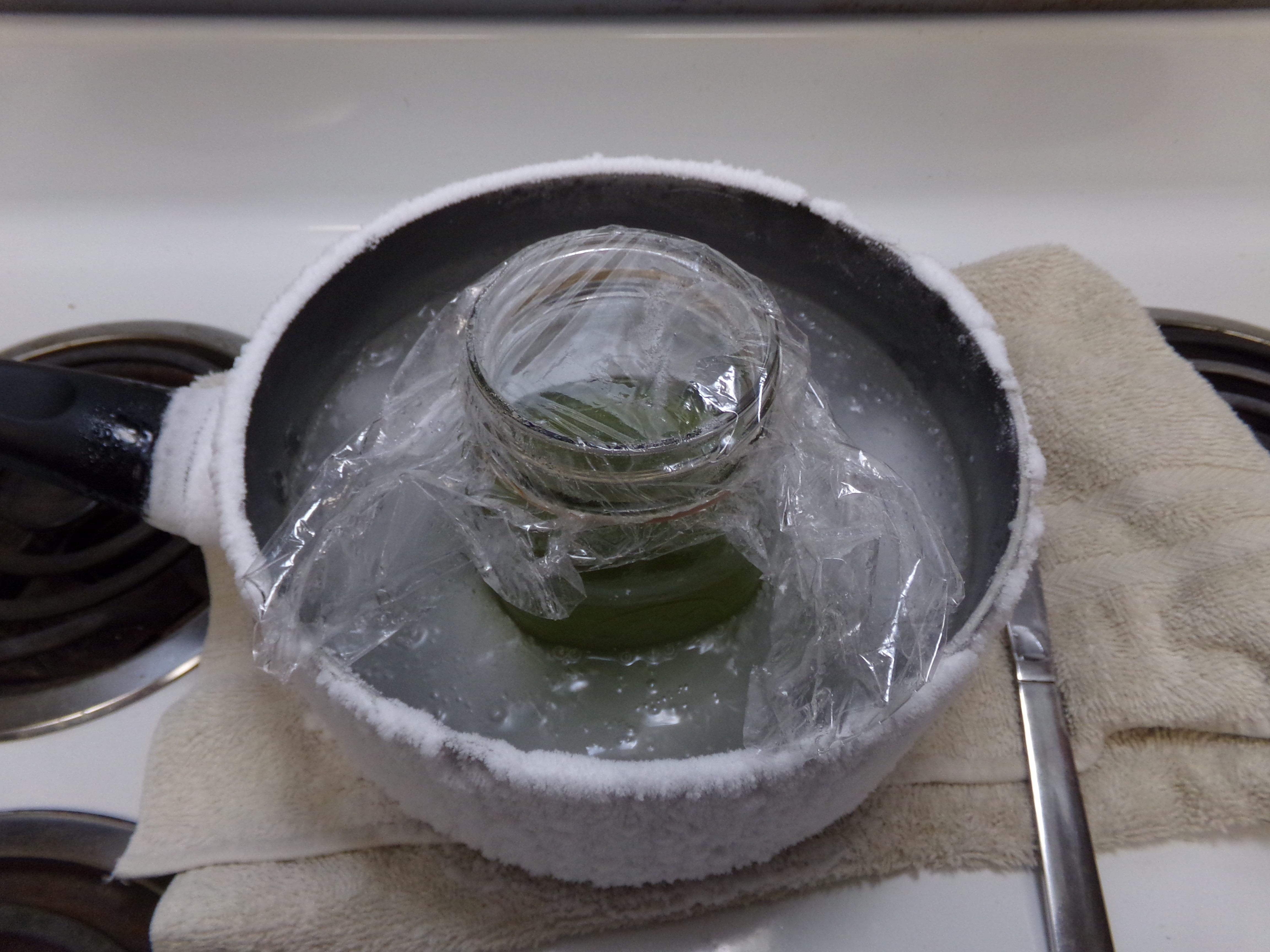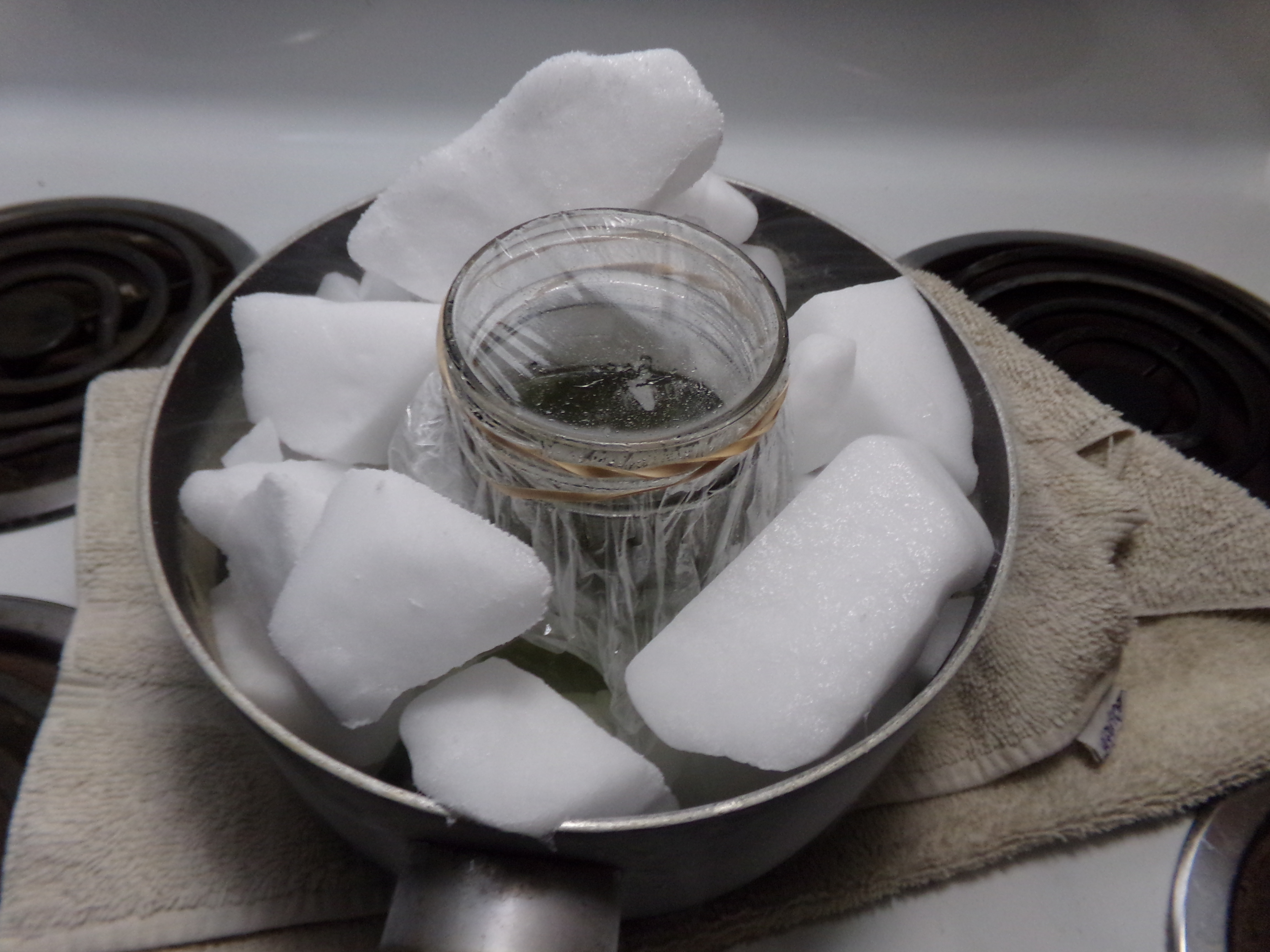 Broken up chunks of DI in this situation only touched the jar in places. To evenly disperse the temperature, I filled the pot with isopropyl. If Google isn't lying (as if Google would lie) the DI/ISO temperature is -109°F. A foil or other material wouldn't have gotten me that cold.
