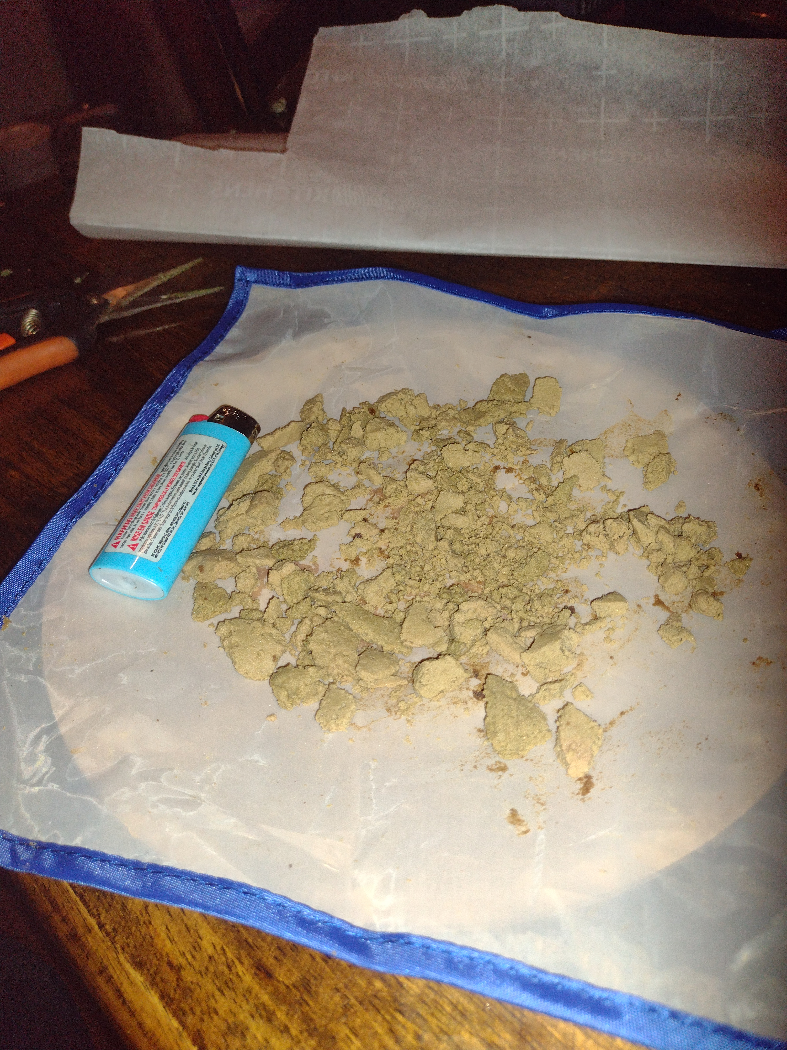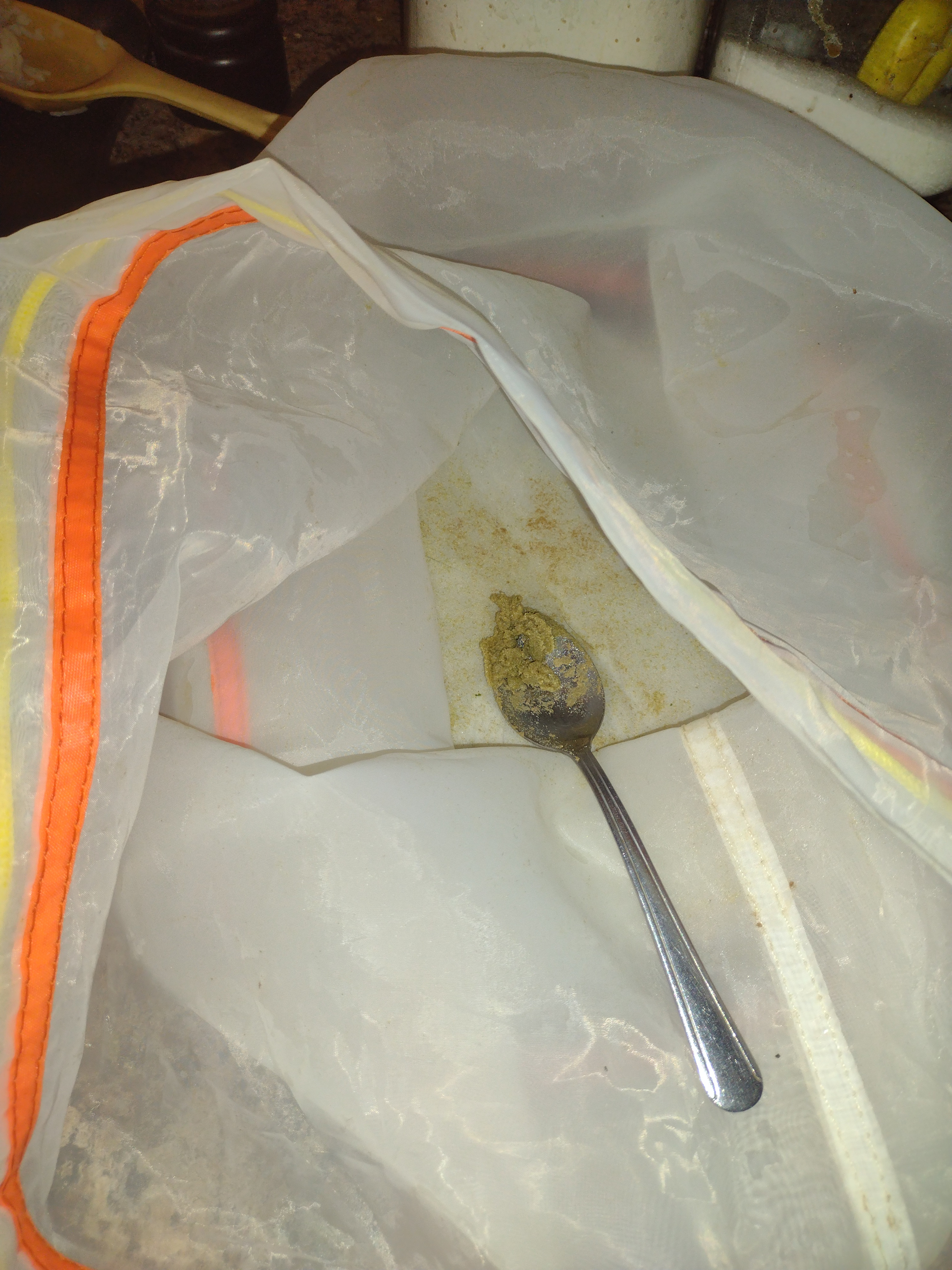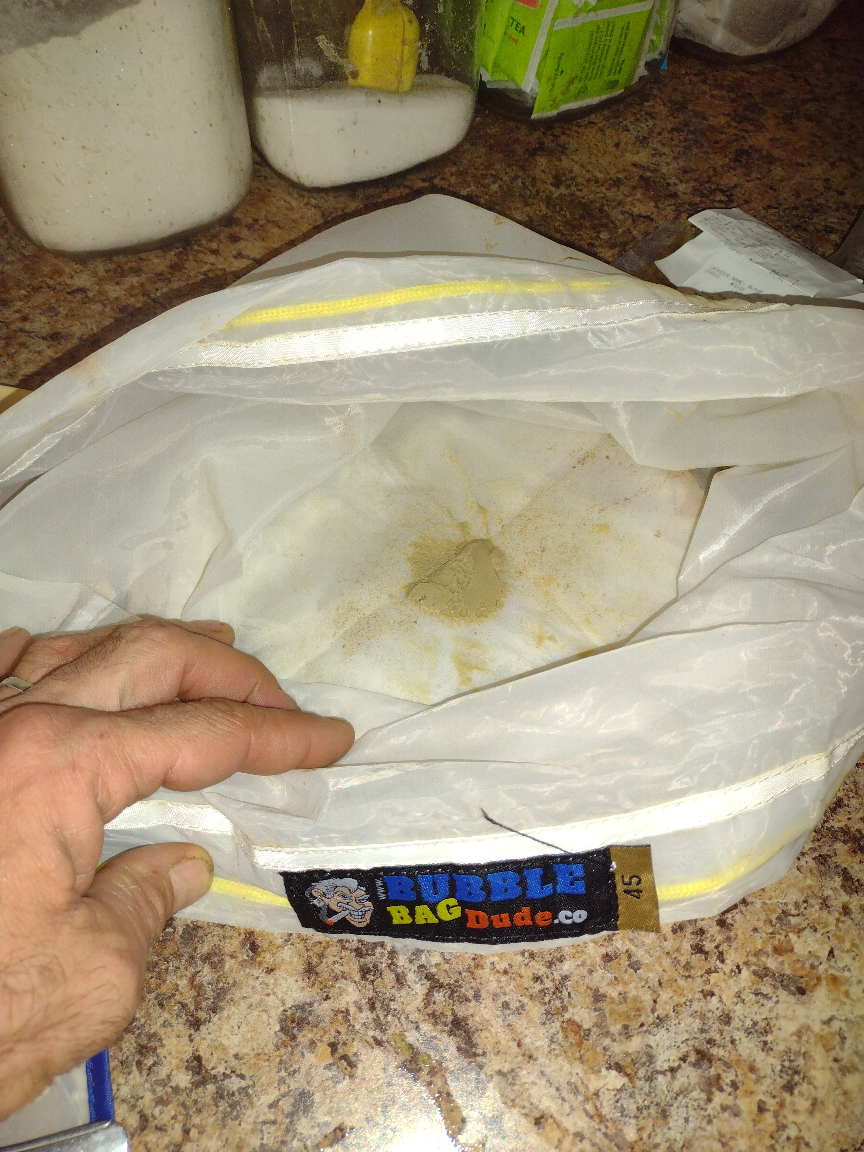 Thats about what I have under the desk drying...Just went and rounded up 1/2 " coupling, JB weld and two nickels to be epoxied to a bolt so the kief can be heated and pressed in to a little couple gram puck.... I used snow this time and outside in the cold to process and it is really blond, unlike in the past with bag ice the kief is really dark...Nice Man