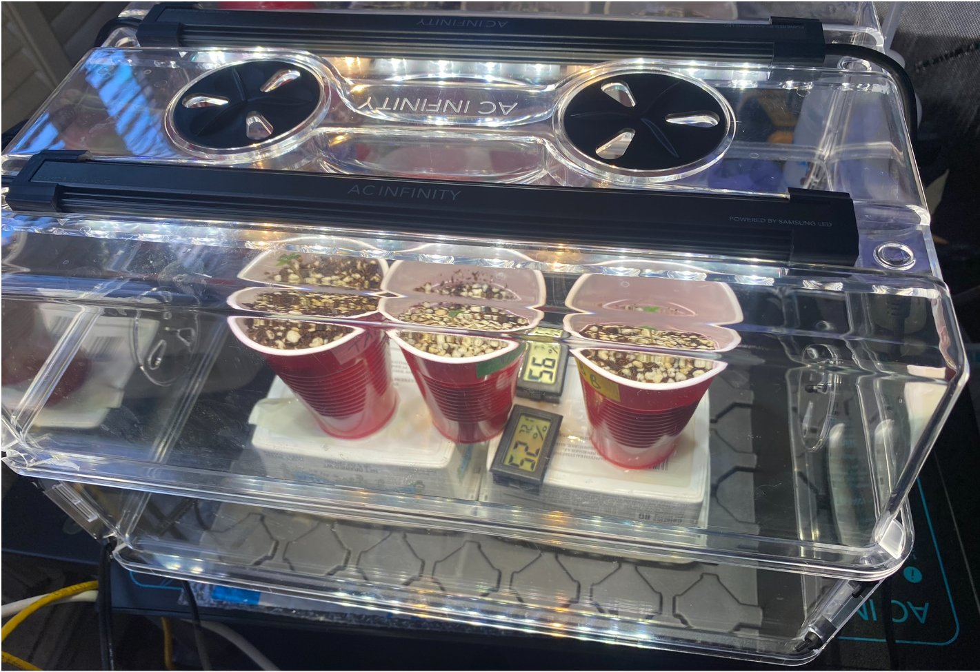 I have these seedlings in an AC Infinity propagation system with humidity dome with attached LED lights. Their brochure says to have the lights set on setting "1" for seedlings, with the lights a maximum of 1 inch from the canopy. But because I am using Jiffy Cups, I am using an extension that raises the dome and the lights by 4 inches, so the lights were about 5" from the canopy. Therefore, I turned up the lights to setting 5 since yesterday.